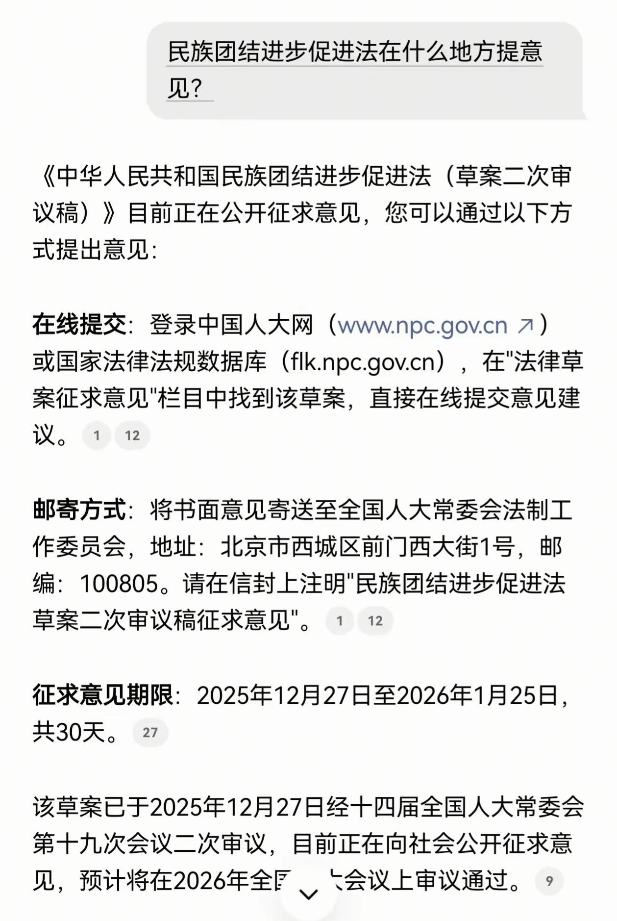 民族团结进步草案已经开始征集意见了, 看了时间截止到2026年1月25日, 如果有什么意见,什么建议的都可以去提,人民群众的力量是最关键重要的,人民主动参与到建设中才能集思广益,真正做主人!做自己家的主人!