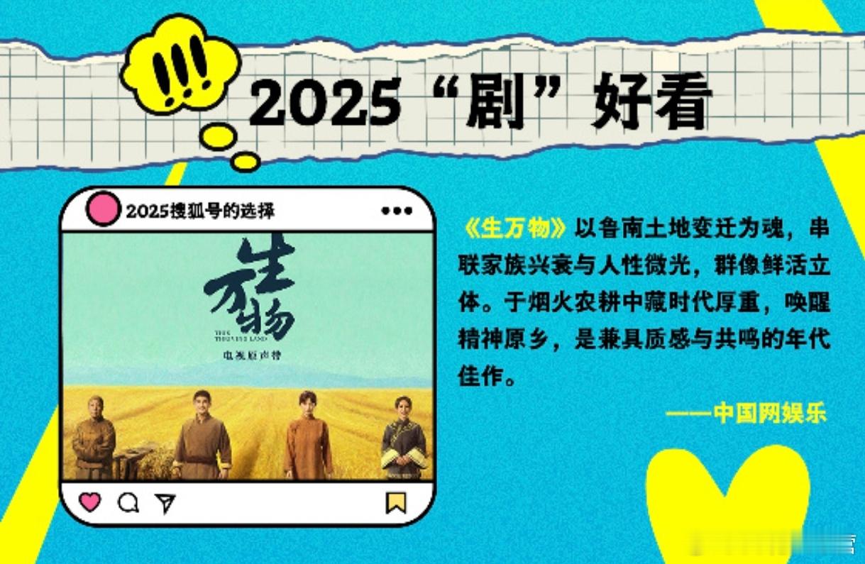 2025娱乐搜狐号的选择发布——2025你最争气TOP1:杨幂2025“剧”好看TOP1:《生万物》2025年,杨幂以破局之姿重塑自我。杨幂在《生万物》中的表演自然灵动,播出后一扫之前的种种争议,实现了戏路与口碑的华丽转身,让观众见识了作为演员杨幂的深厚潜力和无限可能。《生万物》以鲁南土地变迁为魂,串联家族兴衰与人性微光,群像鲜活立体。于烟火农耕中藏时代厚重,唤醒精神原乡,是兼具质感与共鸣的年代佳作。2025娱乐搜狐号的选择