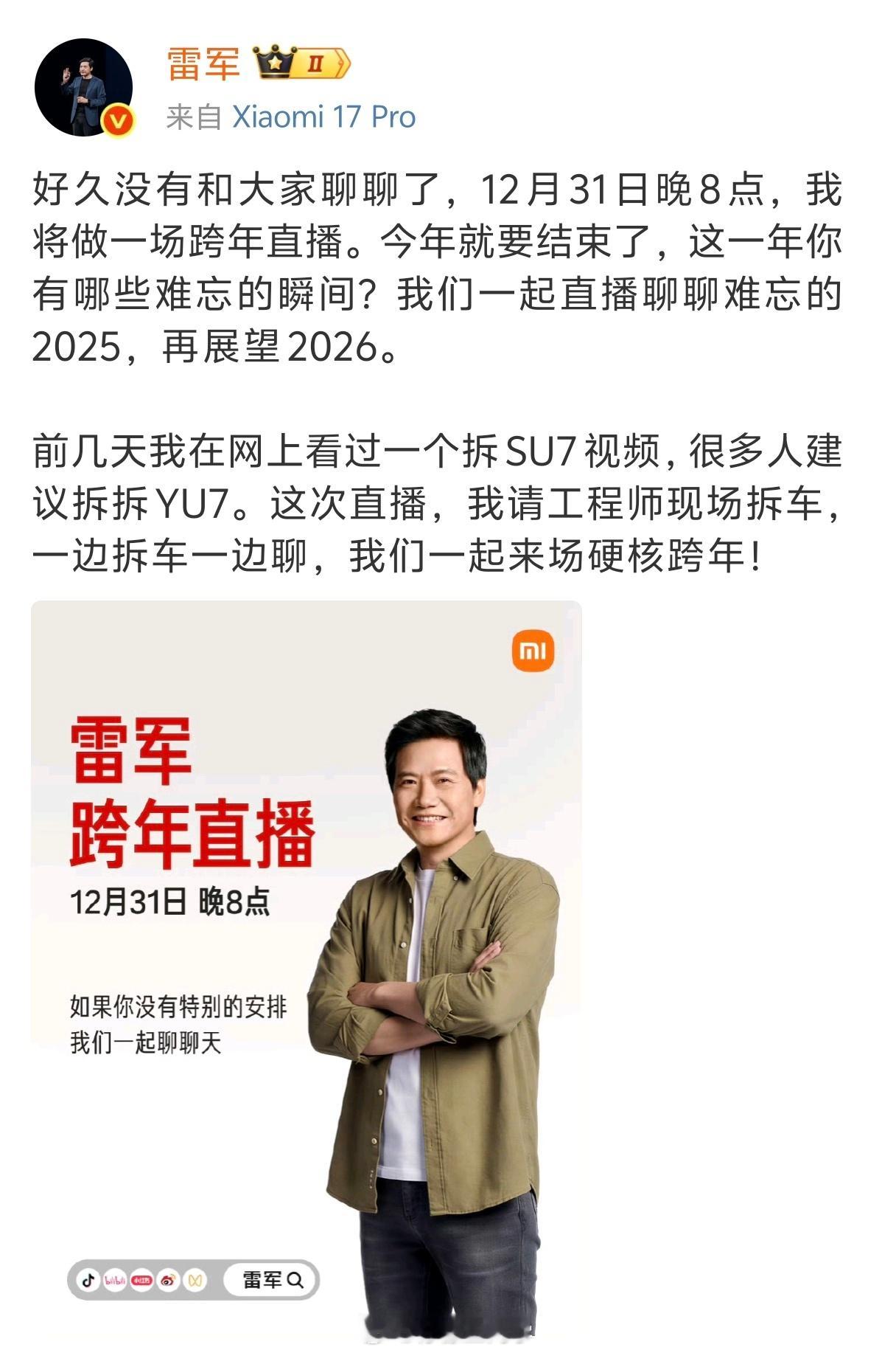 雷总会玩,跨年夜不仅要直播,还要边拆车边直播,之前不知道晚会看什么,不如今年就看这场“拆车晚会”,直播间现场拆,现场提问,现场解答雷军跨年直播拆车之前易车拆了,老章拆了,5号车库也拆了,都说小米汽车好,但是还有人质疑,只能雷总亲自直播,用“最笨”的方式回应质疑,带着大家再拆一遍之前小米去跑纽北,大家都去跑,小米去做24小时耐力测试,大家都去做,现在又开始直播拆车,下一家跟进的是谁?