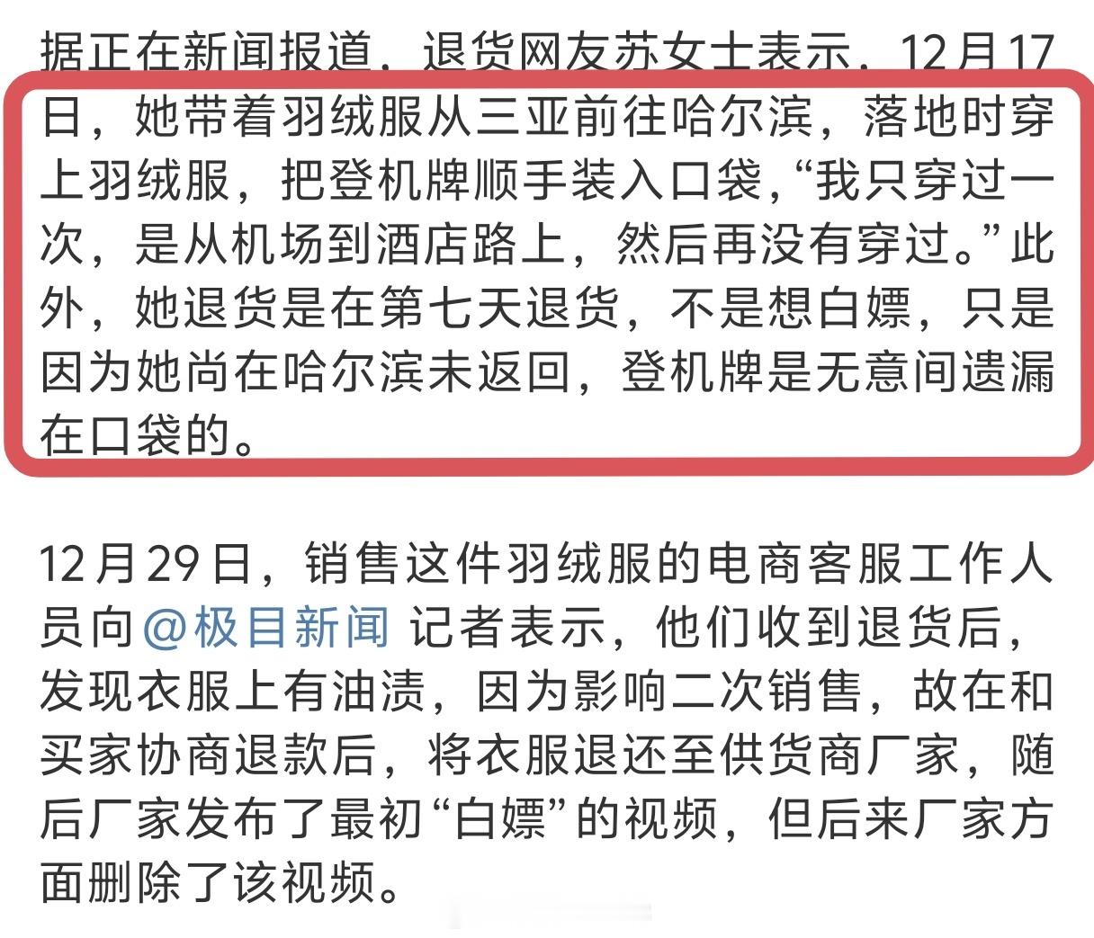 退货羽绒服兜里有机票买家否认白嫖你是说,衣服只穿了一小段路,还不小心把登机牌放口袋了,而且还沾染油渍了,又恰好在第7天退货了…你信他,还是信我是秦始皇?