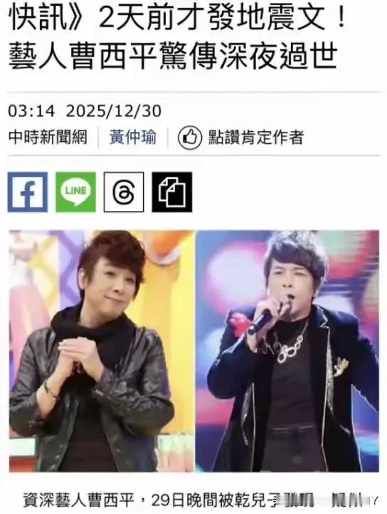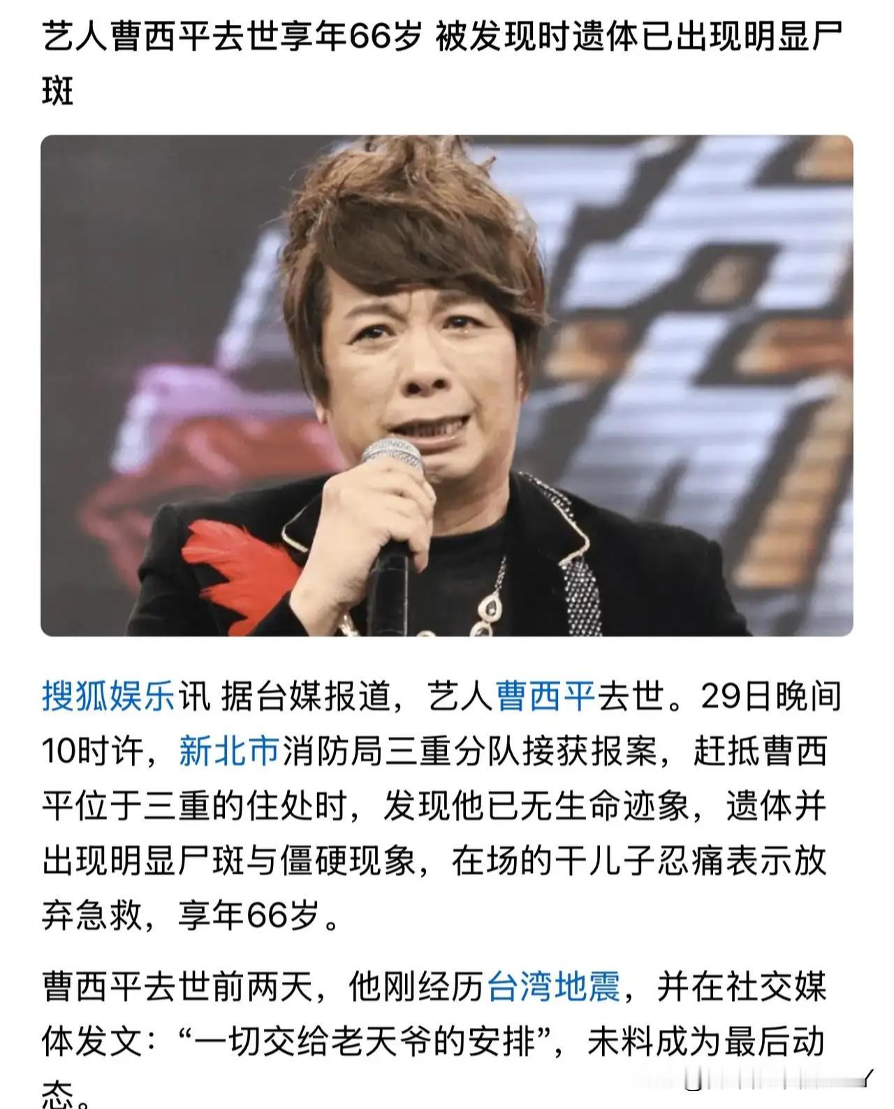 无父母、无妻、无子女、六亲少靠的曹西平于家中孤独离世,终年66岁!干儿子联系不上报警,不久前台地震他还曾发文“一切交给老天爷安排”。 不久前台地震,他还在网上写“一切交给老天爷安排”。现在看来,这话竟成了对自己最后的交代。1959年出生的他,原该走条安稳路。 家里是医生世家,兄弟五个,他排老四,三个哥哥一个弟弟全成了大夫。偏偏他拐了个弯,成了歌手,踏上演艺圈的路。 《康熙来了》里的他,曾是个傲娇的存在。镜头前爱逞口舌之快,脾气像点着的鞭炮,噼里啪啦的,却也凭这股子直爽火过一阵。观众记得他的毒舌,也记得他偶尔流露的真性情。 可世事难料,后来参加《火星情报局》翻了车,他就彻底退出了综艺圈。自己开了家小饰品店,守着方寸天地讨生活。不再有聚光灯,日子过得像褪色的旧照片,平淡,甚至有些冷清。 他不是没对人好过,父亲生病时,兄弟几个里数他付出多。跑前跑后求医问药,把多年攒下的积蓄花了不少。可人心这东西,有时候捂不热。后来那些辛苦攒下的钱,竟被亲兄弟拐走了。 这一刀,怕是比退出娱乐圈更疼。身边曾有个陪了多年的小助理,算是灰暗日子里的一点光。可没成想,助理也病逝了。最后这点暖意,也被老天爷收了回去。 有人见过他网上晒的年夜饭,就一个便当。配文说“寂寞这东西,对我来说早就没感觉了”。话里的淡然,藏着多少个独自熬过的夜晚?或许不是不寂寞,是寂寞到了极致,反倒说不出口了。 刘真、大S、菜头、罗姐、汪建民……《康熙来了》的老熟人,一个接一个离开了。现在轮到曹西平,像是一场漫长的告别,把一代人的记忆一点点抽走。 当年在节目里插科打诨的热闹,如今只剩故人远去的冷清。他这一生,像棵长在石缝里的树。没靠着大树的荫蔽,自己挣扎着往上长,却总被风雨打弯了腰。 医生世家的光环没沾到多少,演艺圈的浮浮沉沉倒尝了个遍。对家人掏心掏肺,却被最亲的人辜负;想抓住点温暖,身边的人却一个个离开。 有人说他脾气差,可谁又知道,那刺猬般的外壳下,藏着多少不安?在娱乐圈摸爬滚打,没点心气撑着,怕是早被吞得连渣都不剩。只是这心气,最终没能敌过晚年的孤独。 干儿子报警的时候,心里该有多慌?或许前几天还通着电话,听他念叨店里的生意,谁能想到再见面就是天人永隔。这世上最痛的,莫过于“子欲养而亲不待”,可对曹西平来说,连个能及时发现他离开的人,都得靠“报警”才行。 他曾把一切交给老天爷安排,老天爷却给了他这样一个结局。没在热闹中离去,没在亲人身边闭眼,就这么安安静静地,像一片落叶,悄无声息地飘落在自家地板上。 现在再想起他晒的那个便当,心里堵得慌。一个人吃饭,一个人看店,一个人应对生活的刁难。那些说不出口的寂寞,早就在日复一日的孤独里,熬成了习惯。可习惯了,不代表不难过。 《康熙来了》的片段还在网上流传,他在里面插科打诨,眼睛亮得很。那时候的他,大概想不到自己的晚年,会如此冷清。人生这趟车,有人上来,有人下去,他却好像一直一个人坐在靠窗的位置,看着风景来,看着风景走。 曹西平的故事,像面镜子。照出了热闹背后的冷清,照出了人情里的凉薄,也照出了孤独这东西,从来都不分贫富贵贱。 不管你曾有多红,不管你付出过多少,到最后,能让人记住的,或许只是那个晒着便当说“不寂寞”的背影,和那份藏在倔强里的,说不出口的孤单。 他走了,带着一身的故事,和没说出口的遗憾。愿那边没有孤独,能有热饭热菜,有说不完的话,不用再一个人扛着所有。毕竟,这一世的冷清,已经够了。