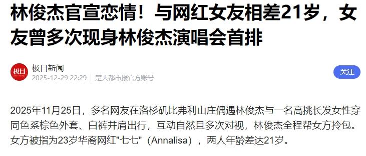 林俊杰官宣小21岁的网红女友我不惊讶,见过家长了我也不惊讶,但我惊讶的是,林俊杰的23岁女友网红77,她的来历居然很不简单。   很多人第一反应是惊讶于21岁的年龄差距,林俊杰44岁,七七才23岁,但仔细看他们的相处轨迹,这段感情其实早有铺垫,从2023年底经朋友介绍认识开始,两人就保持低调。   2024年七七频繁出现在林俊杰全球巡演的VIP首排座位,从新加坡到伦敦,再到东京场次,她不止是观众,还被拍到后台与他贴耳交谈。   那时候外界还只是猜测,但这些细节已经显示出关系的亲密程度,进入2025年,偶遇画面越来越多:年初新西兰同游,春季东京咖啡店并肩而坐,秋季洛杉矶街头穿同色系服装漫步。   七七毕业于纽约帕森斯设计学院,这所学校是全球顶尖的艺术与设计学府,培养出无数时尚界领军人物。   她的社交平台内容多围绕艺术创作、生活美学和装置展览分享,而不是单纯的颜值输出,这点和林俊杰的音乐创作追求高度契合,两人很可能在设计与美学的共同语言上找到共鸣。   七七还被传参与过时尚项目,她的审美和专业背景,让她不止是网红,更像一个独立的新锐设计师。   七七的父亲据传是内地知名上市公司高管,母亲留下了可观遗产,她自己在东京、纽约、西雅图等多地拥有房产。   林俊杰巡演或旅行时,曾被曝入住她的房产,这也解释了为什么两人能在不同城市无缝衔接行程。   七七的成长环境,让她从小就接触国际视野,生活方式独立而精致,她在平台上分享的并非奢华炫耀,而是对艺术和环保的思考,这份底蕴让她在圈层中脱颖而出。   官宣后,有人从照片细节猜测七七是否已有身孕,但经纪公司迅速澄清没有这回事,目前也没有具体结婚或生育计划,林俊杰的状态是专注生活和工作。   真正值得关注的,是林俊杰为什么选择现在公开,出道22年,他一直把私生活保护得很好,这次借母亲生日场合,直接把七七融入家庭合照,意义远超普通放闪。   这是一种对关系的自信宣告,也显示双方已获得家人认可,年龄差在娱乐圈并不罕见,但真正能长久的,往往是价值观和生活层次的匹配。   七七的专业背景、家境实力和独立个性,正好补足了林俊杰在音乐之外的另一面,两人不是单向依赖,而是彼此支撑。   过去明星为维护人设,往往回避私生活,现在越来越多艺人选择真实面对,林俊杰这一步,既是对自己的负责,也是对伴侣的尊重。   七七并非需要借光环上位的普通网红,她有自己的圈层和成就,这让他们的结合更像势均力敌的伙伴关系,而不是传统意义上的偶像与粉丝衍生恋。   年龄差带来的争议不可避免,但如果两人能在艺术追求和生活节奏上持续同步,这份陪伴的价值会远超外界的标签。 信息来源:极目新闻 林俊杰官宣恋情!与网红女友相差21岁,女友曾多次现身林俊杰演唱会首排