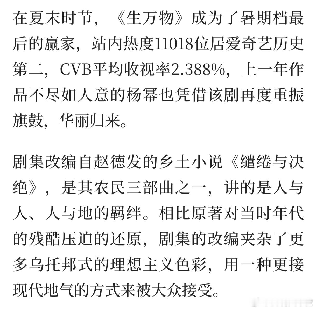 2025南都娱乐年鉴·年度十大长剧——《生万物》关键词:全员上桌,接地气的年代群像画卷在夏末时节,《生万物》成为了暑期档最后的赢家,站内热度11018位居爱奇艺历史第二,CVB平均收视率2.388%,上一年作品不尽如人意的杨幂也凭借该剧再度重振旗鼓,华丽归来。剧集改编自赵德发的乡土小说《缱绻与决绝》,是其农民三部曲之一,讲的是人与人、人与地的羁绊。相比原著对当时年代的残酷压迫的还原,剧集的改编夹杂了更多乌托邦式的理想主义色彩,用一种更接现代地气的方式来被大众接受。剧中老戏骨与青年演员塑造的角色都有可圈可点之处,尤其值得一提的是剧中不同类型的女性角色。无论是聪慧坚韧的宁绣绣,单纯热忱的宁苏苏,又或是在规训中挣扎的费左氏,温和朴实的大脚娘,善良隐忍的绣绣娘,都是在用自己的人生故事诠释“把日子过成花”的女性力量缩影。配合导演与编剧的深厚功力,在精良班底的共同托举下,宁、封、费家两代人的兴衰史构成一副生动可感的年代群像画卷,上边有历史的厚重,时代的浮沉,人性的复杂,世事的难料,总有一处笔墨让观众为之震颤。生万物杨幂生万物