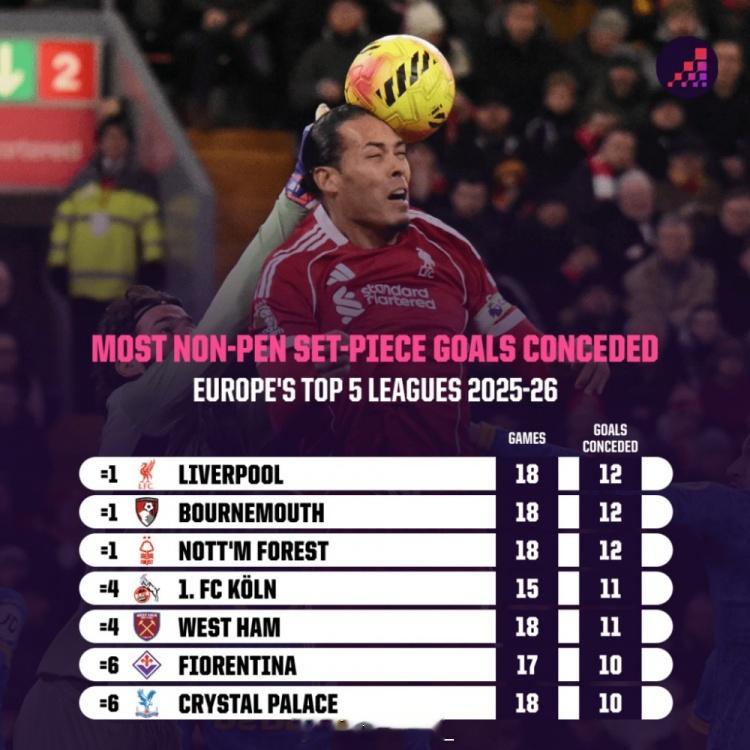本赛季五大联赛定位球失球榜(非点球):利物浦——12伯恩茅斯——12诺丁汉森林——12科隆——11西汉姆——11佛罗伦萨——10水晶宫——10