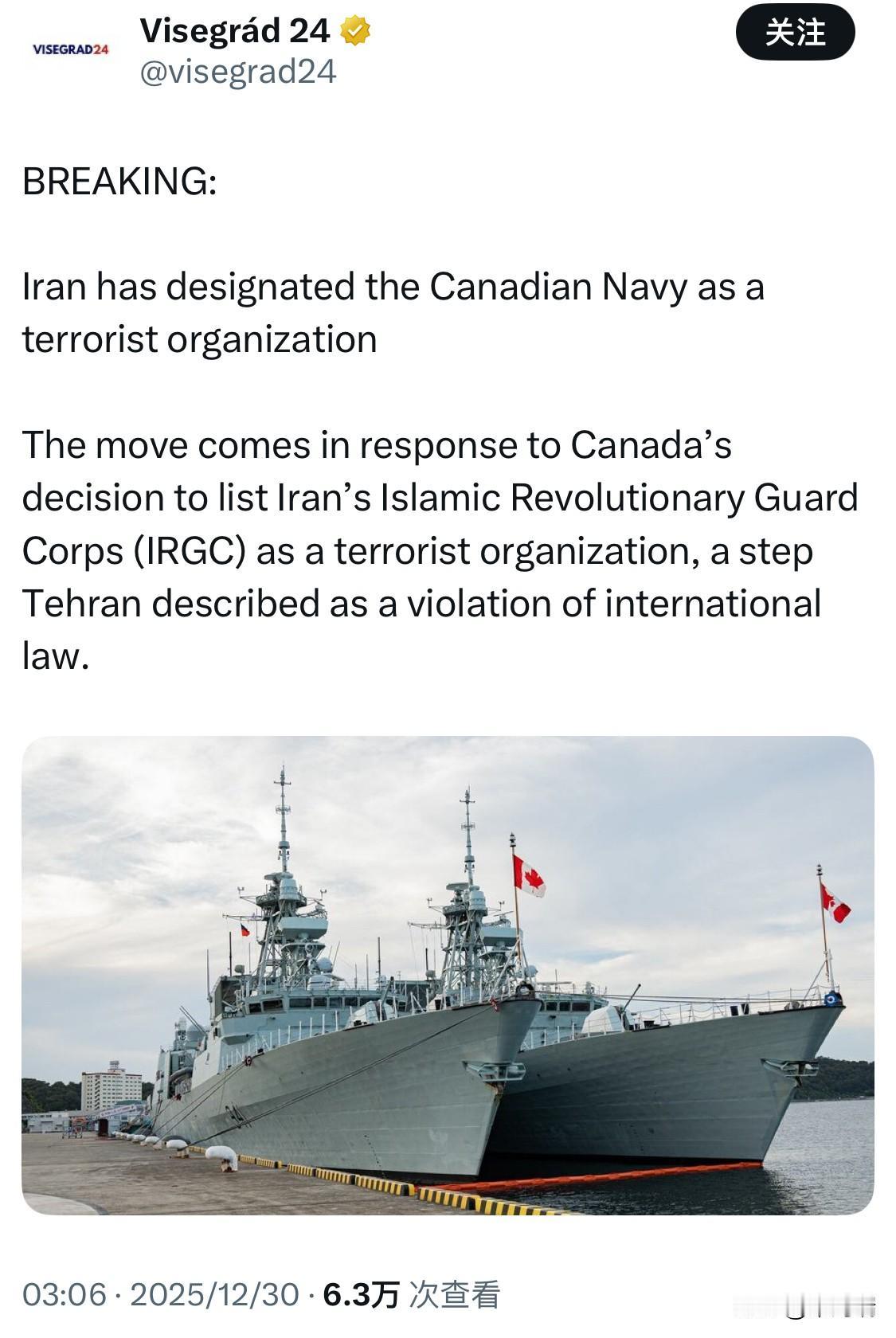 突发新闻:伊朗已将加拿大海军指定为恐怖组织。此举是为了回应加拿大决定将伊朗伊斯兰革命卫队(IRGC)列为恐怖组织,德黑兰将这一举描述为违反国际法。