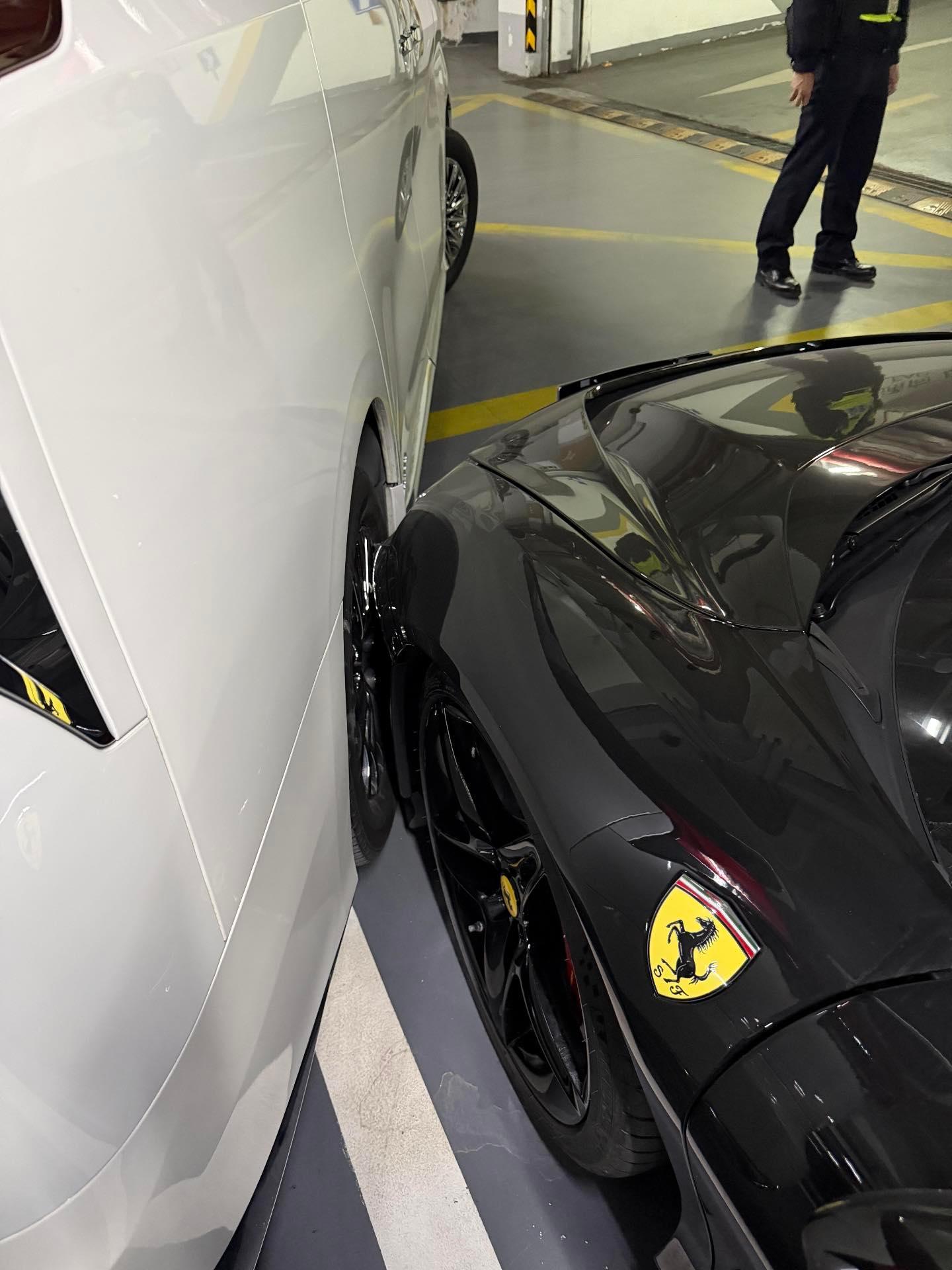 大家开轴距长的车一定要注意,车身出车位稍微多一点,再往右打方向,如果方向打早的话就是这样的结果。