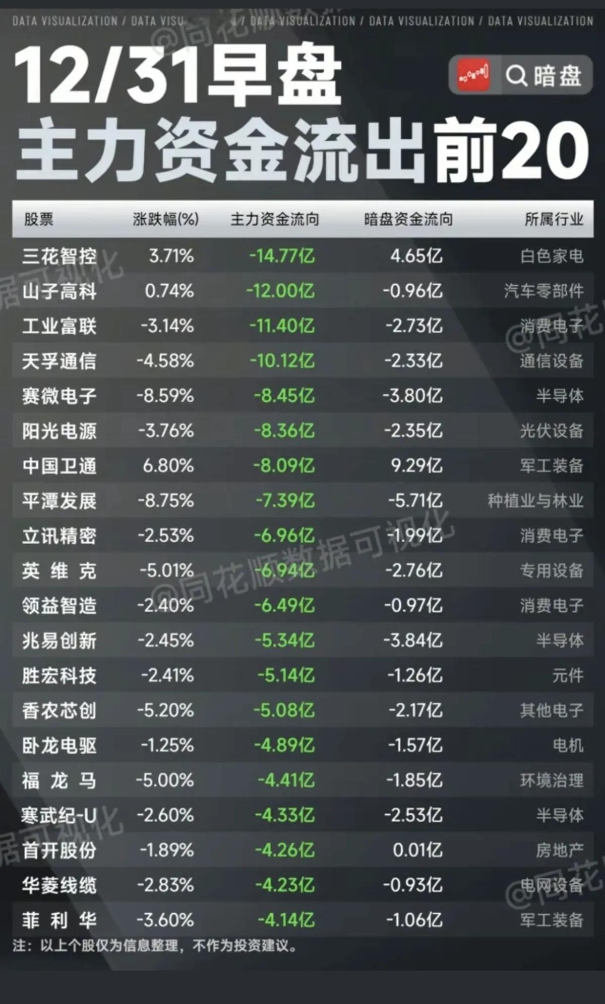 12月31日,周三A股主力资金流入流出一览表!!! 蓝色光标主力资金大幅流入24.34亿,暗盘资金大幅流入18.55亿,后市值得高看一眼;利欧股份主力资金大幅流入22.35亿,暗盘资金流入3.94亿,后市值得期待;三花智控主力资金大幅流出14.77亿,暗盘资金流入4.65亿,后市值得期待!!!