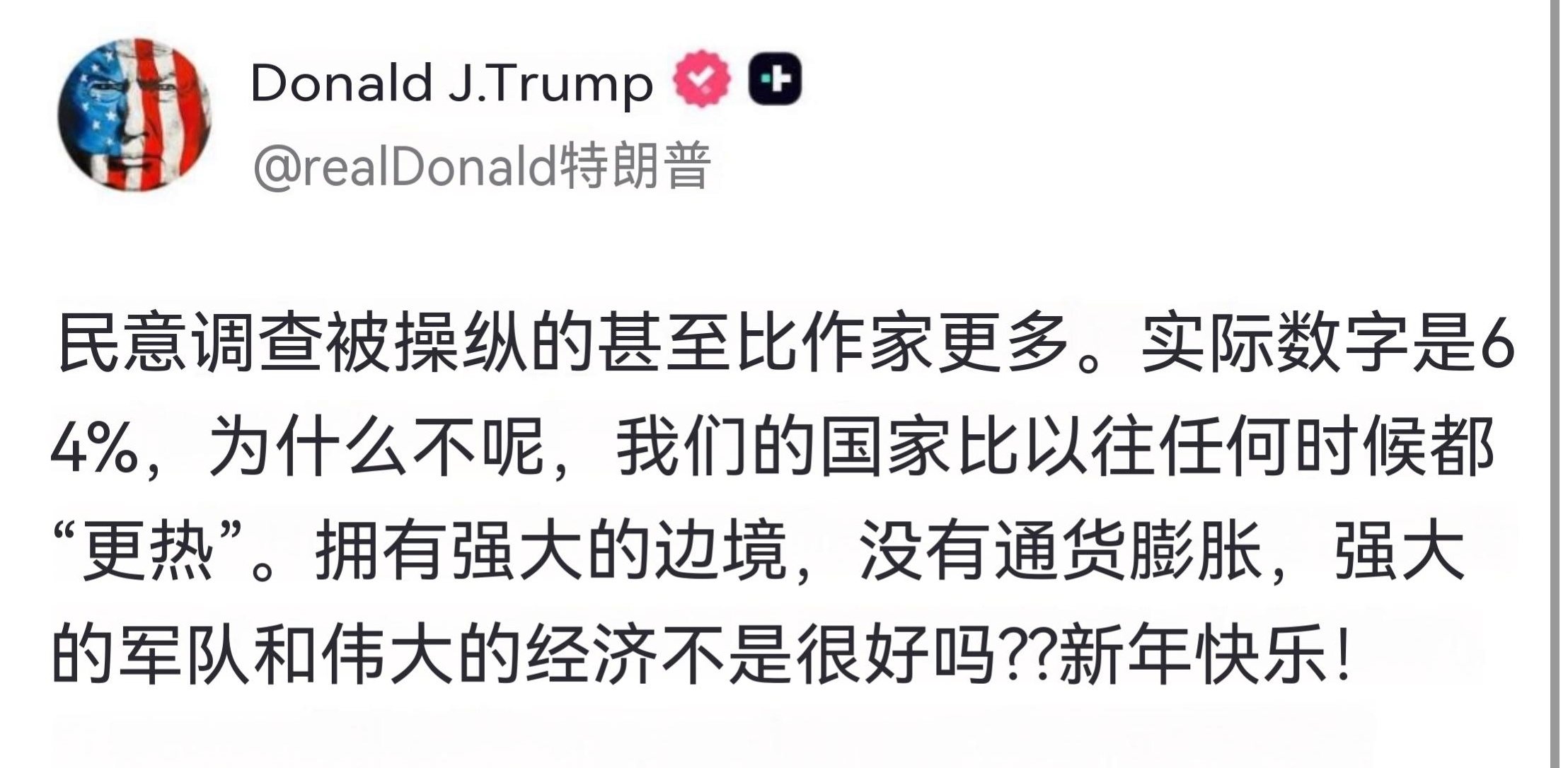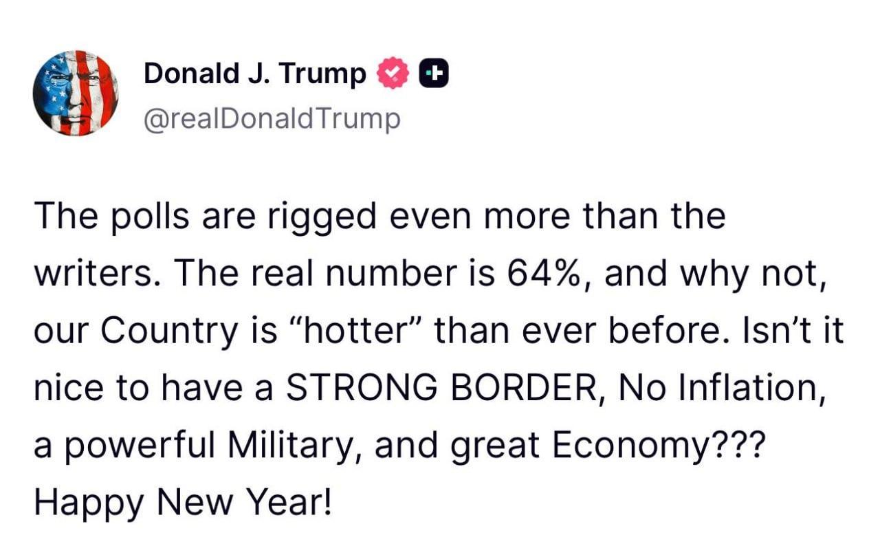 特朗普通过 Truth Social 发帖:民调比写民调的人还要狡猾。真实数字是 64%,为什么不呢?我们国家比以往任何时候都“火热”。拥有强大的边境、零通货膨胀、强大的军队和繁荣的经济,难道不好吗?新年快乐!海外新鲜事热点现场