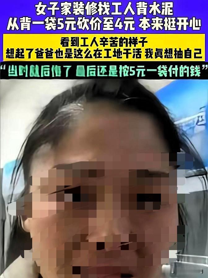 你敢信吗?省30块钱的快乐,居然会被一位老人颤抖的双手彻底击碎。 河南那位装修的女子,一开始砍价时肯定觉得自己赚了,一袋水泥省一块,30袋就是30块,够买几斤菜了。可当她亲眼看见满头白发的老人,扛着50公斤的水泥一步一步爬五楼,汗水浸透衣衫,连手都在发抖时,心里那点占便宜的得意瞬间变成了针扎般的愧疚。 她当场掏出200块塞给老人,说“叔,对不起,我占便宜了”。这一幕让无数网友破防,不是因为她多给了钱,而是因为她守住了心底的善良。 砍价本身没错,生活里谁不想省点钱?但面对用体力换生计的老人,那一块钱的差价,压垮的不只是老人的肩膀,还有我们心里的温度。女子补的不只是30块钱的差价,更是把被生活琐碎磨得有些淡漠的人情味,重新捡回了自己的胸口。 这世上最珍贵的从来不是占便宜的小聪明,而是看见他人辛苦时的共情与体谅。你有没有过类似的经历,为了一点小利事后却满心愧疚?