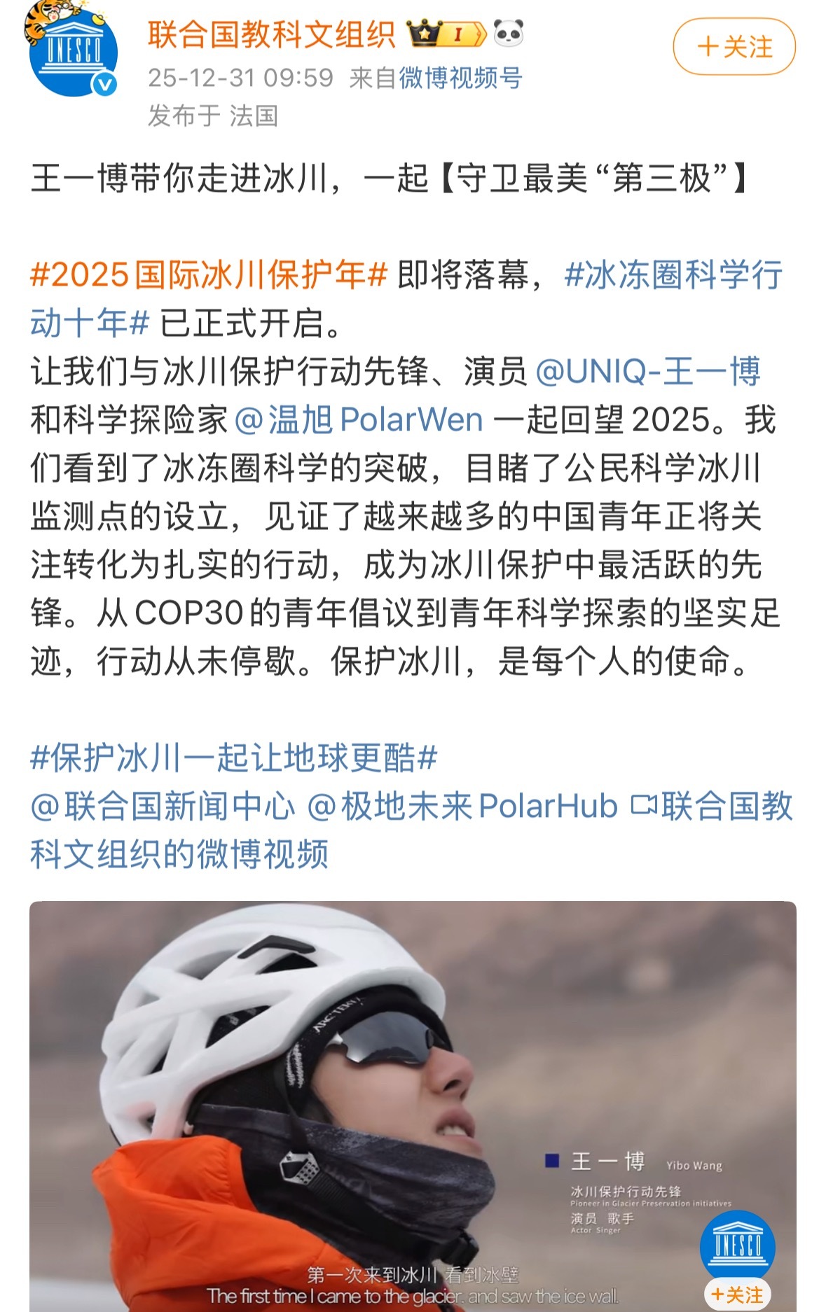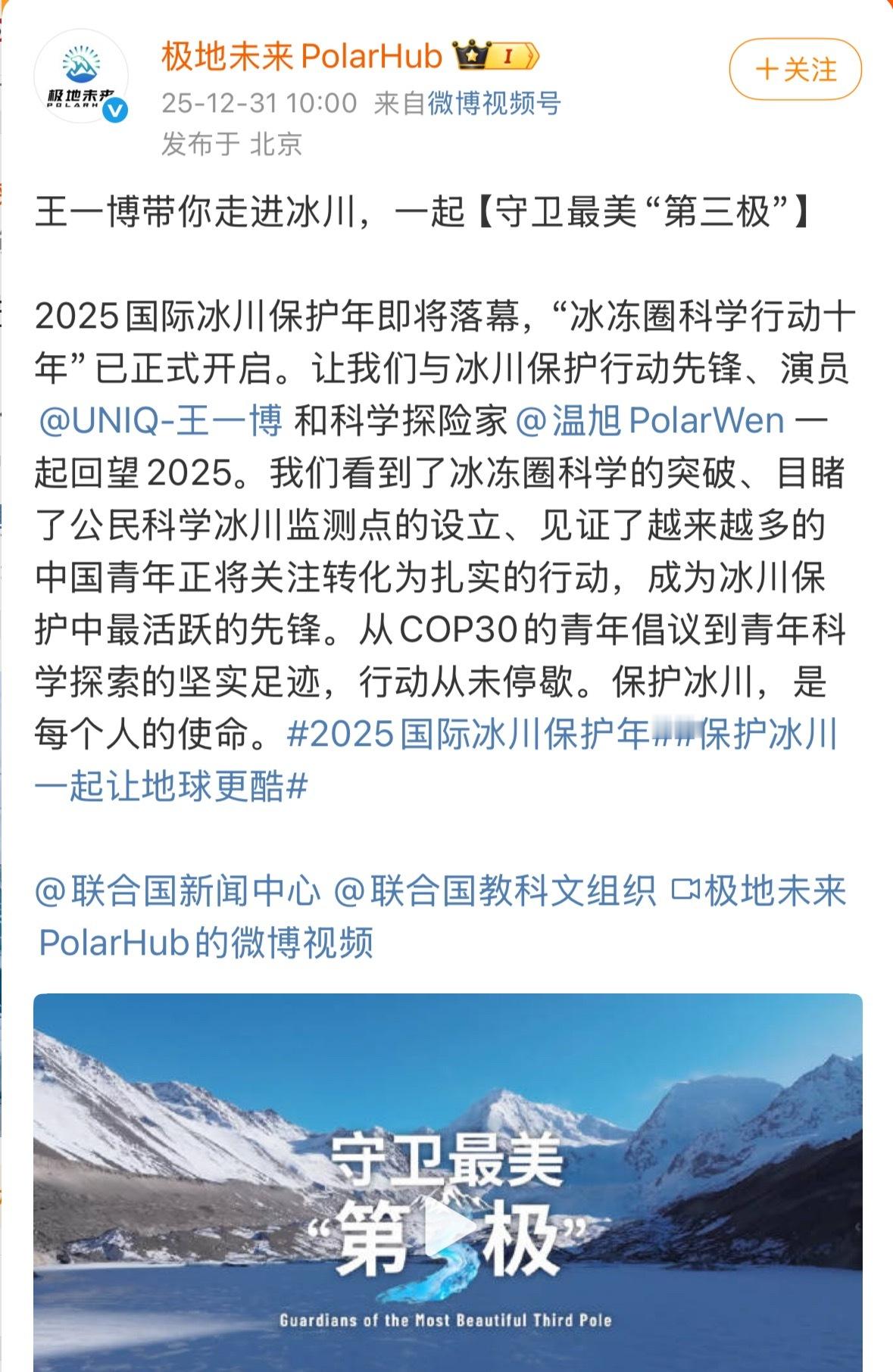 联合国新闻中心发布王一博带你走进冰川,一起守卫最美第三极。这才是我们的正能量顶流