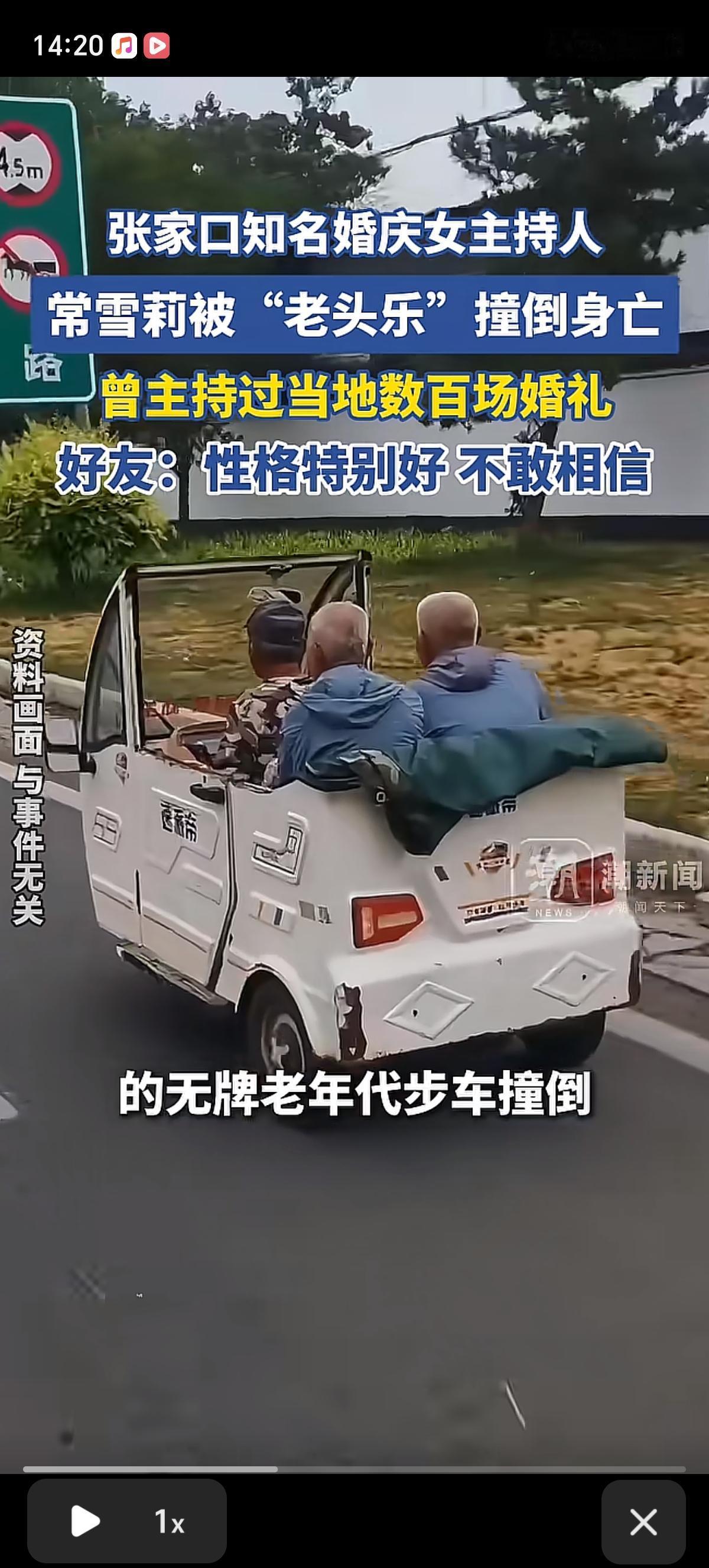 张家口婚庆主持人常雪莉被“老头乐”撞倒身亡,快70岁的老头开着车直接跑路了。虽然后来把人逮回来了,但老头没钱,常雪莉的丈夫很难拿到赔偿。 开老头乐的大爷也没有保险,车子也没有牌照,事故发生时常雪莉正步行前往工作室/返家,被一辆突然冲出的“老头乐”直接撞倒,因重度颅脑损伤经抢救无效离世。 “老头乐”是低速电动三轮/四轮代步车的俗称,也叫老年代步车,多以“观光车”“厂区代步车”名义生产,设计用于封闭区域,却被违规开上公共道路,是中老年人短途出行的常见工具。 市面90%以上的“老头乐”是非标产品,用劣质钢材制造,缺少防撞钢梁、气囊等安全配置,车窗甚至不用钢化玻璃,车身结构脆弱,碰撞时易变形,对行人和乘员的保护能力极差。
