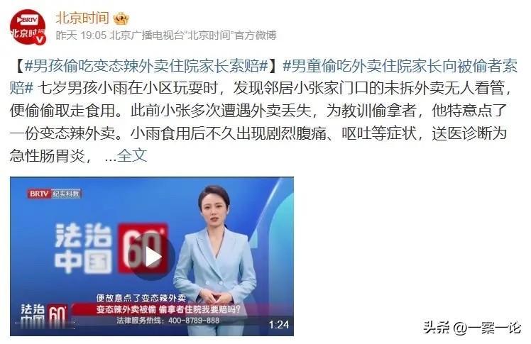 “上梁不正下梁歪!”北京,男子发现自己外卖经常丢,为了惩罚偷外卖的人,他特意点了一份爆辣的外卖,到后故意没拿,就等对方上钩。万万没想到,偷外卖的是一个年仅7岁的小男孩,他吃完被辣的突发急性肠胃炎,治疗花了2000多,家长又心疼孩子又心疼钱,当他们得知孩子偷吃了别人的外卖后,第一反应不是教训孩子偷东西不对,而是找到男子,要求他赔钱。 小张平时上班忙,没空自己做饭,就经常点外卖。 不过,最近小张的外卖总是不翼而飞,有时候是一份黄焖鸡,有时候是杯奶茶,前后加起来可没少丢。 这小张哪能忍得了?虽然一份饭没多少钱,但在他最饥肠辘辘的时候,餐却丢了,他又得忍受饥饿重点一份,还要再等好久才能吃上,那心情可想而知。 小张非常生气,想着这贼也太猖狂了,为了惩罚对方,他想出一个狠招。 那天傍晚,小张特意点了份加麻加辣的饭。他嘱咐商家,必须多放辣,越辣越好,不怕辣死人! 商家也很配合,直接按要求给他做了一份爆辣的餐食。 外卖员送来后,小张特意拖着没拿,就等对方主动上钩。他心想,让你偷,这回非得给你个教训不可! 没过一会儿,同小区7岁的小雨溜达过来了。 他看四下没人,那盒外卖又冒着诱人的香气,熟练地伸手拿走了外卖。 这个小雨,正是之前多次偷走小张外卖的始作俑者。可他没想到,报应很快就来了。 果然,小雨刚拆开包装才吃了没几口,脸瞬间就红成了关公。 那不是一般的辣,是那种直钻喉咙眼的工业辣精味。他强忍着咽下去,没过一会肚子就开始翻江倒海。 后来,小雨上吐下泻,脸色蜡黄,额头上全是冷汗珠子,嘴里直哼哼肚子疼。 家长吓坏了,送到医院一查,急性肠胃炎,加上有些脱水,医生说得住院观察。 这一通折腾下来,2000多块钱没了,家长是既心疼孩子又心疼钱。 孩子到底吃了啥才会这样?家长一问,这才得知孩子偷拿了别人的外卖,而且还不是第一次拿了。 家长也反应过来了,知道这回对方肯定是故意的。 然而,他们第一反应不是教训孩子偷东西不对,而是把矛头指向点外卖的人,认为如果不是对方把餐弄这么辣,孩子也不会遭这个罪。 在家长看来,这跟投毒没两样。 于是,孩子出院后,家长直接敲开了小张的门。 刚开门,小雨妈在门口就吼开了,说你一个大男人,跟7岁的孩子较什么劲?明知道那东西辣得大人都受不了,你故意放在那引诱孩子偷吃,孩子住院花了2000块,你必须承担! 小张听后哭笑不得,说大姐,话不能乱说。外卖是我花钱买的,是你家孩子手不干净,偷东西还有理了?我拿刀逼他吃了?是他自己嘴馋! 不过,小雨家长还是觉得,即便孩子有错,小张都千不该万不该,不能用变态辣这种可能造成人身伤害的东西当诱饵。 这就好比为了防贼,在自家门口挖个坑插把刀,贼掉下去受伤了,主人也得担责,因为这超过了必要的防卫限度。 尤其是小雨还是个只有7岁的娃,身体耐受力跟大人不一样,娃万一真吃出个三长两短的,你能承担的了那后果吗? 小张却觉得,孩子7岁了,不是两三岁不懂事的娃娃,偷拿别人东西,这是原则性的错误。 家长平时如果不灌输“不问自取视为偷”的观念,孩子这就敢偷外卖,将来指不定闯什么大祸。 你家乡教育不好自己的孩子,那我就来替你教育教育,这没错吧? 两家吵得不可开交,最后连警察都来了,也只能建议调解。 那么,从法律角度来看,小张需要担责吗? 《民法典》第1165条第1款规定:行为人因过错侵害他人民事权益造成损害的,应当承担侵权责任。 如果家长真要追究起来,小张其实并不占优势。 他故意点变态辣外卖并放置在公共区域。主观上存在“教训偷拿者”的故意,客观上实施了可能危害他人健康的行为。 小张应预见到高辣度食品对人体可能造成的伤害,却放任该结果发生,是存在一定过错的,可能会承担侵权责任。 不过,小雨作为限制民事行为能力人,偷拿外卖的行为本身存在过错。 根据《民法典》第1173条,被侵权人对同一损害的发生有过错的,可以减轻侵权人的责任。 小雨偷拿外卖不对,家长得管好孩子,别让他养成坏习惯。小张想治偷拿的人,出发点能理解,但用“变态辣”下套,在法律角度来看可能有点过。 辣椒虽常见,可小孩肠胃嫩,扛不住这刺激。万一辣出大事,那就麻烦了。 要是真丢了东西,报警或找物业或许更稳当。 对于这件事,你怎么看? 欢迎关注@一案一论