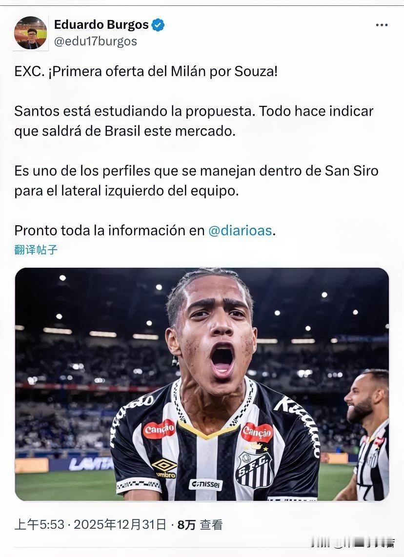 索萨!米兰已首次为索萨报价!桑托斯正在考虑这份报价。种种迹象表明,他将在这个转会窗口离开巴西,索萨是米兰正在考虑的左后卫人选择之一。 这个索萨可是米兰的老朋友了,两个转会窗口都是主角,去年冬季窗口与夏季窗口米兰左后卫目标球员都是他,他是巴西桑托斯的队长,曾经入选过巴西U系列国家队,算是今天桑托斯俱乐部的球星。之前也介绍过这个球员,属于没啥特点的后卫,可以理解为他什么都具备,有一定脚下技术,也有突破能力,传中能力也不错,但每样都不精,往好了说是比较全面的球员,不好了说就是四不像球员,年龄快26了,还没走出巴西,球员到底有多少能力多少潜力,相信各位老哥能有概念了。 米兰现在的主力球员肯定是巴特萨吉,无论是现在的阵容打边翼卫还是未来可能变阵的边后卫,巴特萨吉都会是主力,阿莱格里之前采访说的很明白,巴特萨吉就是米兰左路重要的球员,他与萨勒马克尔斯一左一右使阵容保持了足够的平衡性,他们都是米兰不可或缺的球员,所以这个索萨来米兰就是给巴特萨吉做替补的,虽然是巴西球员,但不用抱有特别高的期待。