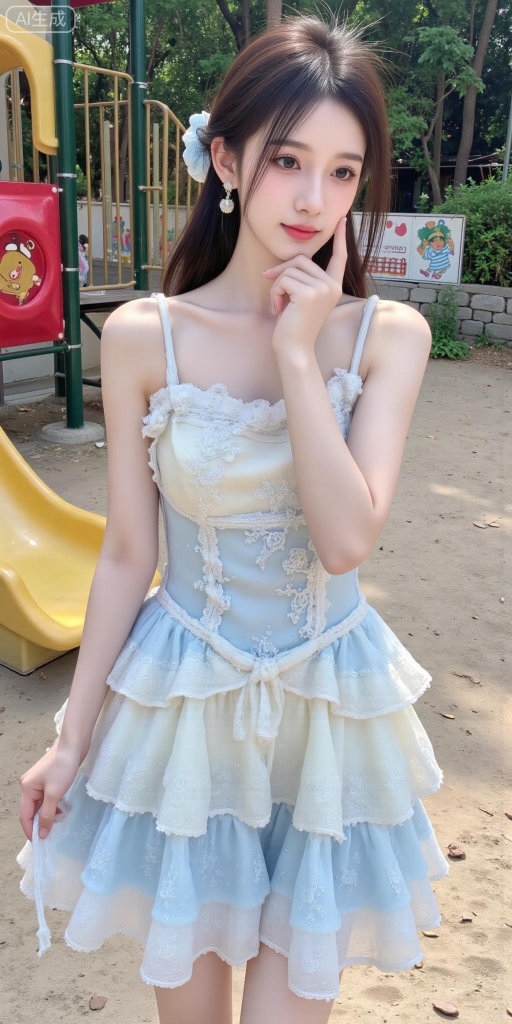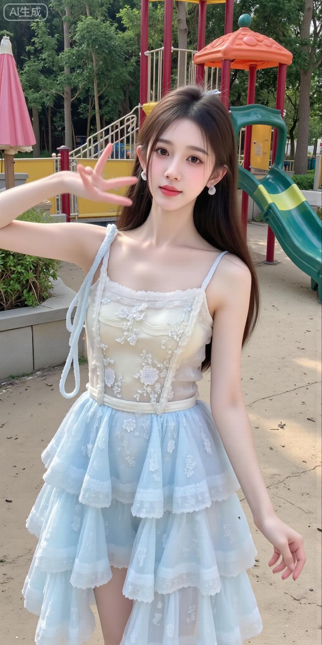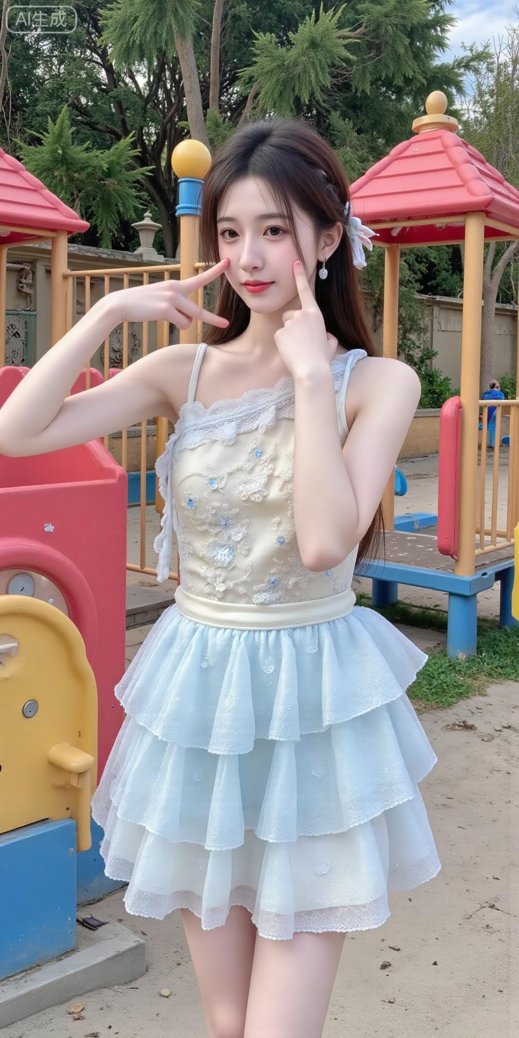 游乐场的甜系公主裙好戳 奶黄缎面叠浅蓝纱裙,蕾丝绣花像裹了层糖霜,发间别着白蝴蝶结,甜得像从童话里蹦出来~ 对着镜头比心,彩色游乐设施当背景,连风都裹着少女感,这就是夏日甜妹的氛围感吧!粉钻公主裙