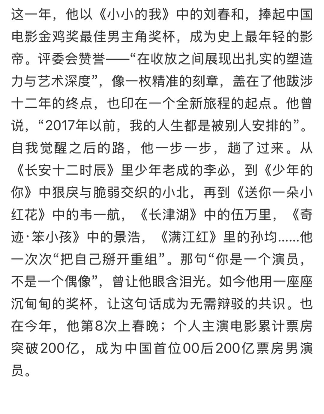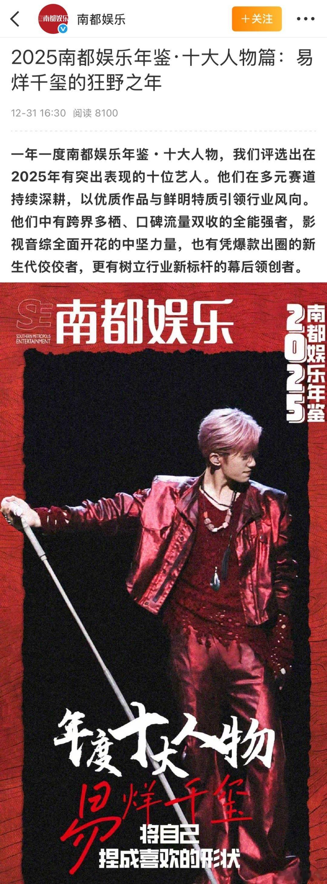 南都娱乐周刊2025十大人物:易烊千玺❗“首位00后200亿票房男演员,最年轻的金鸡奖影帝,2025年,是属于易烊千玺的一年。”