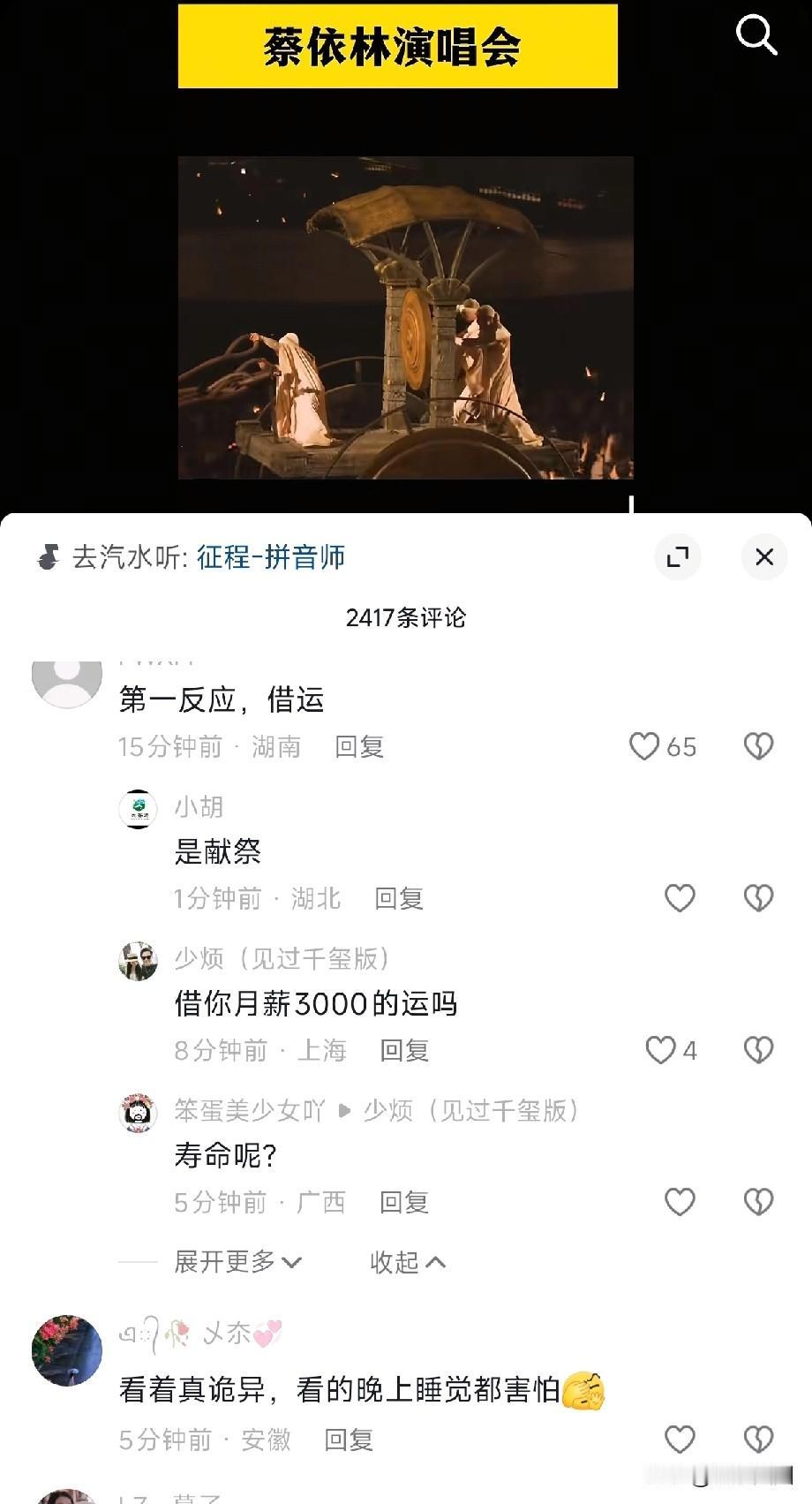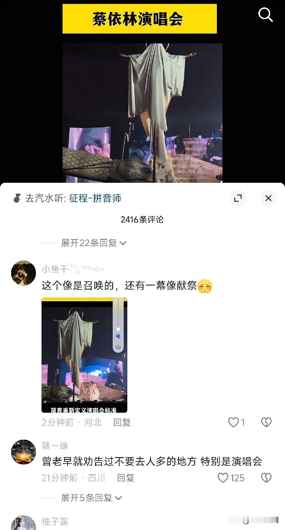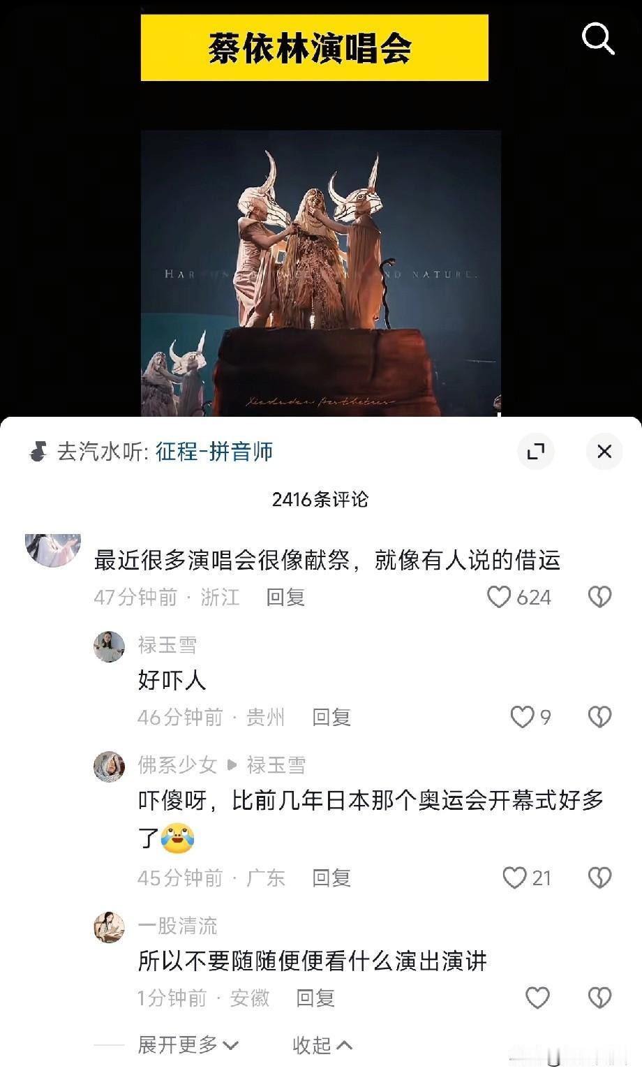 蔡依林演唱会的排场 排面大 出动了好多动物,道路 开始网友们都很震撼,觉得买这种才值得 夸奖蔡依林有格调,有档次 一天过去了 风声变了 都看看吧 说的蛮邪乎的