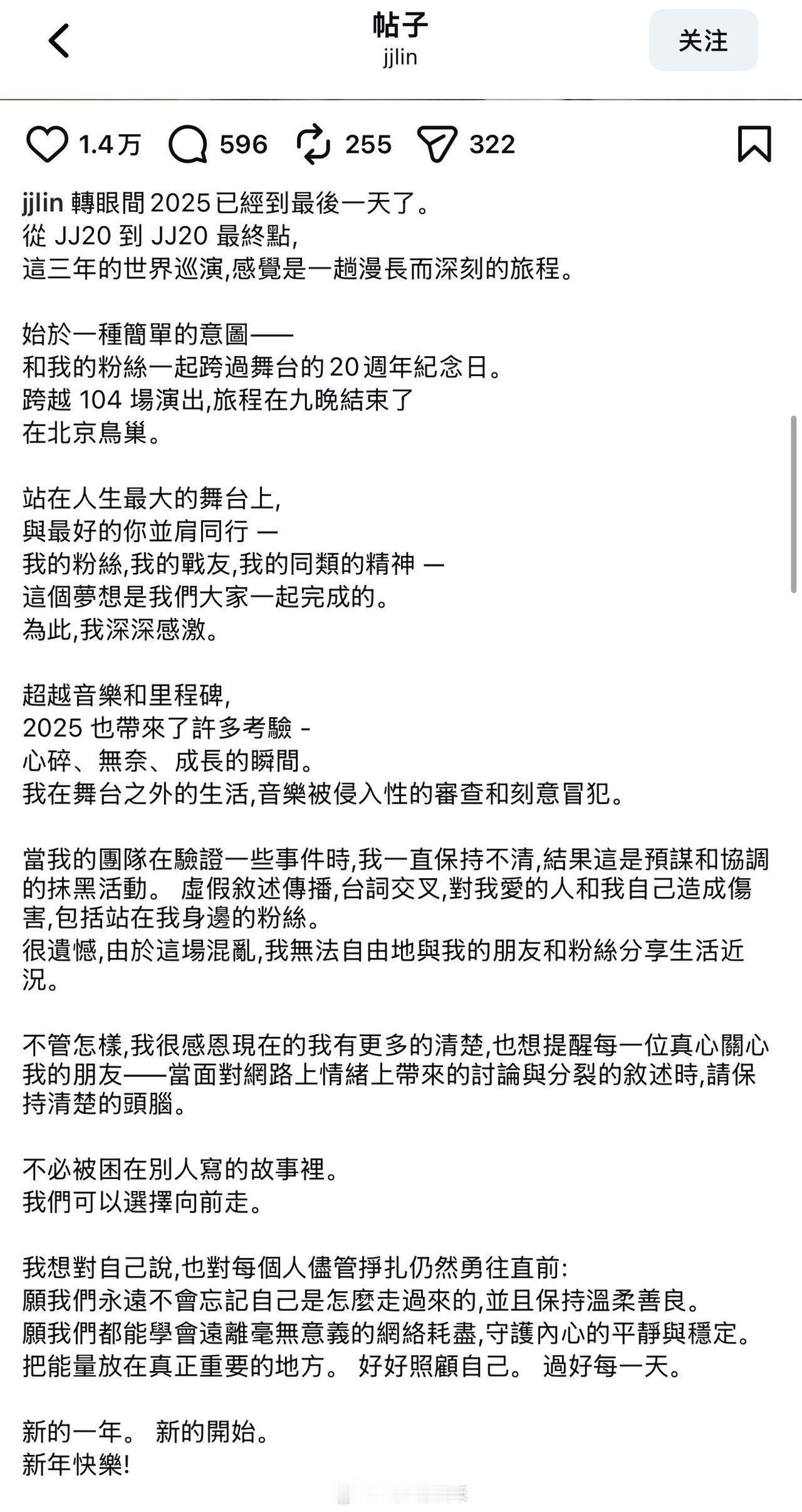 林俊杰官宣恋情后在跨年夜发文,信息量满满。12月29日他在母亲大寿时公开与女友合照,引发全网热议。其实早在11月就有他和23岁女网红“七七”的恋情传闻,女方多次现身演唱会首排,还被曝同游新西兰。 林俊杰在文中提到2025年遭遇有组织抹黑,为免误解扩散只能沉默。他呼吁歌迷保持理性,别困在他人“杜撰”的剧本里。针对女友怀孕猜测,经纪公司也回应没有此事。这位创作才子代表作无数,希望他在音乐之外,也能享受生活的幸福。 林俊杰