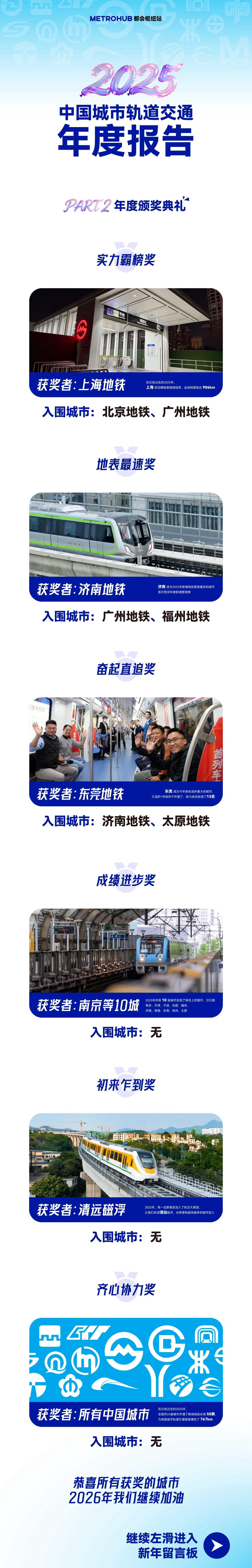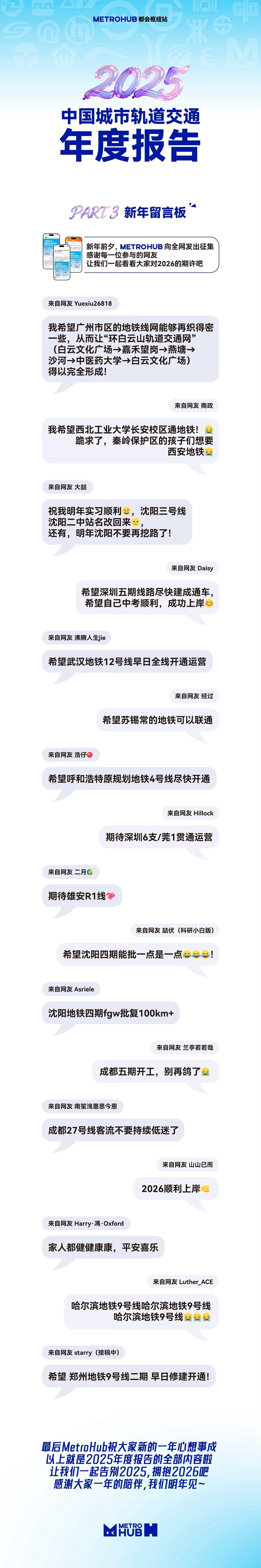 【2025中国城市轨道交通年度报告】 今天是2026年的第一天, MetroHub年度报告如约和大家见面, 这一年,你的目标实现了吗? 或者,你期待的那条地铁开通了吗? 你心中有哪些印象深刻的事呢? 快跟我们一起回顾这难忘的一年吧!