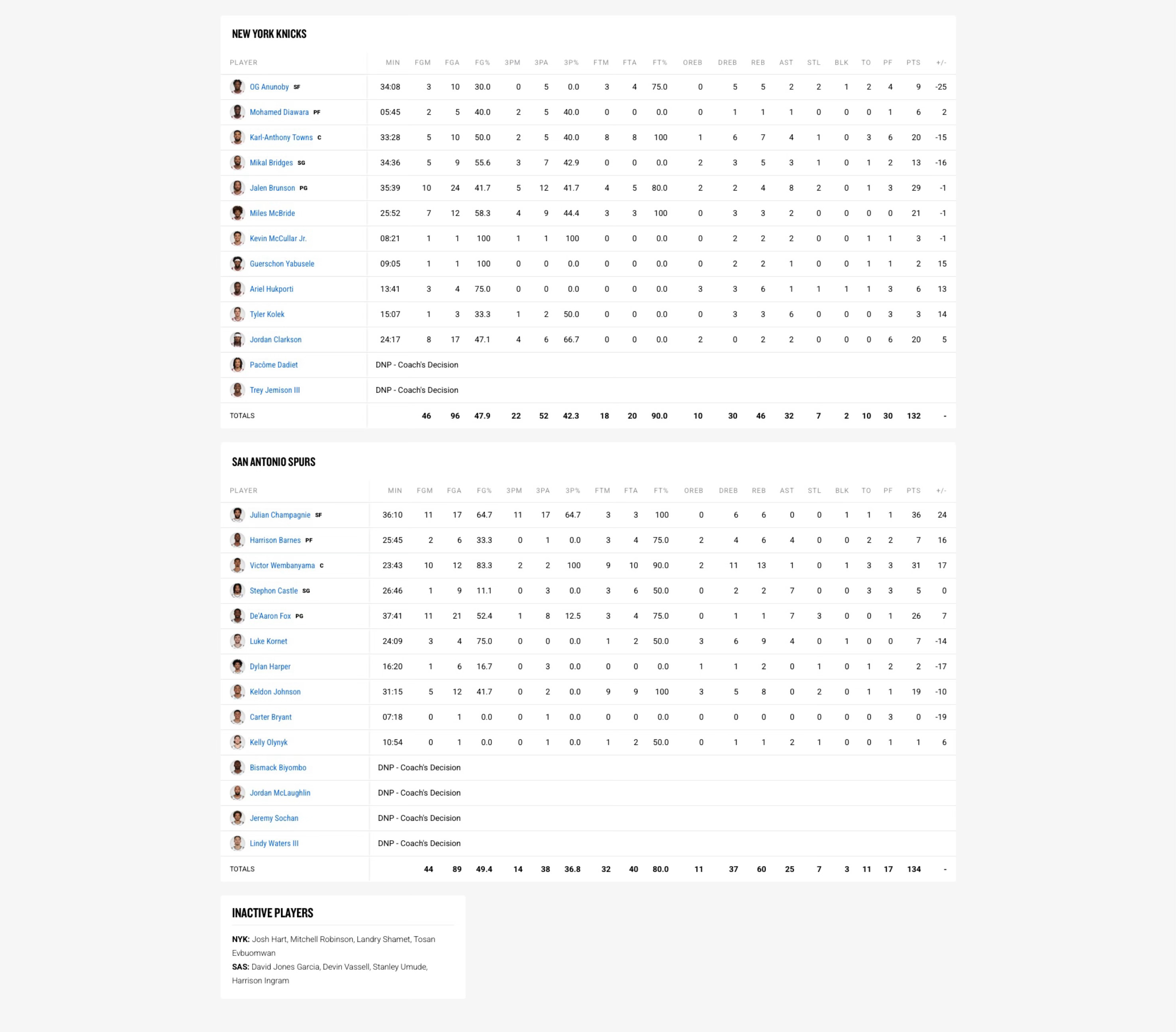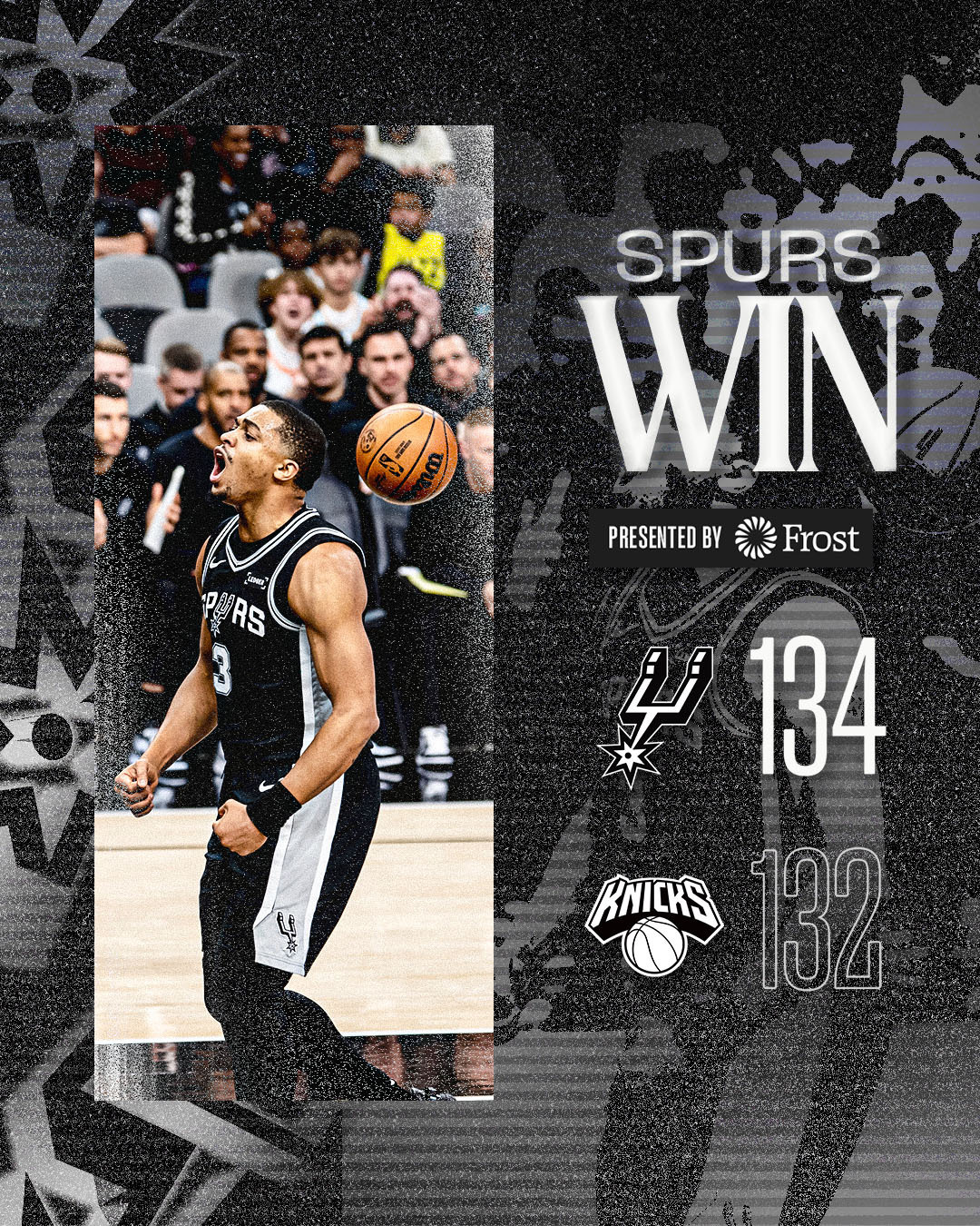 全场比赛结束!马刺主场134-132逆转击败尼克斯,拿下元旦大战马刺(24-9):尚帕尼36分6板、文班亚马(伤退)31分13板1助、福克斯26分1板7助3断、凯尔登19分8板2断、科内特7分9板4助、巴恩斯7分6板4助、卡斯尔5分2板7助、哈珀2分2板、奥利尼克1分1板2助尼克斯(23-10):布伦森29分4板8助、麦克布莱德21分3板2助、唐斯20分7板4助、克拉克森20分2板2助、布里奇斯13分5板3助、阿努诺比9分5板2助2断、胡克波尔蒂6分6板1助、迪亚瓦拉6分1板1助、科勒克3分3板6助、麦卡勒3分2板2助、亚布塞莱2分2板1助马刺下一场将在1月3日客场挑战步行者超话创作官 |篮球年末狂欢季 |马刺战胜尼克斯