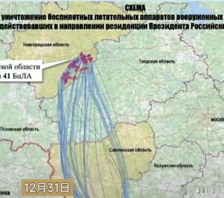 俄国防部披露普京官邸遇袭细节:无人机密集超低空飞行,轨迹地图暗藏玄机。 2025年12月31日,俄罗斯国防部公布了乌克兰动用无人机试图袭击普京总统官邸的关键作战细节。根据公布的飞行轨迹地图显示,无人机从苏梅州和切尔尼戈夫州起飞,飞越布良斯克州、斯摩梭斯克州、特维尔州和诺夫哥罗德州,从多个方向抵近官邸,并采用超低空飞行的方式进行突袭。 俄国防部同时还公布了被俄军摧毁的一架乌军无人机残骸的画面,并称这架无人机携带了6公斤爆破炸药。 俄空天军防空导弹部队司令亚历山大·罗曼年科夫称,此次乌克兰实施的恐怖袭击是有针对性的、精心策划的、多层次的。 普京俄乌冲突 普京怒