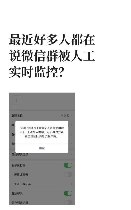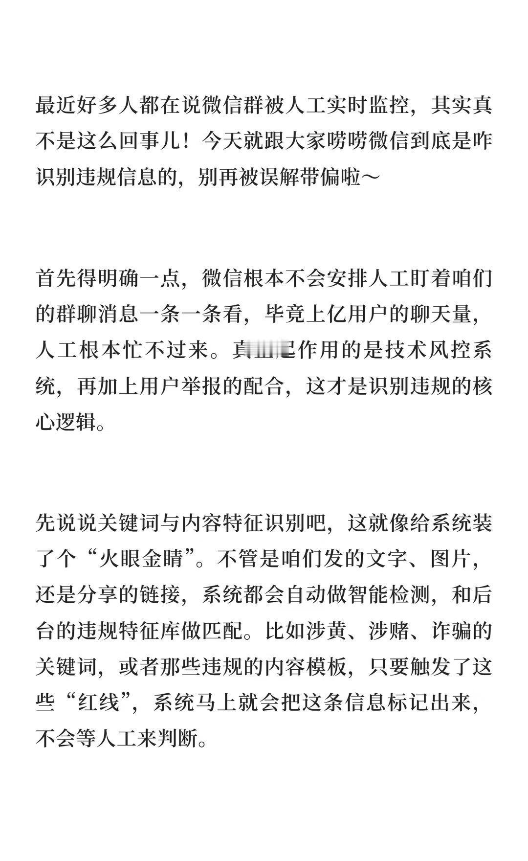最近好多人都在说微信群被人工实时监控? 微信通过技术风控系统和用户举报识别违规信息,包括关键词检测、行为模式分析和大数据关联分析。系统自动标记违规内容,并通过举报机制进一步核查和处理。规范使用账号,不发违规内容,可避免被限制功能。社区公约由我提议 社区公约 大数据时代无隐私 注意防诈骗 拒绝碎片化信息 反网络诈骗 用户隐私安全 提高警惕防骗 保护个人信息