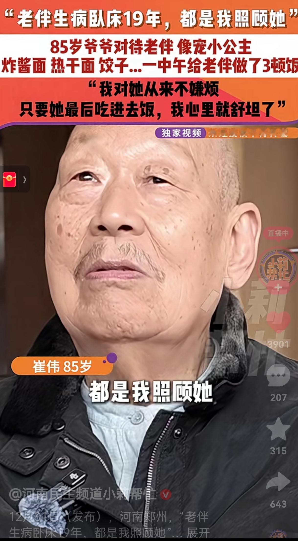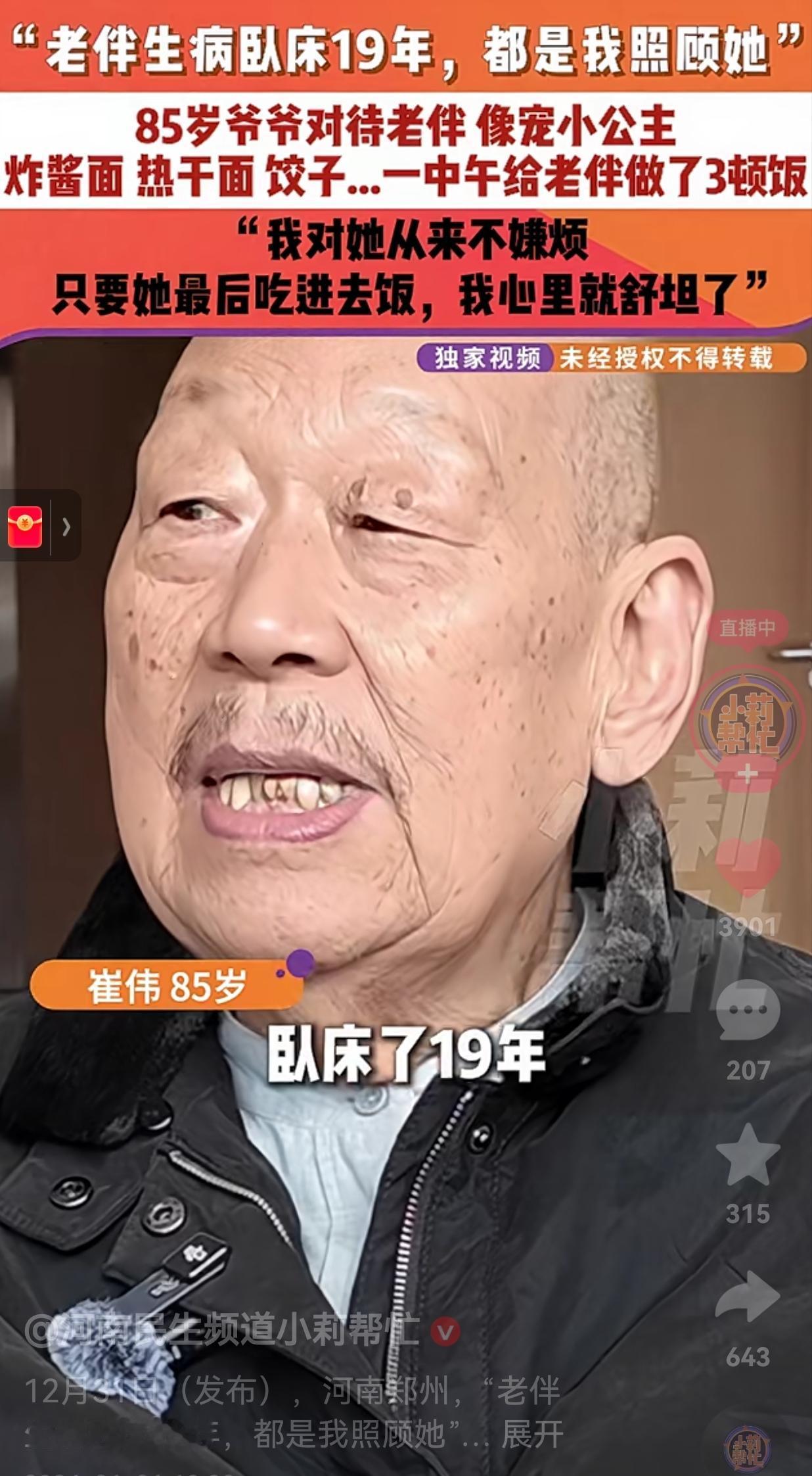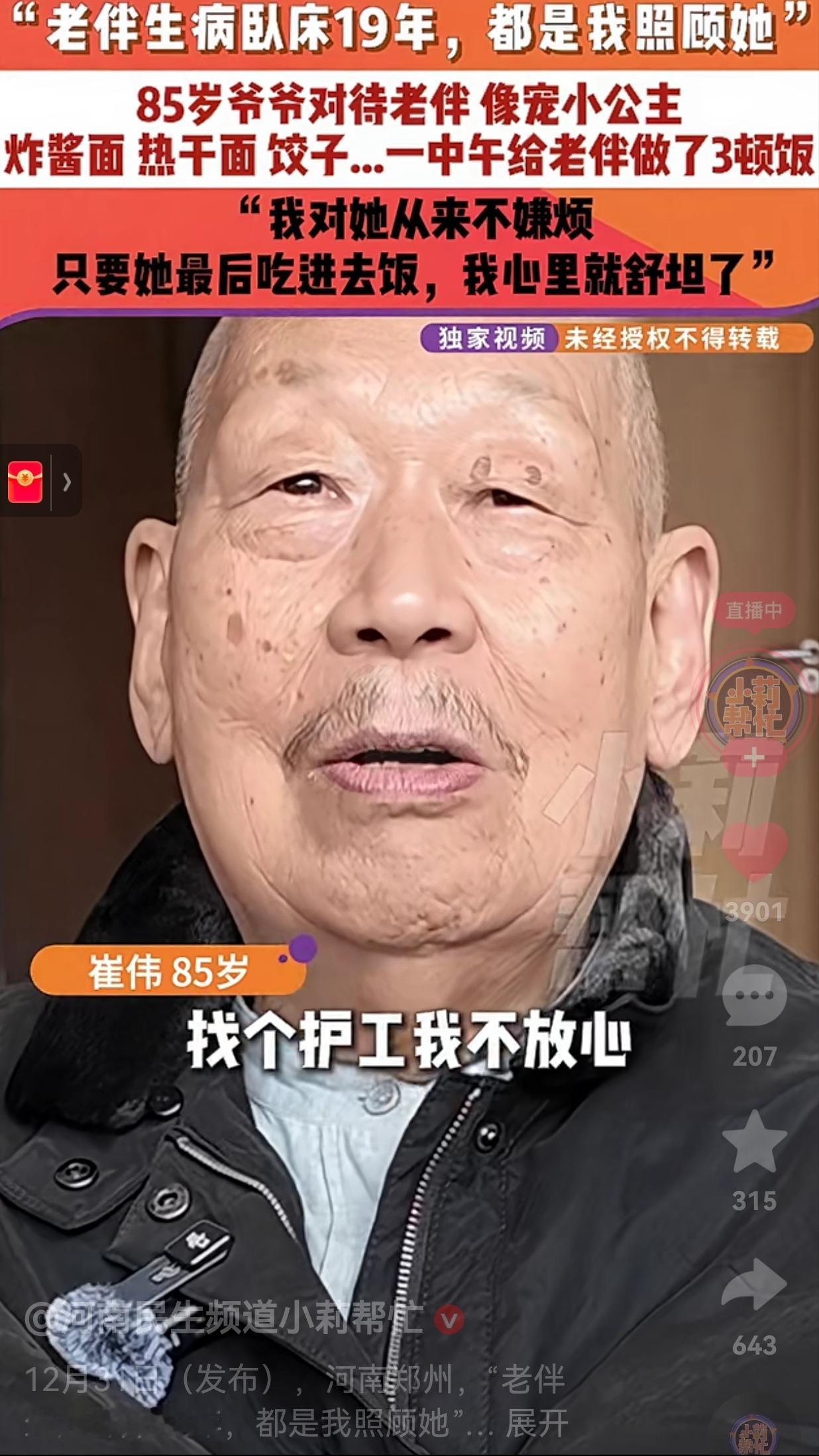 这就是少年夫妻,老来伴吧!85岁的爷爷照顾生病卧床的老伴,这一照顾就是19年,对待老伴从来都是有求必应,把她当小公主宠,从来不烦她。网友:这才是爱情该有的样子啊!19年,换我我真不一定能坚持下来,爷爷太伟大了! 河南郑州,一位85岁的崔爷爷,照顾卧床生病的老伴19年,梳头洗脸、喂饭擦身这些活儿,全是他一个人干。 据崔爷爷讲述,自从老伴生病了之后,吃饭特别挑食,有一天中午他连着做炸酱面、热干面、饺子三顿饭。 当时家里没有热干面,为了满足老伴的心愿,让老伴吃上两口饭三伏天里,他还专门跑街上买热干面,就盼着老伴能多吃一口。 在镜头里,主持人询问,你烦你的老伴吗?老人毫不避讳地说:“我对她从来不嫌烦”。 他还笑着说:“只要她最后吃进去饭,我心里就舒坦了”。 网友看到后评论说:“看哭了看哭了,什么山盟海誓都抵不过这一中午三顿饭的迁就,这才是实实在在的爱!” 还有的网友说:“说真的,现在好多小年轻谈恋爱,一点小事就要闹分手,再看一看爷爷,啥叫责任,啥叫担当!” 19年啊,六千多个日日夜夜,这不是一朝一夕,这些时间,足够把老爷子磨得腰也弯了、背也驼了,足够把一个人的满腔热血的劲儿给磨没了。 可崔爷爷偏不是这样的人,他嫌护工照顾得不周到,宁愿多花点时间,也不愿意请护工,每天就守在老伴的床边,他怕老伴吃不好,就变着花样琢磨吃食。 他从没觉得照顾老伴是负担,因为,在他的心里就一个念想:“她能吃下饭就行。” 崔爷爷用19年的时光告诉我们所有的人,爱哪是一时的心动啊,是一辈子的担待和迁就。 老话都说“久病床前无孝子”,可崔爷爷用自己19年的时间告诉我们,久病床前,还有最真的爱人。 他不是不知道累,也不是不想歇会儿,只是在他心里,老伴的平安喜乐,比自己的轻松自在重要多了。 很多时候,我们总在追什么“高质量爱情”,却忘了,最好的爱情,不过就是你病了,我守着。你老了,🈶我陪着。 崔爷爷的故事,没啥惊天动地的情节,却让我们看懂了爱情最本来的样子:它不是风花雪月的浪漫,是风雨里互相搀着的陪伴;不是一时的海誓山盟,是一辈子的那句“我不嫌烦”。 愿我们都能懂这份烟火气里的深情,往后的日子里,多一点耐烦,多一点珍惜——毕竟啊,真正的爱,从来都在细水长流的陪伴里。