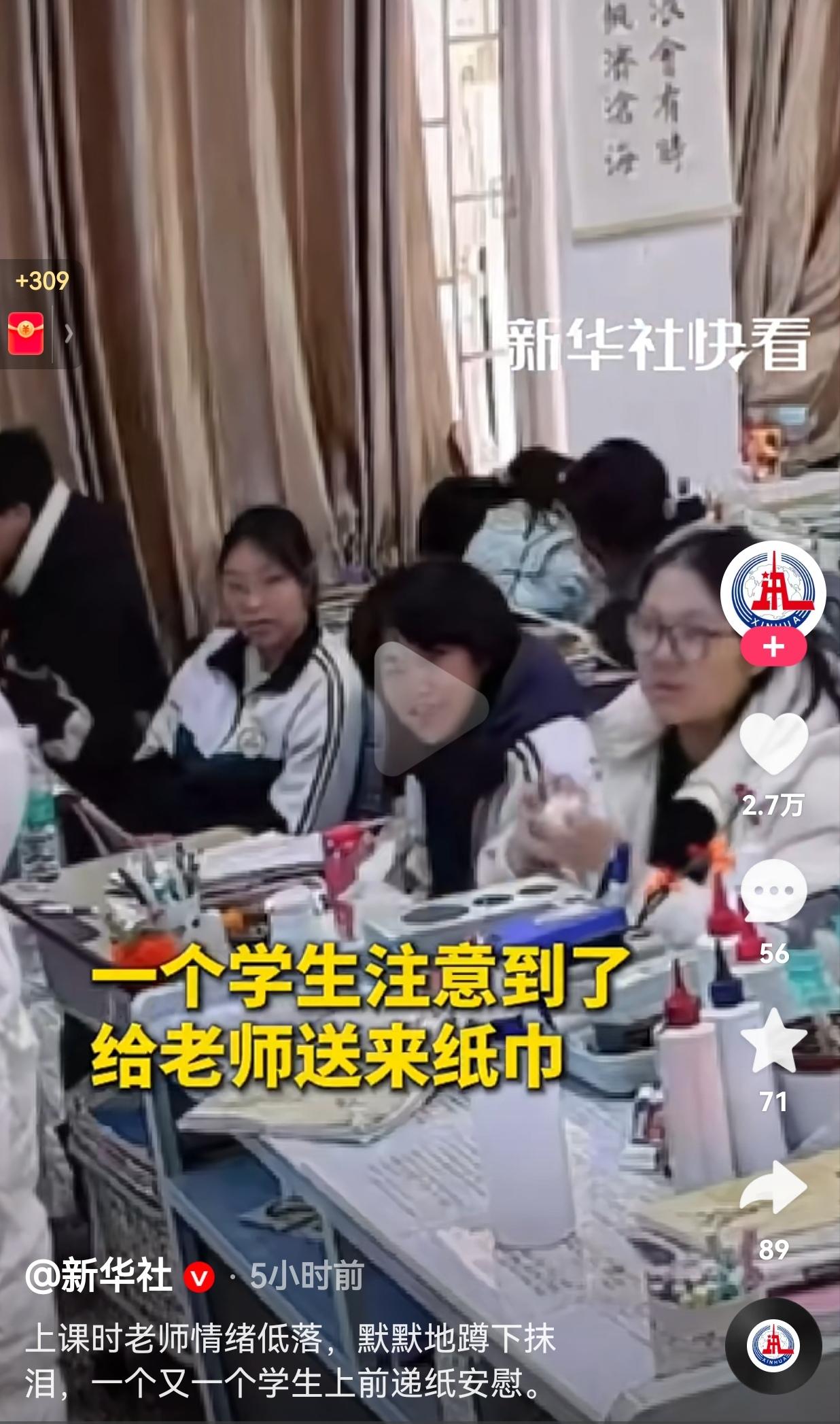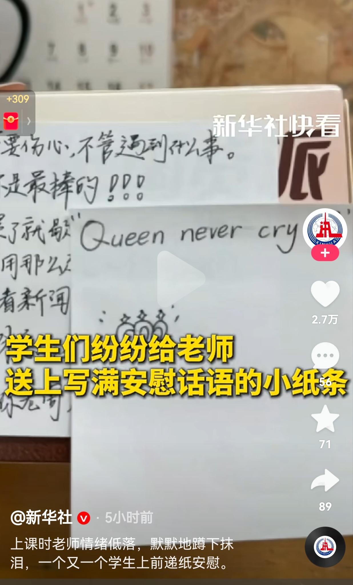 太暖心了!上课时老师情绪很是低落,背对着学生,默默地蹲下抹眼泪,学生们发现后,一个又一个学生上前递纸安慰。网友:孩子们的善意太戳人了,小小年纪就懂得心疼人,老师教得真好! 近日,湖南,一间教室里,上课铃刚落,老师走进教室准备上课却突然蹲在地上,低着头默默抹起了眼泪。 教室里安安静静的,没有孩子吵闹,也没人露出诧异的神情。大家你跟着我、我跟着你,一个个轻手轻脚走到老师身边,有的递上纸巾,有的轻轻拍着老师的后背安慰老师。 据老师讲述,当时拼命想把眼泪憋回去,可孩子们注意到自己情绪不佳时,这一连串的小动作,让她又幸福又感动,说那一刻真真切切懂了,教育到底是为了什么。 下课后,孩子们又一张张写了小纸条塞给老师,有的同学写着:“别伤心呀,啥事都能过去”也有的同学说:“老师你超棒的”,还有孩子写了句:“Queen never cry”。 网友看到后评论说:“ 老师值得,学生更值得,双向奔赴的爱最动人!” 还有的网友说:“想起上学时的老师,其实他们也有脆弱的时候,只是我们当时没留意。” 刷到这个视频的时候,总觉得心里暖乎乎的。我们常说说,教育就是老师一头热,教知识、教做人,学生只管听就行。 可这一幕摆在这里,哪是这么回事啊?教育哪里是老师一个人的事,分明是老师把孩子放在心里,孩子也把老师的喜怒哀乐装在了眼里、记在了心上。 老师也是普通人啊,不是铁打的,也会有难过到忍不住掉泪的时候。而这群孩子,用最笨、最直接的方式,给了老师最实在的安慰。 现在很多时候,我们总盯着分数、排名这些东西,反倒把教育最本来的样子给忘了。 湖南这间小教室里的画面,就像一束光,一下子照透了教育的根儿——你用真心对孩子,孩子就用真心回你。老师用爱教孩子长大,孩子用爱给老师撑腰,这才是教育最该有的样子。 希望每个真心对待学生的老师,都能被温柔接住。也希望每个心里装着善意的孩子,这份美好能一直被护着。