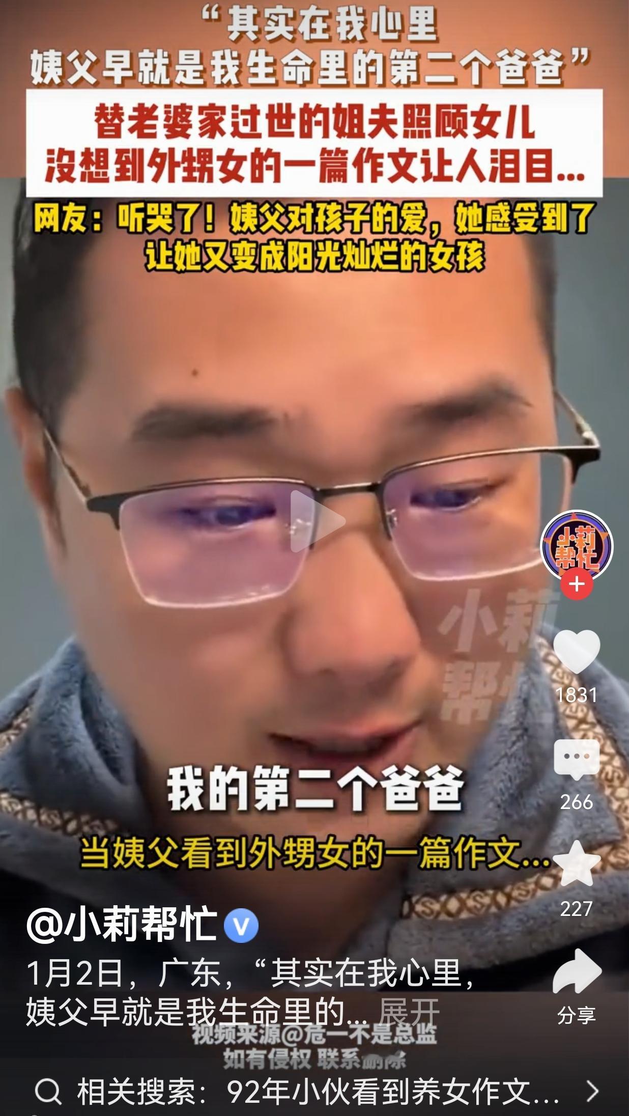 1月2日,广东深圳,一个女孩给姨夫写的一篇作文,看哭了很多人,也让看到该作文的网友跟着一起抹眼泪。 女孩的作文题目叫《我的第二个爸爸》,里头的字字句句,全是对姨父的依赖和感激。 原来女孩的爸爸去年得了肝癌走了,她陪着爸爸熬了整整五个月,最后家里的相框多了一张照片,她却永远没了爸爸。 更让人揪心的是,女孩的爷爷奶奶早就不在了,最疼她的姥爷前年也走了,姥姥身体一直不好,妈妈还有残疾。 接二连三的打击,让她整天郁郁寡欢,心里琢磨着往后的日子该怎么办,总觉得没人能护着她了。 她的性子也变得越来越沉默,走路总是低着头,连看人都不敢抬眼,心里像破了个大洞,她说自己“就像棵没了根的小草,孤零零在风里晃”,几乎每天晚上都躲在被子里偷偷哭。 就在女孩觉得“世界都是灰的”时候,姨父和小姨义无反顾地来到了她身边。 两个人为了她跑前跑后,还想方设法办成了她的监护人,带着她从老家搬到深圳,开始新的生活。 刚到陌生的地方,女孩紧张得不行,跟姨父也生分,就连打个招呼都觉得别扭。 可姨父一点儿没不耐烦,日子一天天过,女孩慢慢发现,家里总是热热闹闹的,满是烟火气。 姨父还会轻轻拍拍她的头,跟她说“以后有我在,啥都不用怕”。这句话就像一束光,一下子照亮了女孩的心,让她“重新有了盼头”。 女孩喜欢打篮球,姨父只要一得空,就喊上她一起去球场,哪怕自己长得偏胖,跑几步就满头大汗,也从没喊过累。 在女孩眼里,姨父的爱从来不是什么惊天动地的大事,就藏在陪她打球的汗水里,藏在每天桌上香喷喷的饭菜里。 只是女孩也悄悄发现,姨父最近不上班了,说是要创业,眉头常常皱着。夜里她起床上厕所,好几次看到姨父趴在亮着屏幕的电脑前,就那样在沙发上睡着了。 女孩心疼得不行,把自己攒了好几年的零花钱全都塞进储钱罐,心里念叨着“明天就送给他,不想让他这么辛苦赚钱”。 女孩说,她从来没忘记过亲生爸爸,爸爸的爱一直刻在我心里,而姨父,早就不只是姨父了,更像是她生命里的第二个爸爸,替爸爸继续爱着她、护着她,成了她最踏实的依靠。 女孩还在作文里写下心愿:“往后余生我要好好爱他,我们一家人把日子过得越来越暖、越过越好”。 当姨父收到女孩那罐总共1321.6元的零花钱,哽咽着把这份心意称作“第一笔天使投资”,说“我要带着这份爱勇往无前”的时候,这个铁打的汉子再也忍不住,红了眼眶,捂着脸的样子,藏着说不完的感动。 网上的网友们也都哭了,说姨父的爱,孩子完完全全接住了,是这份爱,让女孩重新变回了那个爱笑的、阳光灿烂的模样。 我们总说血浓于水,可血缘真不是衡量爱的唯一标准。真正的亲情,哪是靠基因绑在一起的,是靠一颗真心换另一颗真心。 这位姨父,本来没义务抚养外甥女,却用肩膀扛起了这份责任。女孩本来经历了至亲的离别,却在另一个人身上感受到了父爱的延续,还反过来心疼姨父的不容易。 这个世界上,最珍贵的从来不是血缘的牵绊,是那份心甘情愿的付出,还有懂得感恩的回应。 愿每个缺爱的孩子,都能遇到这样的“家人”;也愿每个愿意付出善意的人,都能被这个世界温柔以待。毕竟啊,爱出者爱返,福往者福来,这才是人间最美好的样子。