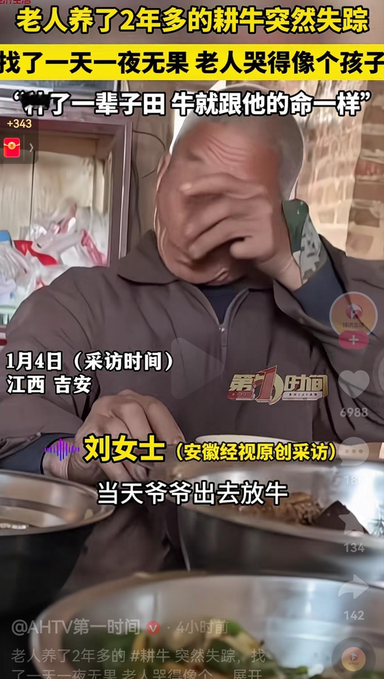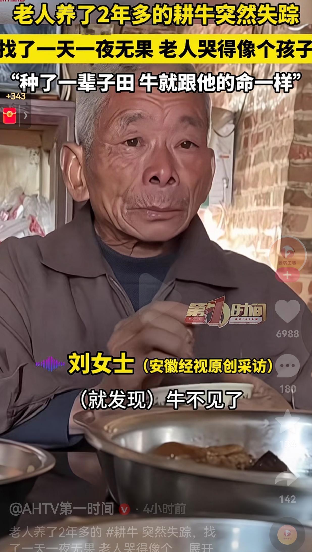 1月4日,江西吉安,老人跟平常一样出门放牛。中午太阳很大,老人就把牛牵回家歇息一会儿,谁知道眨眼的功夫,老人就傻了眼。因为,牛不见了,地上就剩下一截拴牛的绳子。 老人很是着急,赶紧喊上家里人,骑上电动车在田埂上、村道里来回找。 从正午找到天黑,又从天亮找到日头高照,整整一天一夜,把所有熟悉的犄角旮旯都翻遍了,牛好像人间蒸发了一样,始终不见牛的身影。 吃饭的时候,老人也没有胃口,时不时用手捂着脸,小声抽泣,哭得像个犯了错的孩子一样,嘴里还反反复复念叨着:“种了一辈子田啊,这牛就跟我的命一样。” 据老人的孙女讲述,爷爷奶奶这辈子就守着家里那几亩地,这头牛自从开始喂养。爷爷每天天不亮就去割草喂料,傍晚再牵去河边饮水。 田里犁地的时候,更是一步不落地跟着。在老两口心里,这哪是一头牲畜啊,早就是家里的一份子了。 在咱们看来,牛可能就是一头能干活的牲畜,值几个钱罢了。可对这位老人来说,这头牛是朝夕相处的伴,是他攥了一辈子的种地底气。 两年的光景,他看着牛从犊儿长成壮实的大家伙,牛陪着他把每一块田犁得平平整整。春种秋收,寒来暑往,一人一牛的身影,就是这片土地上最寻常也最踏实的画面。 在老一辈人的眼里,耕牛就是农耕日子最有用的机器。他们这一辈子,脚踩黄土,面朝庄稼,汗水摔八瓣洒在地里,牛就是他们最忠实的搭档。 如今牛没了,就像抽走了他几十年种地生涯里的一块拼图,心里空落落的,那滋味,真的很难体会。 我们总说时代进步了,拖拉机、收割机早就取代了耕牛,效率高多了。可机器再快,也耕不出人和土地、人和牲畜之间的那份情分。那些刻在骨子里的依赖和陪伴,从来都不是冷冰冰的机器能替代的。 老人的哭声,其实也在提醒我们:这世上最珍贵的东西,从来都不是能秤出斤两的物质。是那些陪着你走过漫长岁月的陪伴,是那些融进柴米油盐里的牵挂。 一头牛,一辈子田,一份藏在岁月里的情。在这个快节奏的时代,这份朴素到骨子里的情感,更显得沉甸甸的,格外珍贵。 真希望这头耕牛能早点被找到,让老人的老伙计,早点回到他身边。
