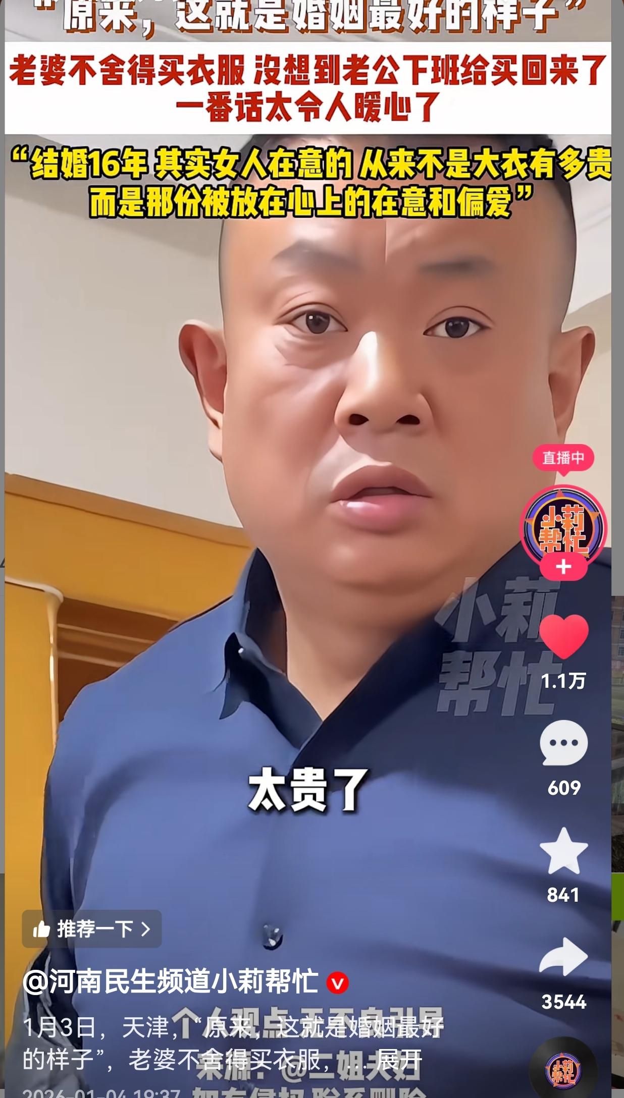 原来,这才是爱情最好的样子!老婆带孩子去商场里买衣服,女子因嫌衣服太贵,舍不得买,没想到老公下班后,偷偷给她买了回来,还给她说了一番掏心窝子的话。网友:其实,女人在意的从来不是多贵的衣服,而是那份放在心上的在意和偏爱。 1月3日,男子下班回家,随口问了句老婆:“干啥去了”。 老婆说:“给孩买衣裳去了”。 男子又追问:“你买了吗?” 老婆回答道:“没买” 男子说:“你咋不买啊?” 而妻子只是轻飘飘地轻轻说了句:“太贵了。” 男子又追着问:“是几千是几万啊?你舍得给这个买,给那个买,就舍不得给自己买。” 接着他转身拿出一个袋子,笑着说:“你不买,我给你买了。” 老婆又惊又喜:“不是,你怎么知道的啊?” 他慢悠悠揭开了谜底:“昨天我给孩子说了,恁妈今天带你们去买衣服,如果说你妈喜欢这件衣服她试了挺喜欢,一看价格贵她不买,就让孩子给我拍张照片发过来,我说我下班给你买,这不就买了。” 原来,他早就从孩子口中得知老婆看中了商场的一件羊毛大衣,却因为价格,愣是舍不得下手。嘴上说着没给自己买,转头就把那件她心心念念的衣服带回了家。 看着老婆接过衣服时开心的模样,大哥又念叨:“媳妇嘞,这点东西不算啥,只要你和孩子都好好的,以后咱会更好。” 老婆笑着应了声:“好” 聊到这儿,大哥语气也软了下来,拉着老婆的手念叨:“你从20岁你就跟着我,那时候咱俩出来打工,那时候咱俩这么难,我那时候就说,我说媳妇,等我以后有了钱,我要好好去补偿你。” 老婆听了反问:“什么时候补偿你啊?什么时候是有钱?” 男子沉默了一下说:“我不知道,但是,你把你的青春都给了我和孩子,孩子现在大了,喜欢什么衣服你就买,打扮打扮自己。” 可老婆还是念叨:“哎呦,太贵了没必要。” 男子又追问:“太贵?多贵啊?” 网友看到后评论说:“太羡慕了!我对象要是有这觉悟,我做梦都能笑醒,女人要的从来不是衣服,是那份被放在心上的感觉!” 还有的网友说:“看完直接破防了!这才是婚姻该有的样子,钱多少不重要,心里有人才是真的!” 我们总以为婚姻需要轰轰烈烈的浪漫,时不时给老婆再送上珍贵的礼物,可真到了过日子,我们才发现,女人在意的从来不是衣服有多贵,而是自己被放在心上的那份偏爱。 就像女子一样,她舍不得买的或许不只是一件羊毛大衣,是为了家庭的精打细算,是想把最好的留给老公和孩子而已。而老公的这份心意,恰恰接住了她的付出,让她知道,她的委屈有人看见,她的喜好有人惦念。 想要把日子过好,婚姻就应该是你懂我的不易,我疼你的辛苦,哪怕被柴米油盐磨平了棱角,这份互相理解和偏爱的心,也能把日子过好。 愿我们每个人都能遇到那个把自己放在心上的人,也能学着把对方的心意放在眼里。毕竟,最好的婚姻,不过是你在意我,我也心疼你,携手共度一生。