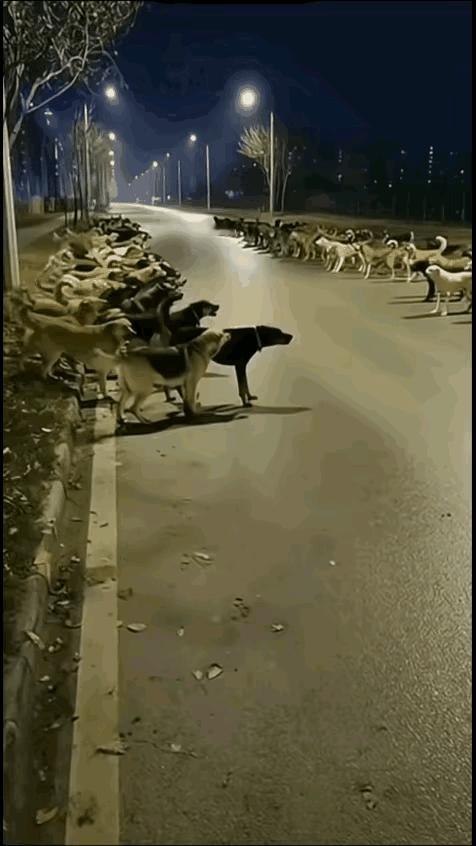 这场面真是够壮观的了,两大阵营隔路对峙,气势汹汹,叫嚣冲天,但是哪一方也不敢贸然动手,只是各守阵地,不断的示威叫嚣而已,什么时候能够打破这种状态呢?假如这时候从路中间走来一头狼或是几头狼,现场的对峙氛围马上就会发生变化,也许有的会逃跑,也许有的会攻击狼,这就很难说了!