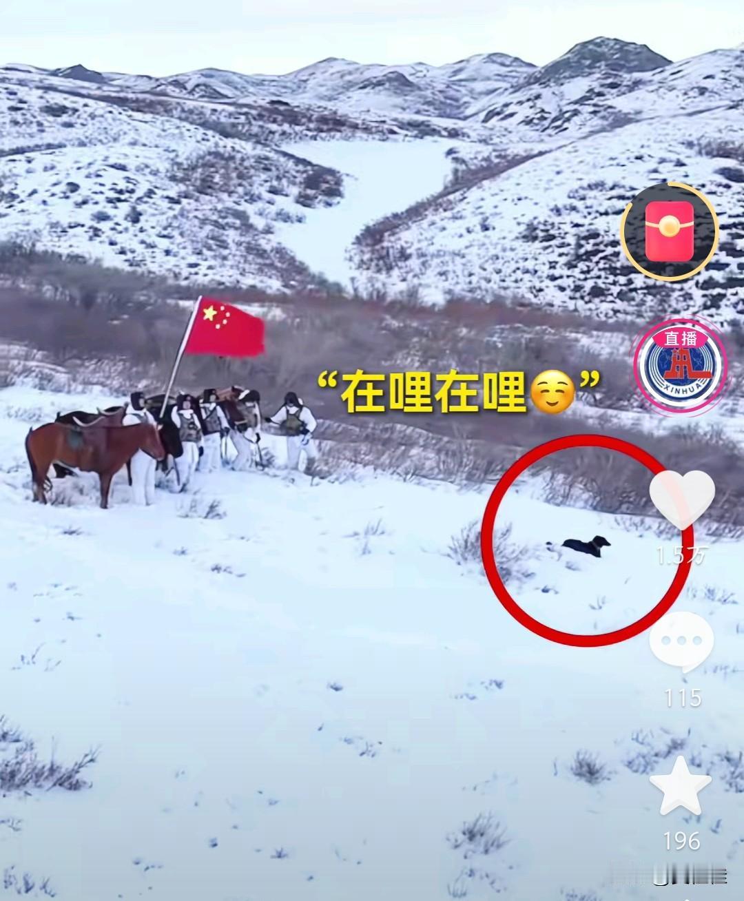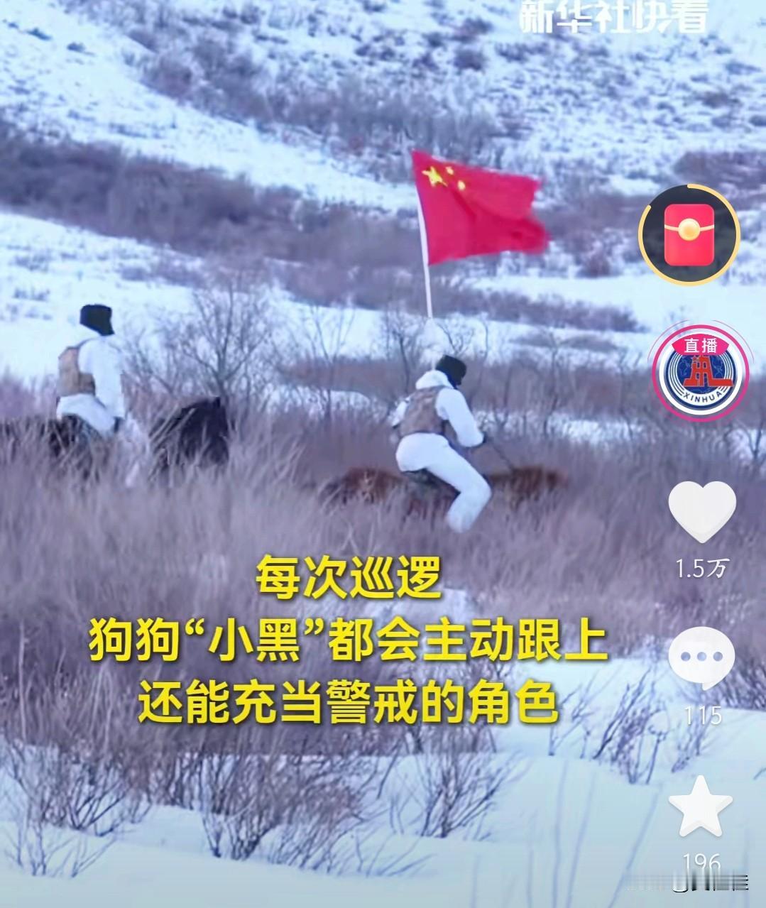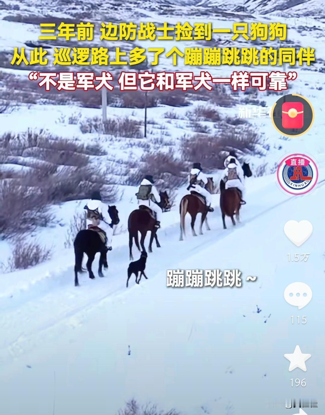 被一只狗暖到了!新疆军区库则温边防连的雪地里,藏着一只超暖心的“编外战友”小黑!三年前战士们捡到这只小狗时,它还是只怯生生的小家伙,没想到如今成了巡逻路上最活泼的同伴。 每次战士们整理装备准备出发,小黑就摇着尾巴跟在身后,踩着雪蹦蹦跳跳地跑,一点也不嫌路远。它不是训练有素的军犬,却会主动帮着警戒,听到异响就立刻停下警惕张望,把战士们的安全放在心上。 白茫茫的雪山上,五星红旗迎风飘,小黑小小的身影跟在马队旁,成了边防线上最可爱的风景线。战士们说“它和军犬一样可靠”,这大概就是彼此守护的温暖吧,冰冷的边关因为这份陪伴,多了好多温柔呀!