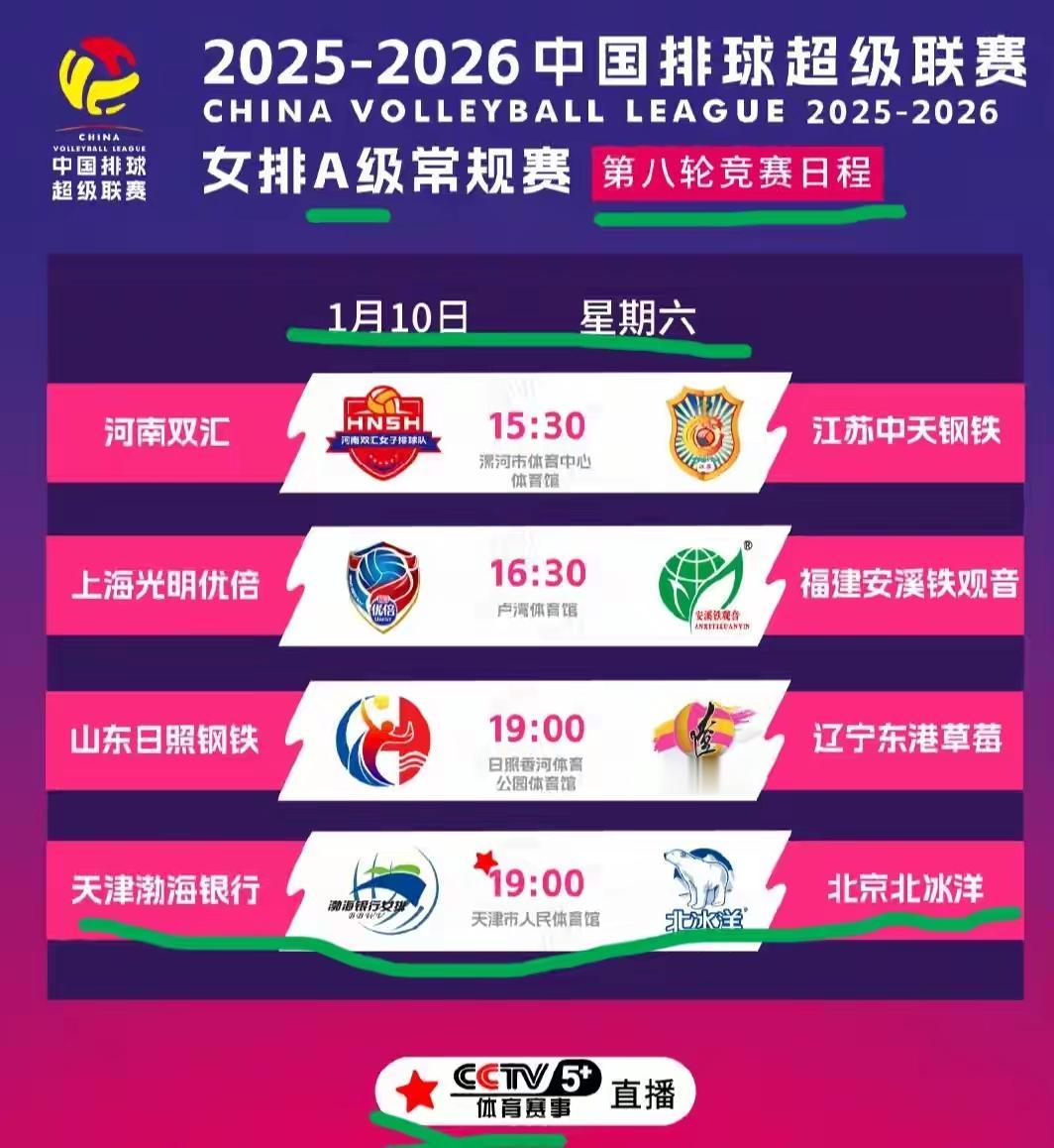 女排超级联赛下半程明日开打,主客场互换,比赛将会更精彩! 2025-2026女排超级联赛下半程,第八轮从1月10日开始。 1月10日 15:30 首场 河南汉汇(积5分)主场迎战江苏中天钢铁(积17分) 主客场轮迴,影响大吗? 双方首战,江苏队主场3:1(25-13;24-26;25-15;25-13)大胜河南队。 江苏队全华班,第七轮主力(自由人倪非凡除外)都得到休养生息! 替补阵容仍然3:1大胜福建队。 河南队坐拥主场优势,又有双外援,并且队员身材高大,韧性足。 所以,七轮比赛后,各队经过磨合、配合,积累了经验,技术水平都有长进。 女排超级联赛总决赛,下半程比赛会更精彩! 1月10日 19:00 央视直播积分相近津京两队比赛 天津渤海银行(积15分)Vs北京北冰洋(积12分)