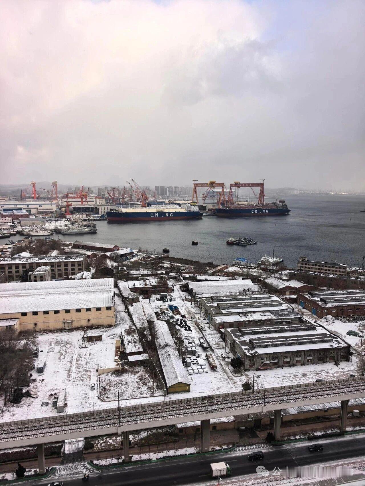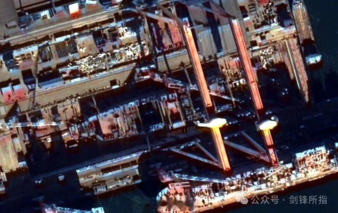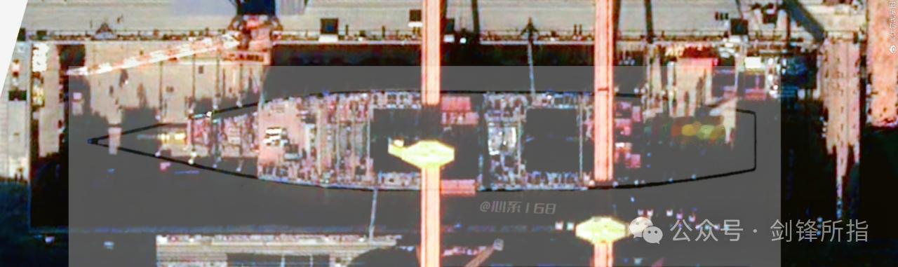 大连干船坞里的“大家伙”果然进展神速,除了球鼻艏外,舰艏部分大部分到位,不过舰艉那一段显然还有一段距离,另外干船坞边上原先出现的几个疑似艉部的分段(吊车与大棚之间摆放的那几块),确实不见了踪影,说明已经放进去了,但是长度不够,显然不是整个舰艉部分的。