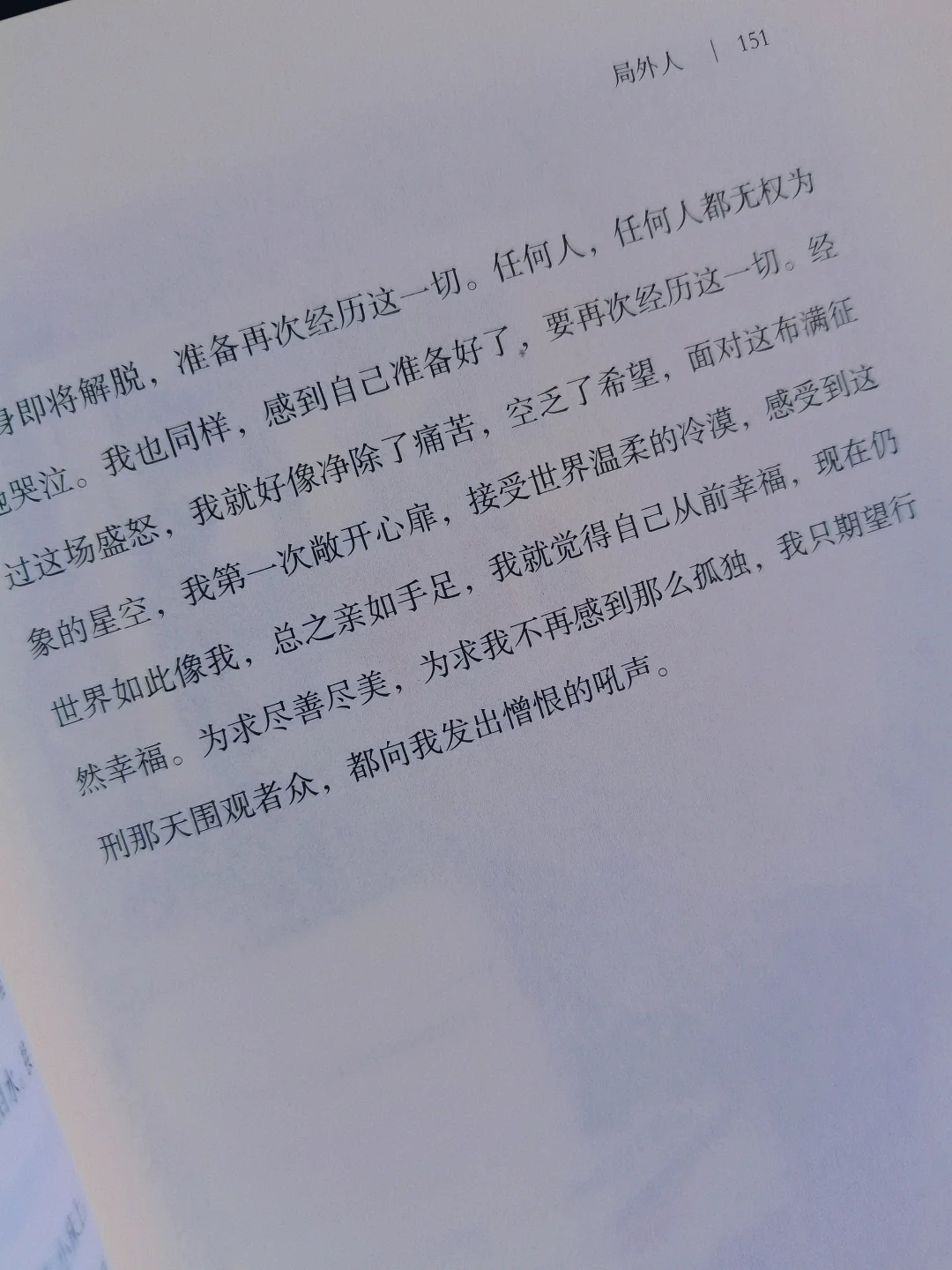 这本书是我的加缪入门作,从年少不懂默尔索的冷漠,到如今狠狠共情。从母亲去世没哭,再到在庭审不愿假装忏悔,最后被判有罪。他只是忠于自己的感受,不肯演世俗的戏码。