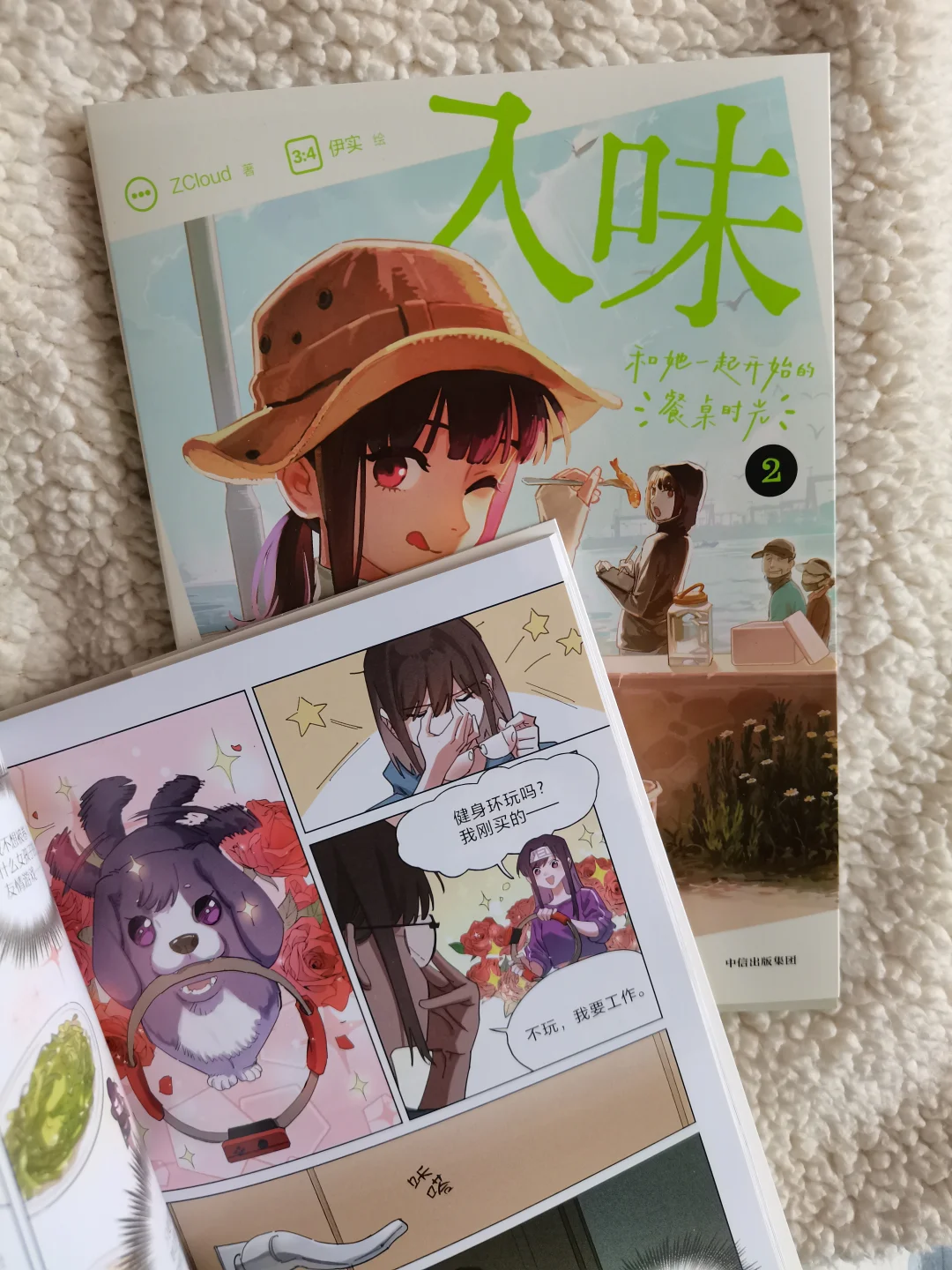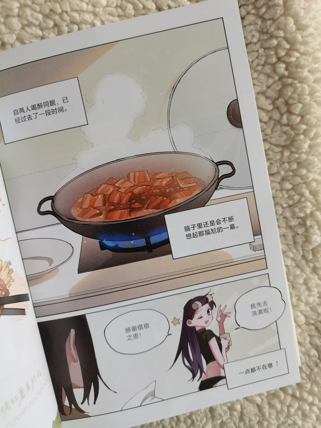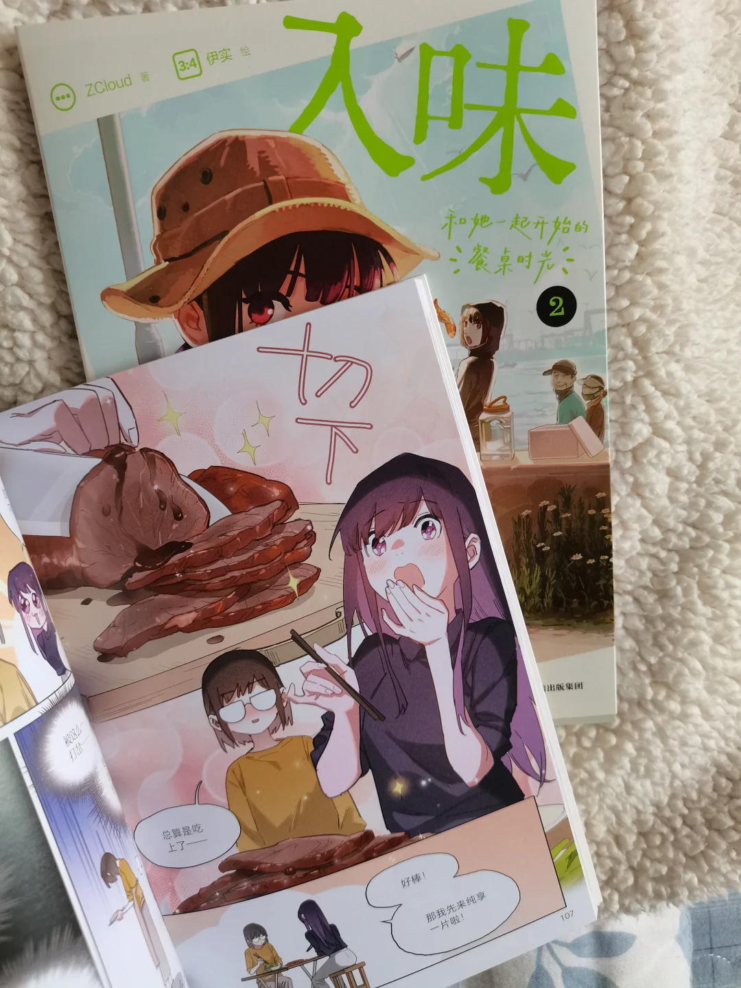两个女孩慢慢靠近,不经意的贴贴瞬间,配上清新活泼的画风,真的越看越上头~社畜治愈生活的秘诀,是美食和合拍的人呀!