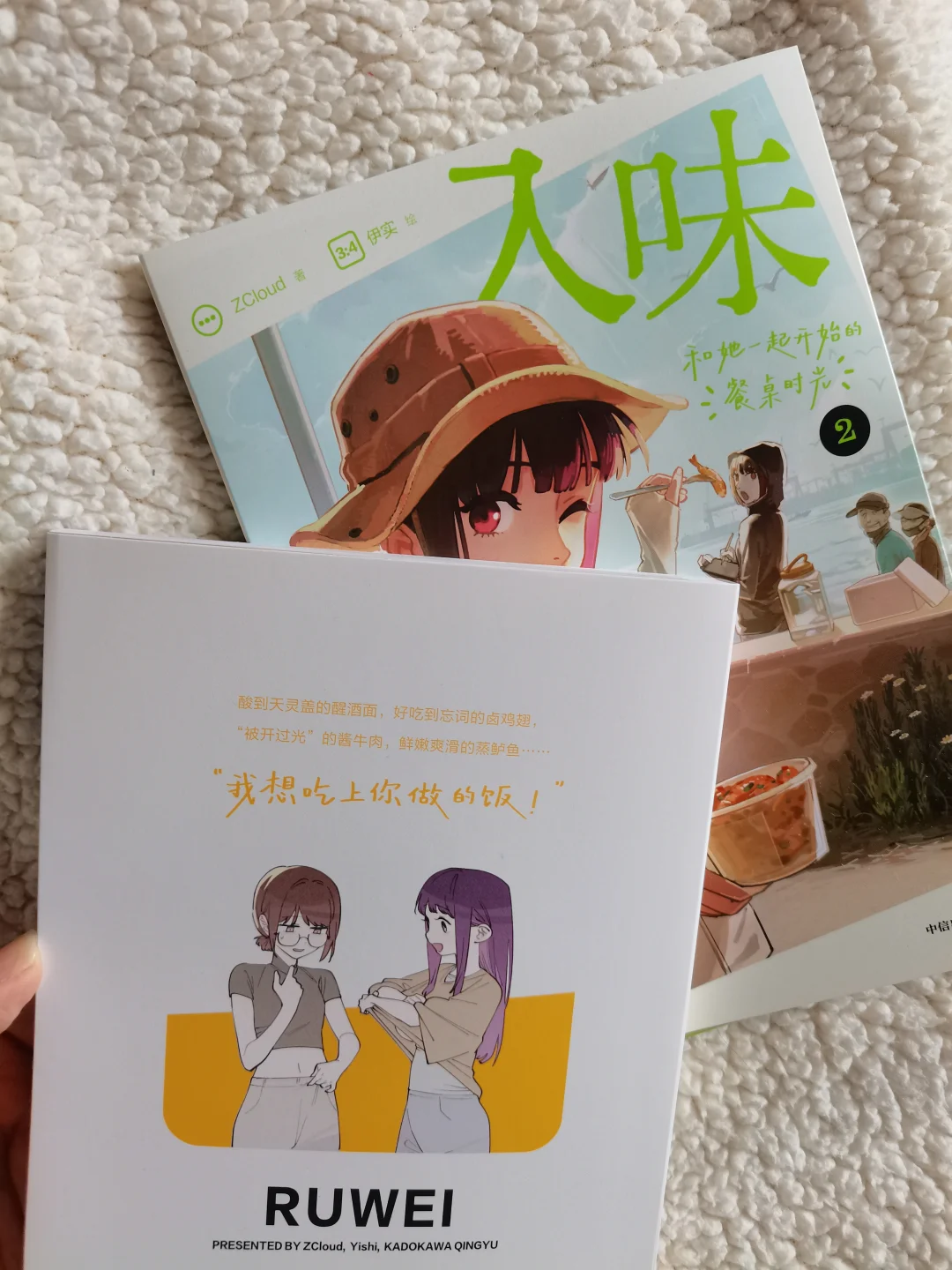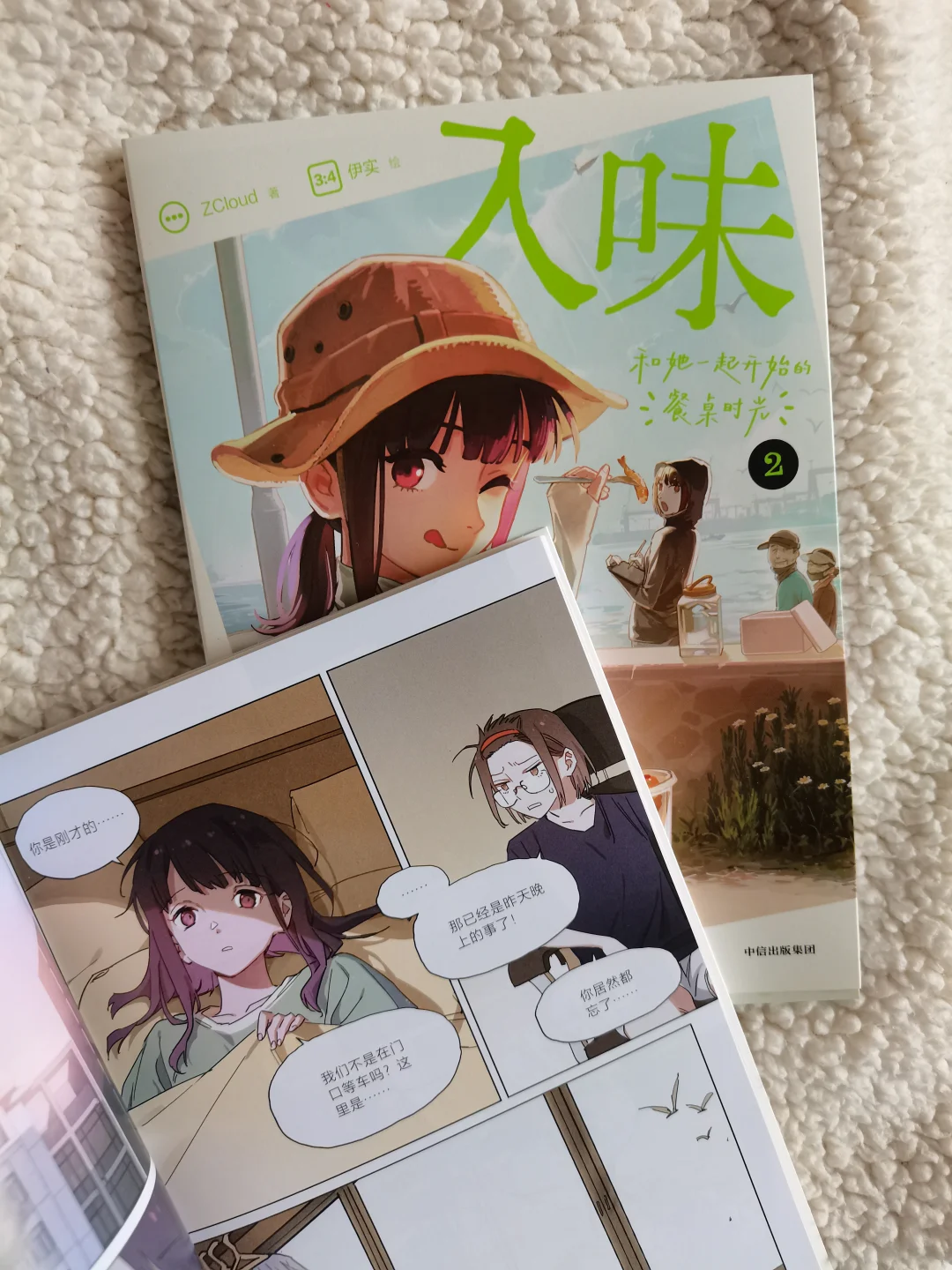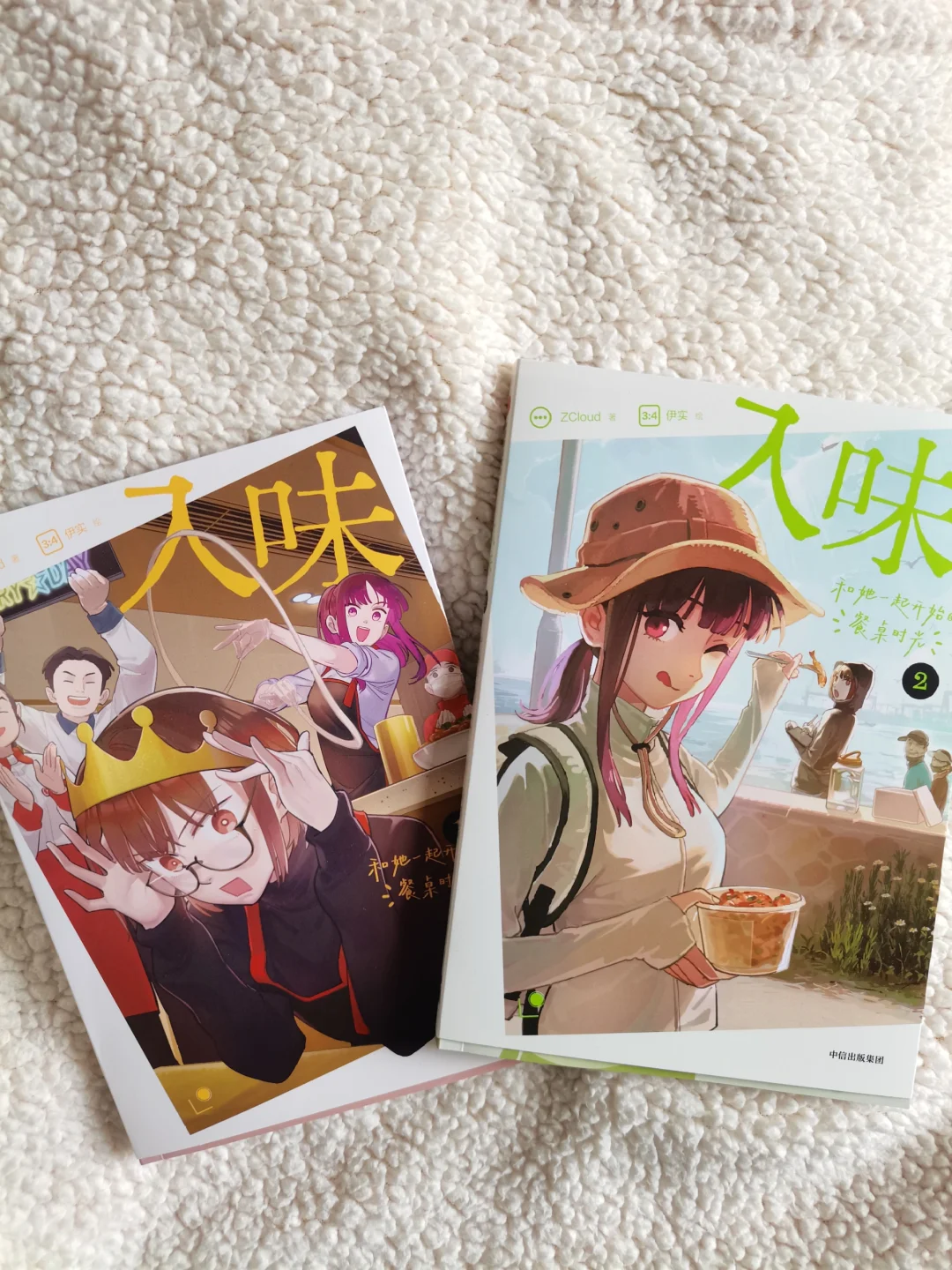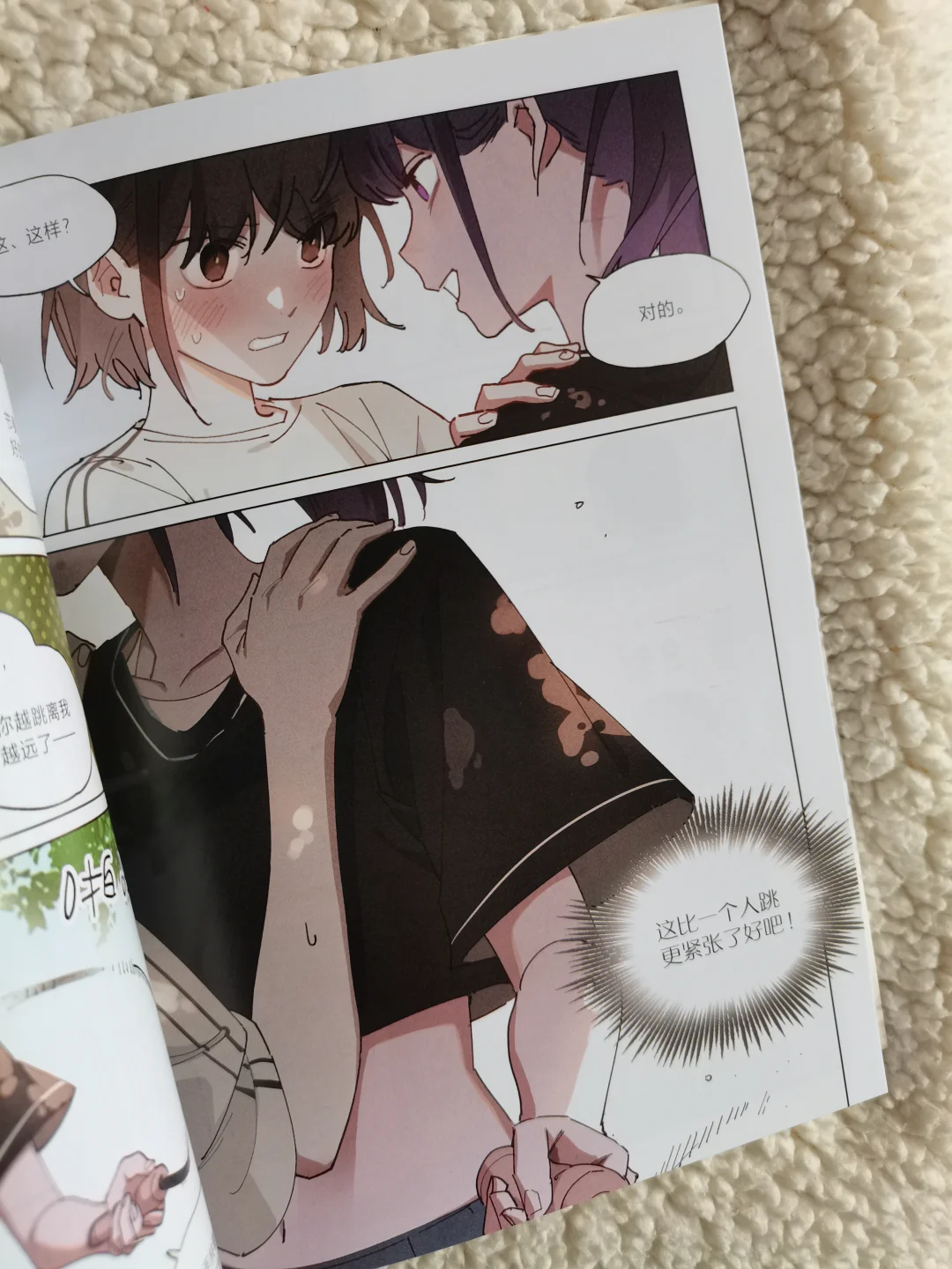 两个女孩慢慢靠近,不经意的贴贴瞬间,配上清新活泼的画风,真的越看越上头~社畜治愈生活的秘诀,是美食和合拍的人呀!