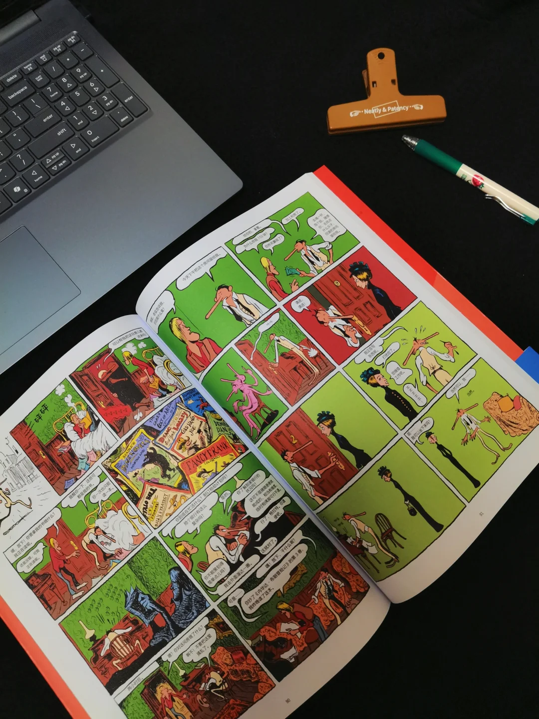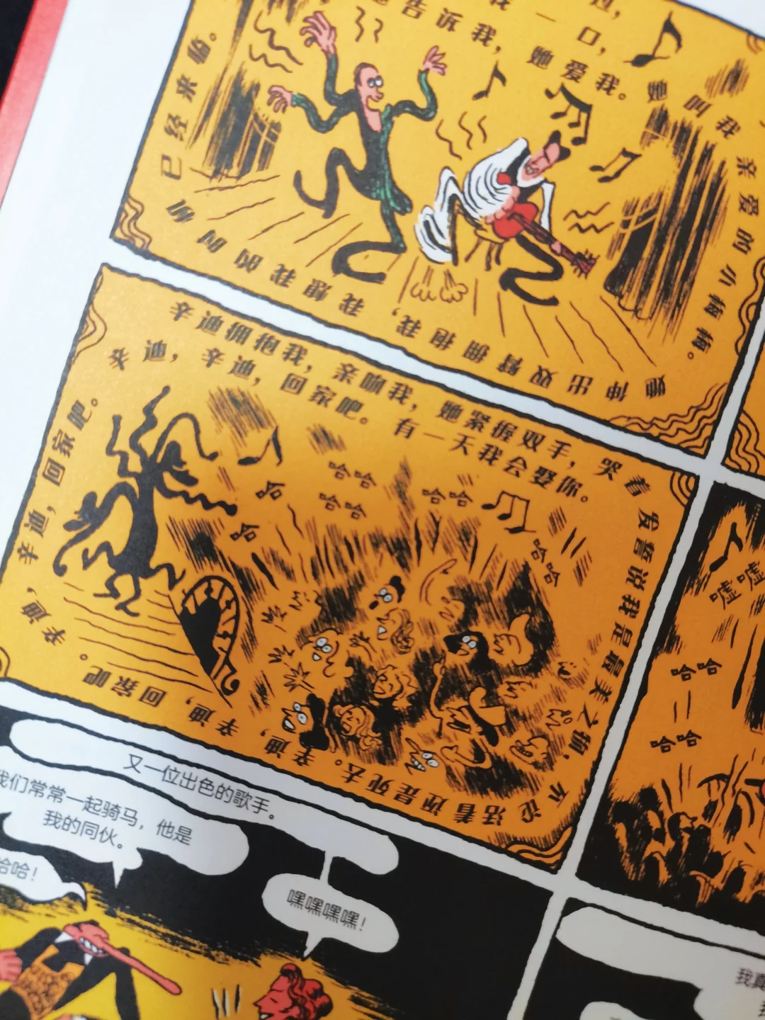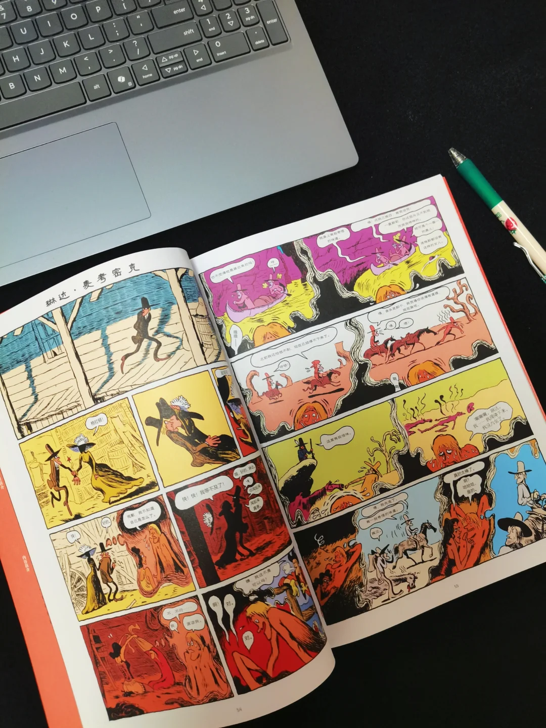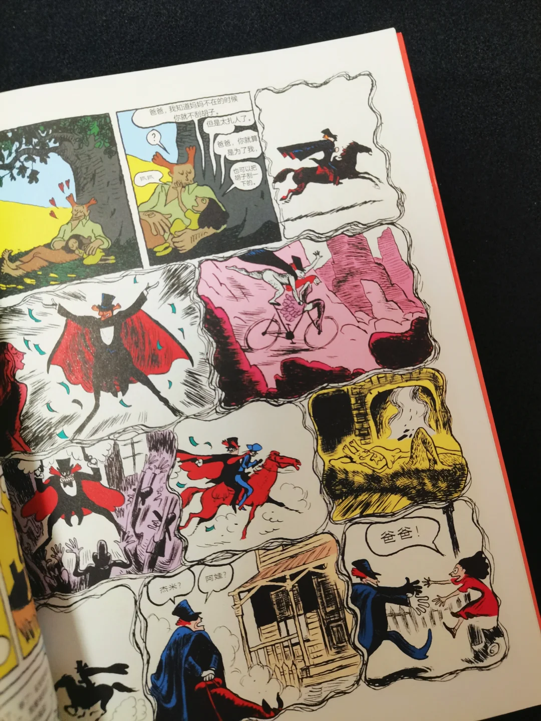 作为一本全彩漫画,采用了高饱和度颜色和黑色配色,视觉效果上满分。前一秒还是西部牛仔强盗抢劫时的粗犷,后一秒已经是坠入爱河的粉红浪漫。