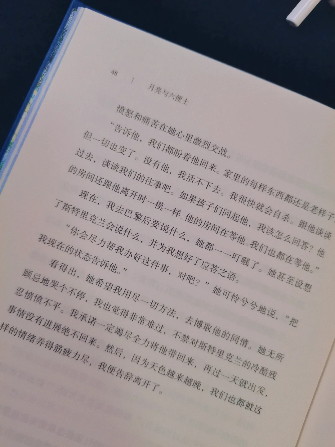 一个40岁的中年男人,明明有着事业和家庭,却突然抛下一切去追逐梦想。换在以前的我会觉得这样的男人是自私、是不负责、是失败者。而现在重读《月亮与六便士》后,才明白那句“我必须画画,就像溺水的人必须挣扎”是不甘平庸的反击。