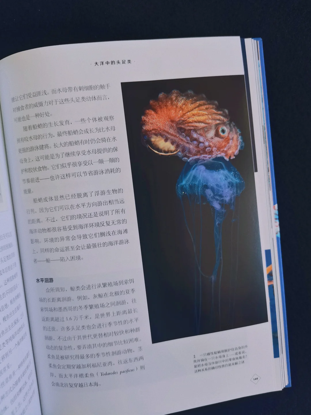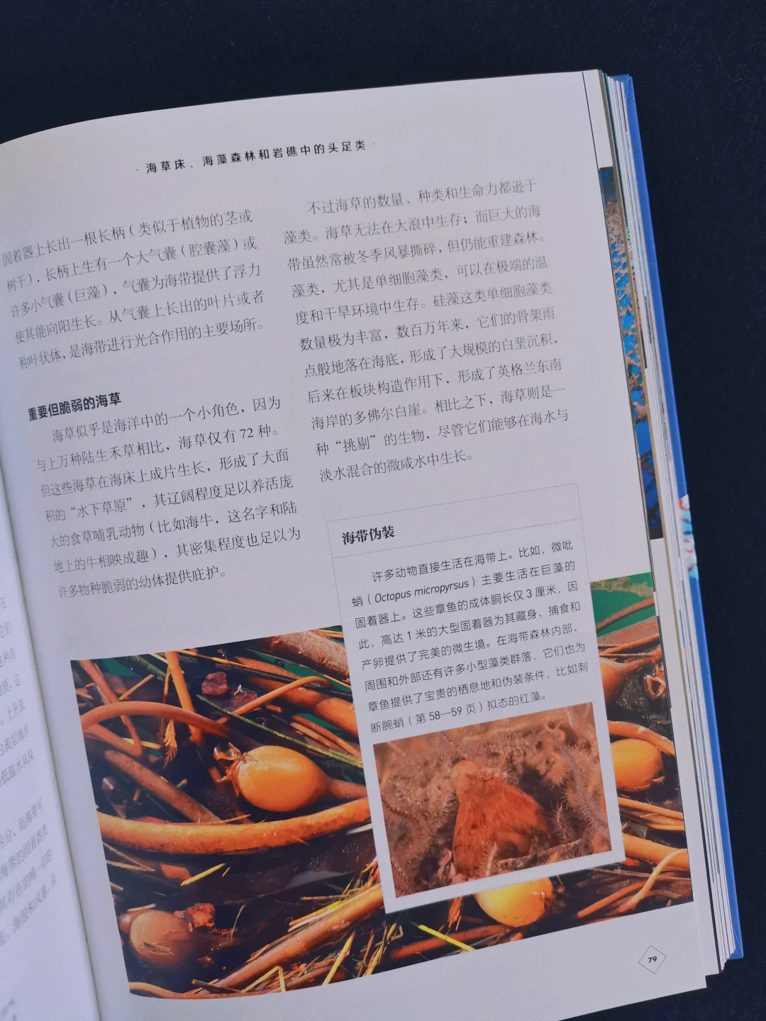 与其说这是一本章鱼科普,不如说是一本头足类动物的图鉴。从看似平坦安全的海滩、泥滩,到极地海洋,都有它们的身影。海岸浅水区的章鱼会钻进空椰子壳筑巢,深海的乌贼靠生物发光吸引猎物,极地章鱼因体内特殊的血蓝蛋白适应严寒,头足类动物真的是既能伪装,又适应力极强。
