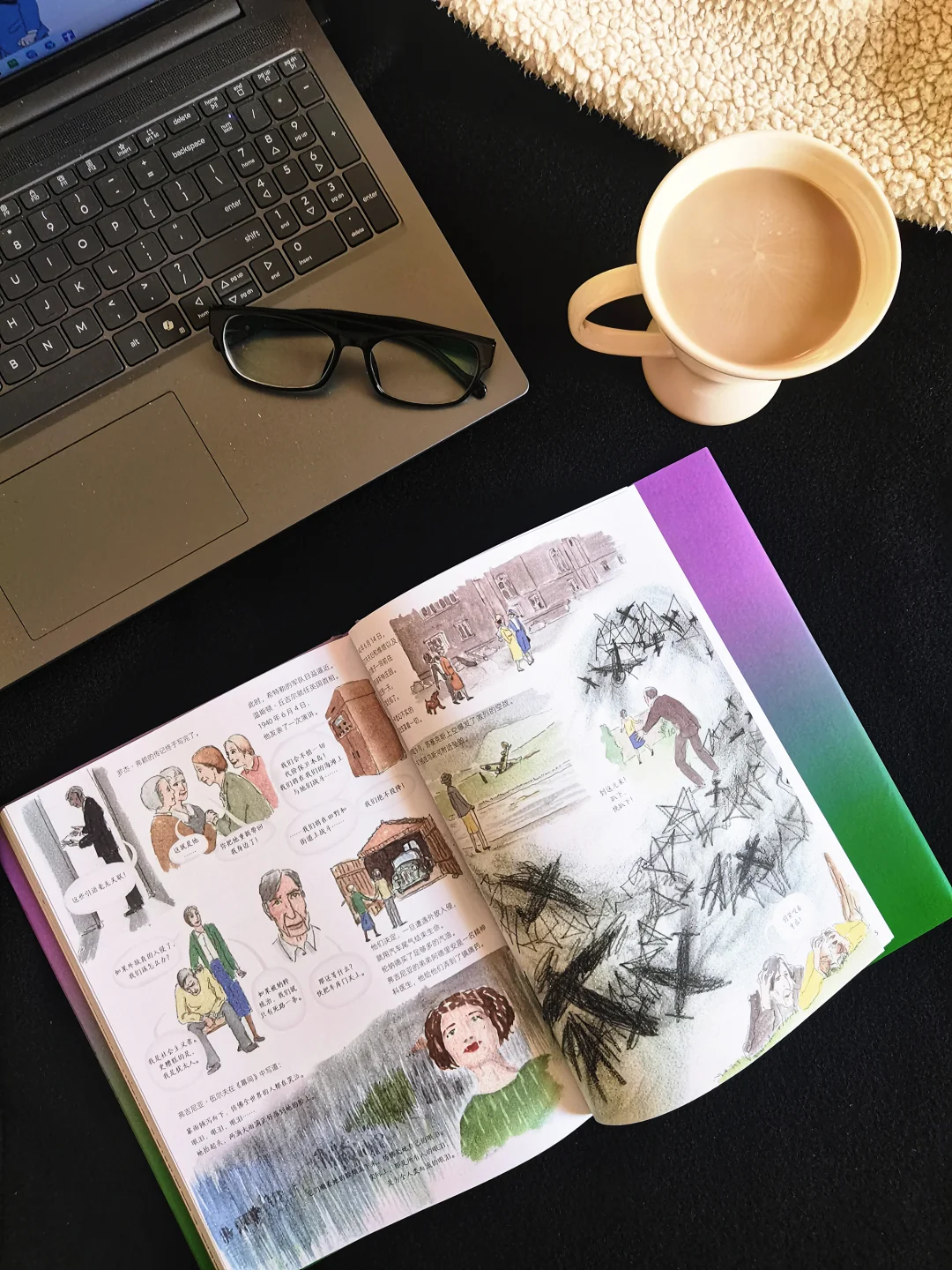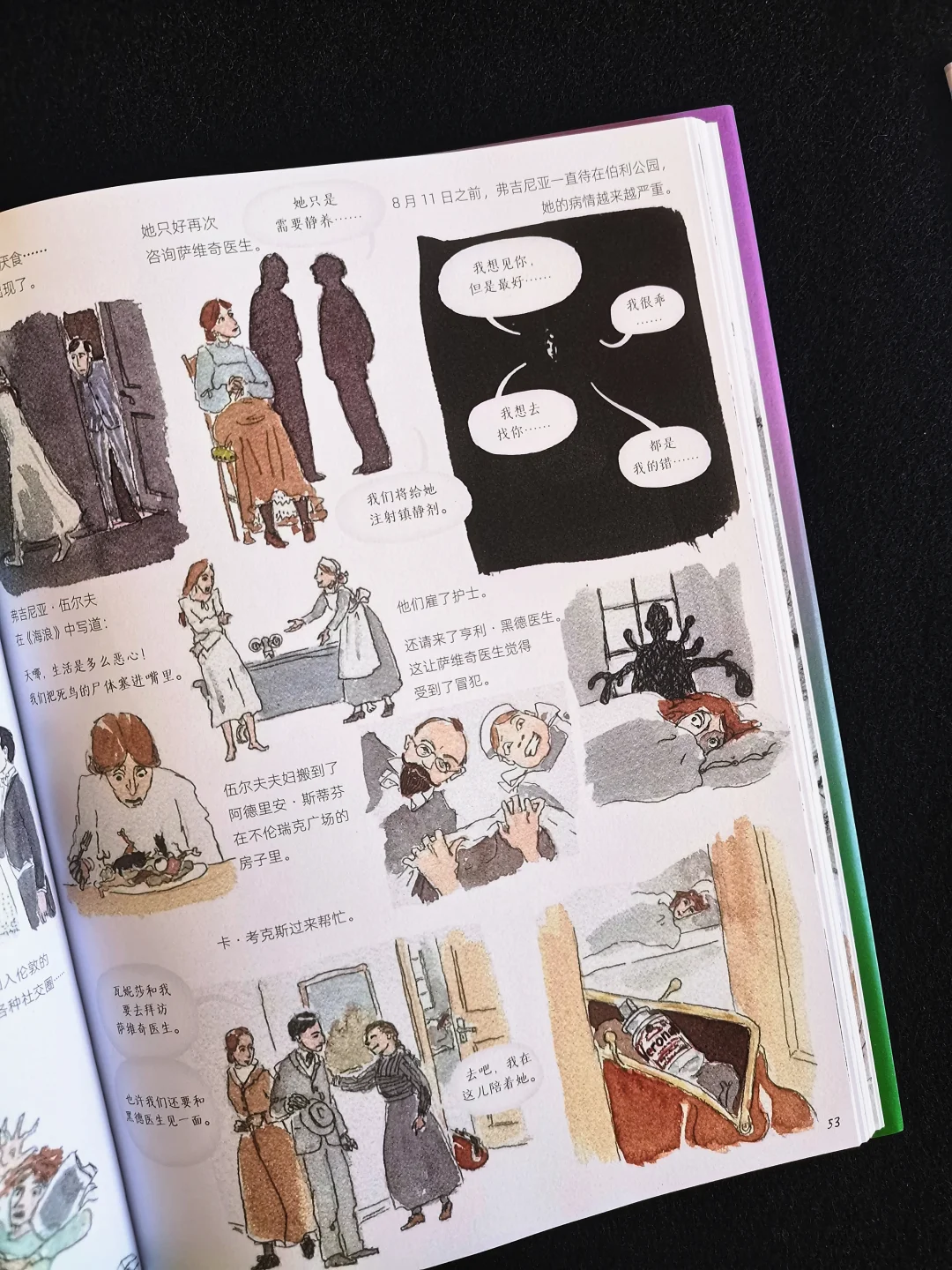 《我,弗吉尼亚·伍尔夫》这本图像传记,用水彩画的表达方式将伍尔夫的一生和她的作品连结在一起。水彩在画纸上晕染开来,就像伍尔夫创作的意识流文学作品一样,思绪是流动的,也是没有边界的。