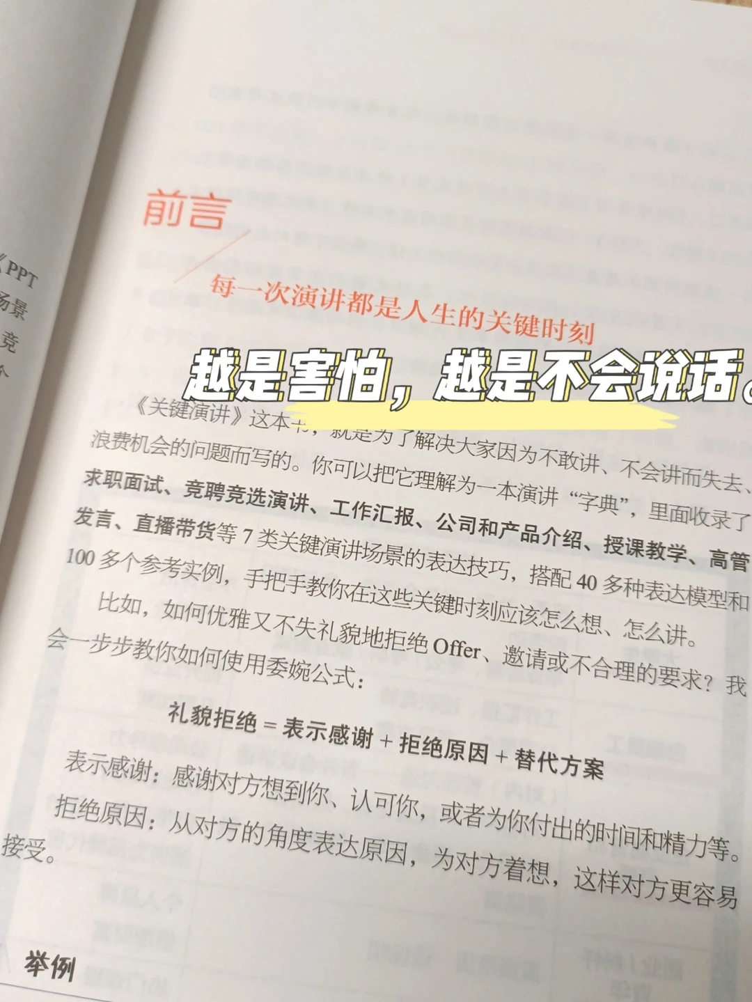🍀要怎样才能克服演讲困难,从而更好的度过人生当中的重要时刻呢?《关键演讲》一书通过100多个实用案例的拆解,为不善言辞、不懂语言思维的朋友送上了一份助力。