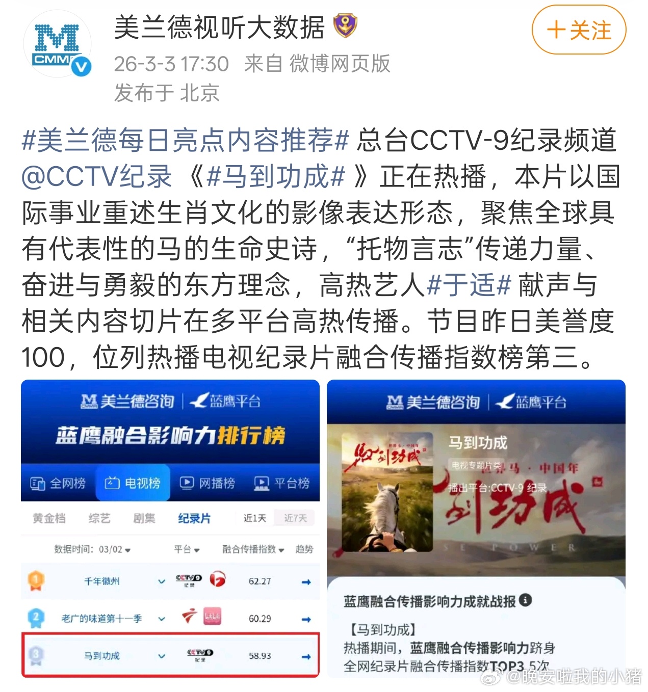 于适马到功成纪录片配音相关切片高热传播,美誉度满分,同系列影响力TOP3,怎么每一项都出类拔萃啊