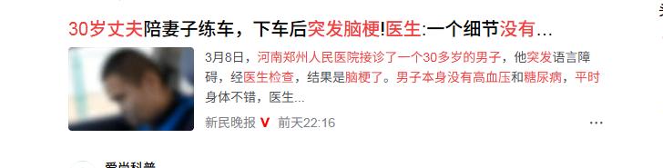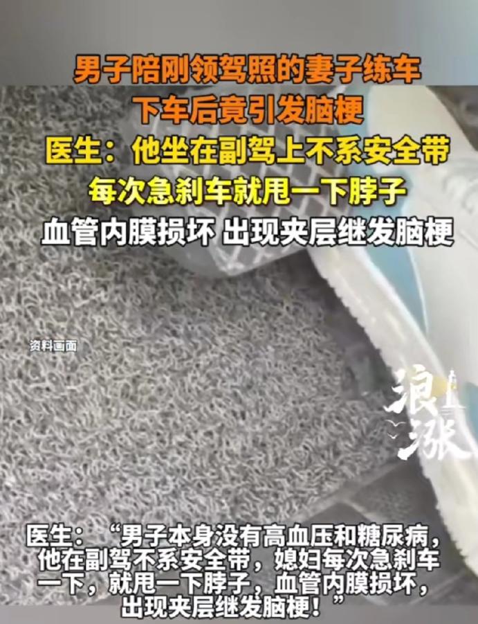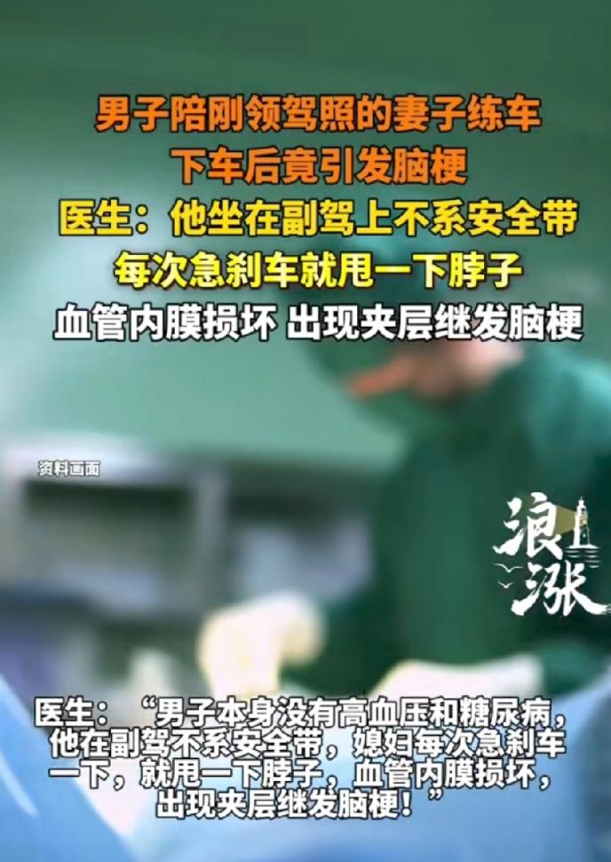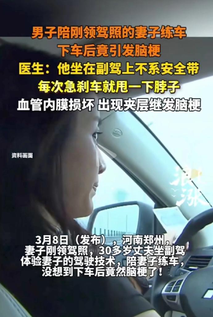 河南郑州,一名30岁男子突发脑梗去医院检查,可医生发现男子既没有高血压,也没有糖尿病,平时也没什么大问题,后来一番询问,发现这竟然和他坐在副驾指导妻子开车导致,网友:万万没想到! 2026年3月12日,郑州。谁也没想到,这个寻常的周四早晨,会以一种诡异的寂静收场。 在郑州某科技公司的办公室内,早会正开到一半。负责项目的年轻人正准备阐述下周的计划,他今年刚满30岁,一米七几的个头。在同事眼里,他是那种“身体里装了马达”的人,常年健身,不烟不酒。就在他张开口准备吐出第一个字的时候,世界仿佛在那一秒按下了静音键。 他愣住了,手还在半空中僵着,原本能说会道的嘴,此刻却像被水泥封死了一样。同事以为他在开玩笑,或是卡了壳,直到发现他眼神涣散,指着嘴巴发出模糊的嗬嗬声。整整十几秒,他像一个丢失了语言系统的木偶,在众目睽睽下陷入了彻底的荒原。 这场景让在座的所有人心里都毛了一下,赶紧把他抬上车,直奔最近的医院。急诊科的走廊里,医生拿着刚出炉的CT片子,眉头拧成了一个疙瘩。脑梗塞。这个通常和白发、轮椅、慢性病挂钩的词,此刻却被重重地扣在了一个年轻人的头上。医生也觉得不可思议。眼前这位男子,身体康健,既无高血压之困扰,亦无糖尿病之隐忧,就连常见的感冒发烧,于他而言也是鲜少发生之事。 年年体检表上都是整齐的合格,怎么可能在壮年期,大脑血管突然就“断了流”?医生没有急着下药,而是盯着那张影像看了很久。片子里,脑部的病灶并不像那种陈旧性的萎缩,更像是一场蓄谋已久的“突袭”。“最近脖子有没有受过伤?”医生的目光锐利,像是在废墟里寻找火种。年轻人此时已稍微恢复了一些意识,摇了摇头。“那你再仔细想想,最近一个星期,有没有让脖子经历过剧烈的晃动?” 这句话像是一把钥匙,瞬间撬开了他关于今年3月初那场“噩梦陪练”的回忆。 那是发生在大概一周前的一个周末下午,郑州开发区的路段,视野开阔,车流稀疏。他那位刚拿到驾照的妻子,软磨硬泡非要他上车“坐镇”,去实战演练一番。他见道路宽阔、车辆稀少,且一切皆在自己掌控之中,便心存侥幸,索性连安全带也未系上。那根平日里被视为生命线的带子,在那一刻成了他眼里“勒着不舒服”的累赘。 但他显然低估了一个新手在真实路况面前的恐慌,以及那种要把刹车踩进地心里的狠劲。妻子由于还没掌握好油门和刹车的脚感,车子一路上像是在跳“太空步”。每一次突如其来的急停,他都会由于惯性猛地往前俯冲,再被座椅生生拽回来。最惊险的一次,是马路中央突然蹿出一条野狗。 妻子出于本能,一脚踩死了刹车。他的头毫无预警地弹了出去,脖子发出“咔”的一声脆响,整个人像被无形的皮鞭抽了一下。 当时虽然有点疼,他揉了揉后也就没往心里去,毕竟年轻人,谁还没磕碰过?那一个下午,这种足以让颈椎颤抖的急刹车,他经历了不下十次。医生听完他的叙述,心里那个缺失的闭环终于扣上了。 罪魁祸首不是基因,也不是三高,而是医学上一个隐秘的杀手:颈动脉夹层。脖子是人体最纤细的走廊,几条支撑大脑生命线的血管,其实比想象中脆弱。在那场剧烈的“甩鞭样损伤”里,强大的瞬间张力犹如一把利刃,无情地在血管内膜上撕开一道口子。血液像是找到了旁门左道,顺着裂缝灌了进去。 这就像是一个正在充气的小气球,在血管壁里缓慢地鼓胀,形成了一个血栓。在随后的一个星期里,这个隐形的炸弹就在他身体里静默倒数。直到3月12日那个早晨,血栓脱落,顺着血流直冲脑部,死死地卡住了供血管道。平日里保护我们的副驾驶安全带,在这场意外里成了被遗忘的护身符。 太多人觉得在宽阔马路上慢悠悠练车不需要防护,却忘了动能和惯性的冷酷。安全带的作用不只是应对碰撞,它更是这种微小、高频、致命晃动的减震器。如果你觉得坐姿随意、不系带子是在放松,那本质上是在把血管架在火上烤。尤其是对那些新手司机的家属来说,副驾驶绝对不是一个可以掉以轻心的看台。当你在指导别人如何掌控方向盘时,你自己其实正处于最无法防御的力学陷阱中。 我们要重新认识“安全”这两个字的边界。它不该只是写在交规里的几行字,而是印在骨子里的自我保护本能。只要车轮在滚动,无论车速是二十迈还是八十迈,安全带必须锁死。那种自以为是的“舒服”和“方便”,在病魔敲门的时候,甚至换不回十几秒的求救声。尤其是对于家庭陪练这个特定场景,副驾驶的防护等级应该被提到最高级。 愿这次发生在郑州的教训,能真正勒紧每个人胸前的那根带子。因为生命只有一次,它比你想象中强壮,但也比你想象中更易碎。下次坐上副驾,无论你是老司机还是指点江山的“教练”,请先听到那一扣锁上的声音。 那才是这世界上,最动听的安全保证。
