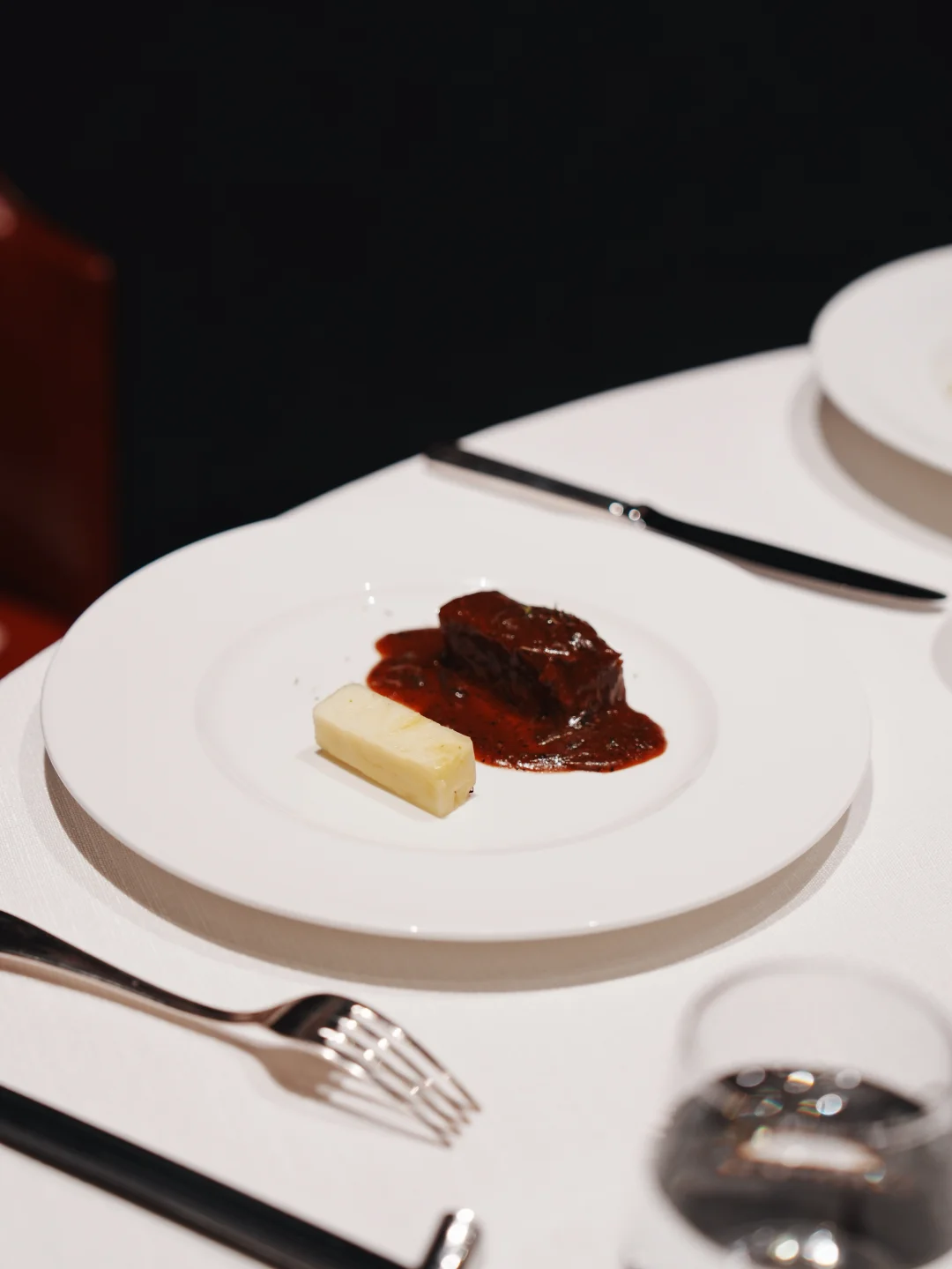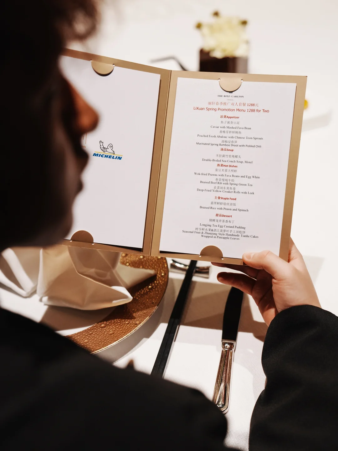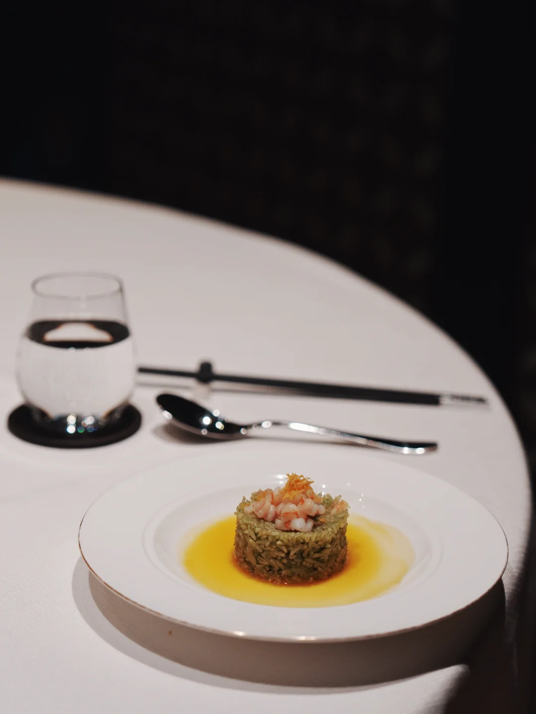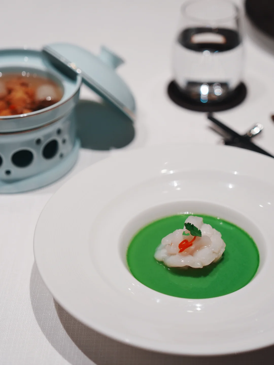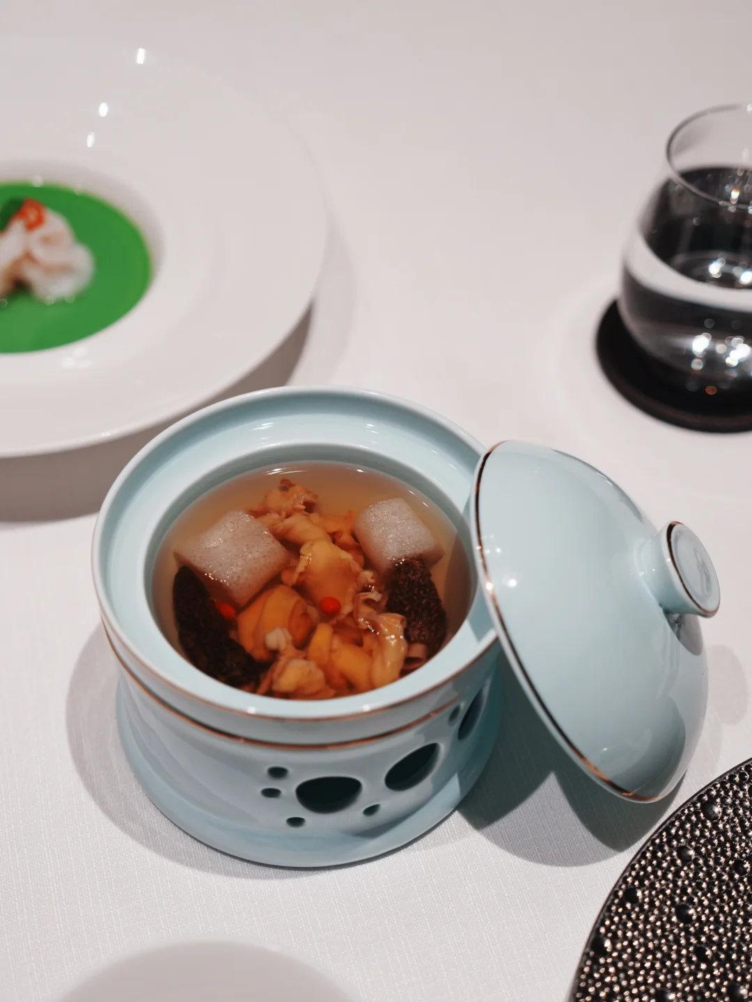 汤是羊肚菌竹笙炖螺头,清亮鲜甜。主菜的春茶慢炖牛肋最惊艳——牛肉炖到软糯,酱汁里透着淡淡茶香。蚕豆芙蓉大明虾也好,虾肉紧实,底下蚕豆泥绵密。