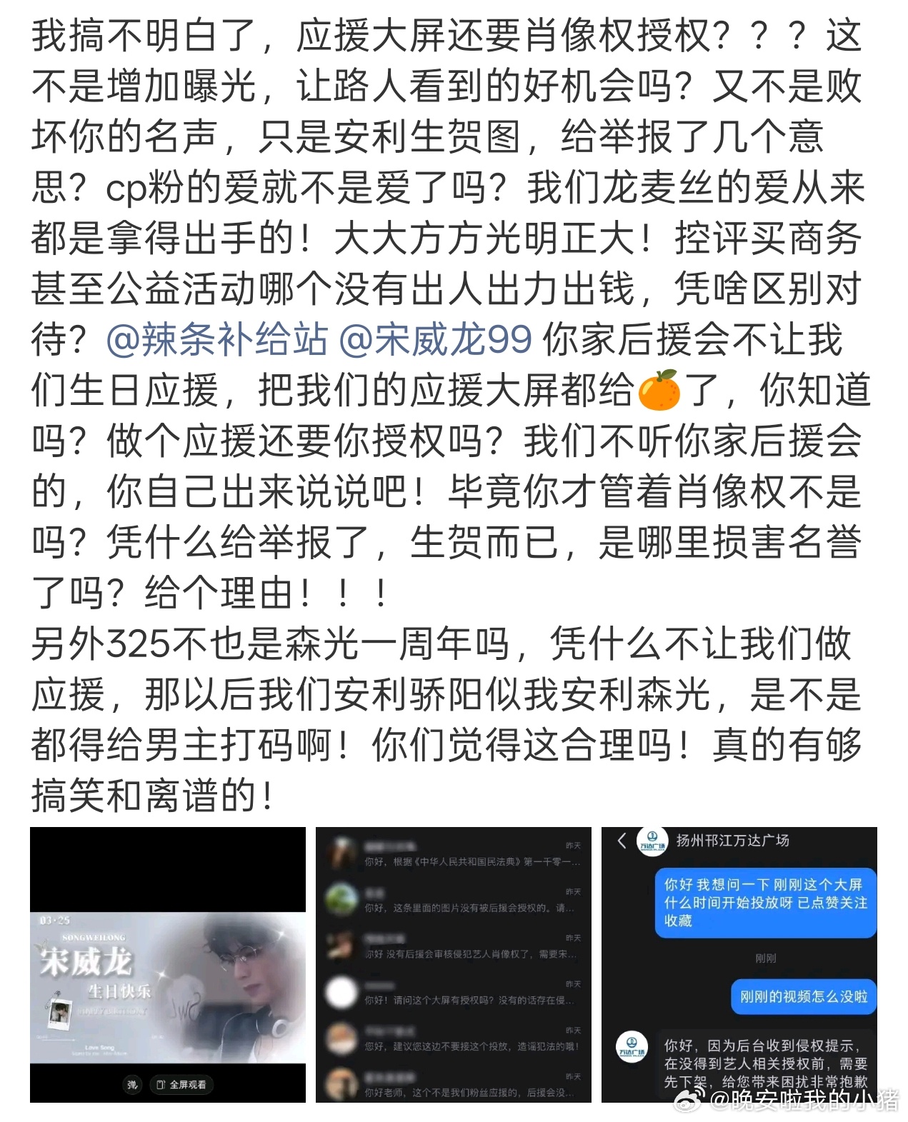 龙麦cpf因为给宋威龙做的生日应援大屏没有授权而被下架并艾特本人要一个解释,325什么时候变成了森光一周年纪念日了