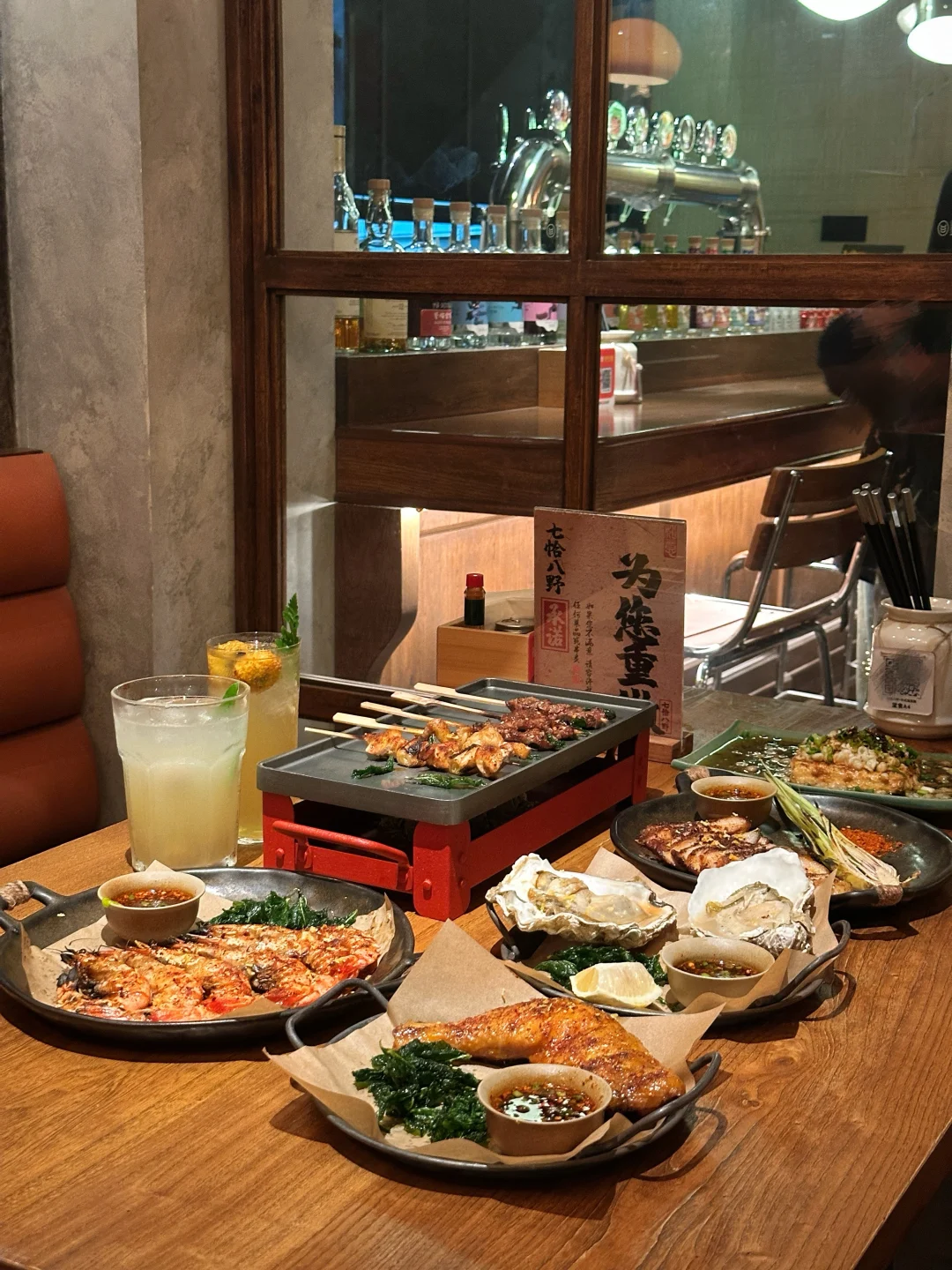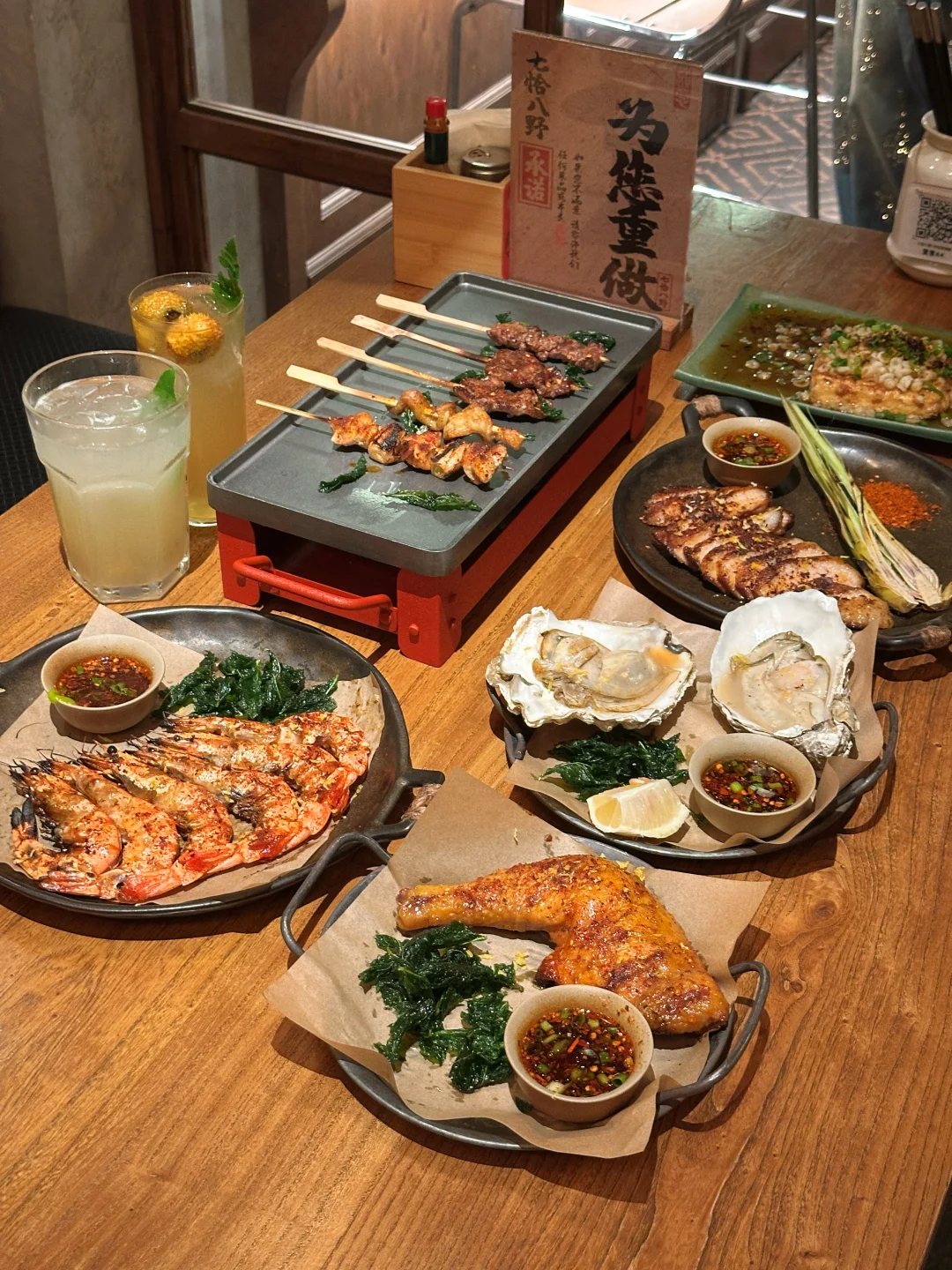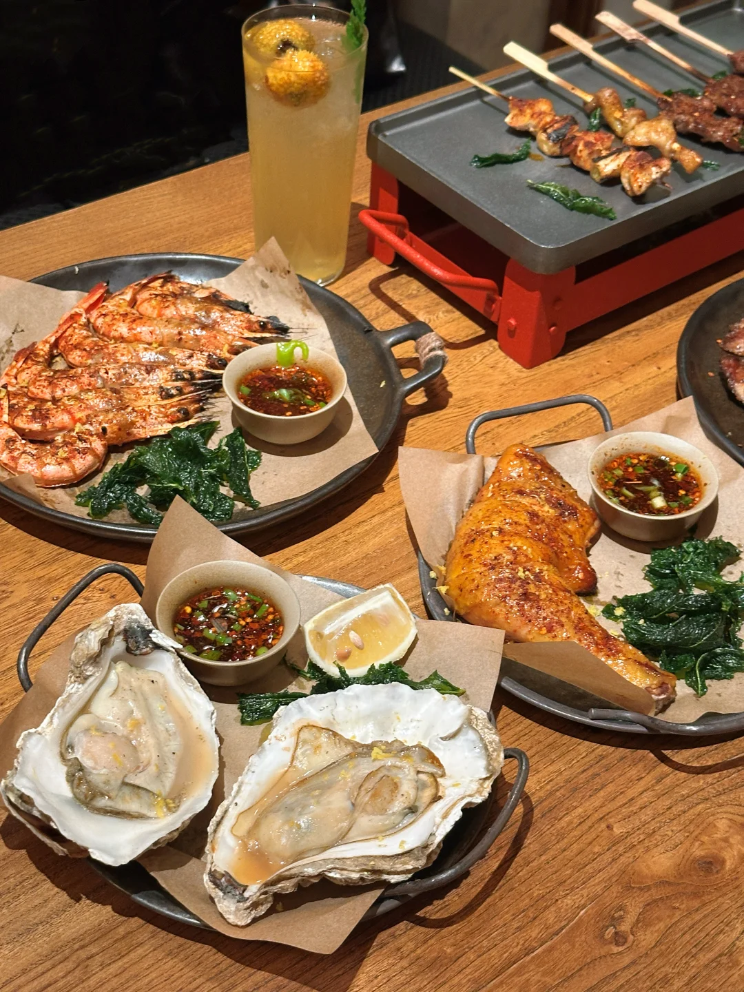 食材都是现点现烤,保留着本味,是吃得出的新鲜👌我们还点了刺梨冰茶和茉莉油柑冰茶,清爽解腻,刚好中和炭烤的浓郁,喝一口又觉得还能再战两串🍹
