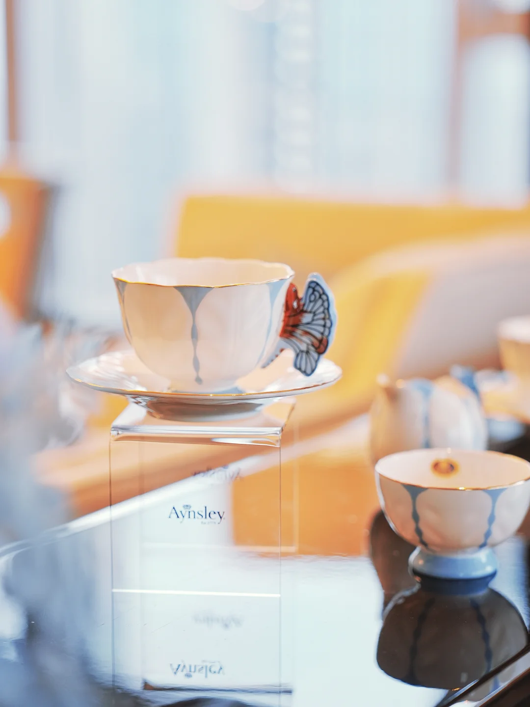 Aynsley这个牌子懂瓷器的人都认识,英国皇室御用,每一件都是手工描金。这次联名茶具用的是经典的“老镇玫瑰”系列,粉色花绘配描金边,放在阳光下特别好看。