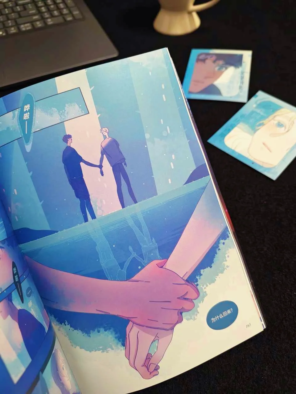 蓝调贯穿了整部漫画,像湖里的水,安静又治愈。他们在蓝色的湖畔里重逢,慢慢靠近,一切都被这股温柔的蓝包裹着,时间都变慢了。