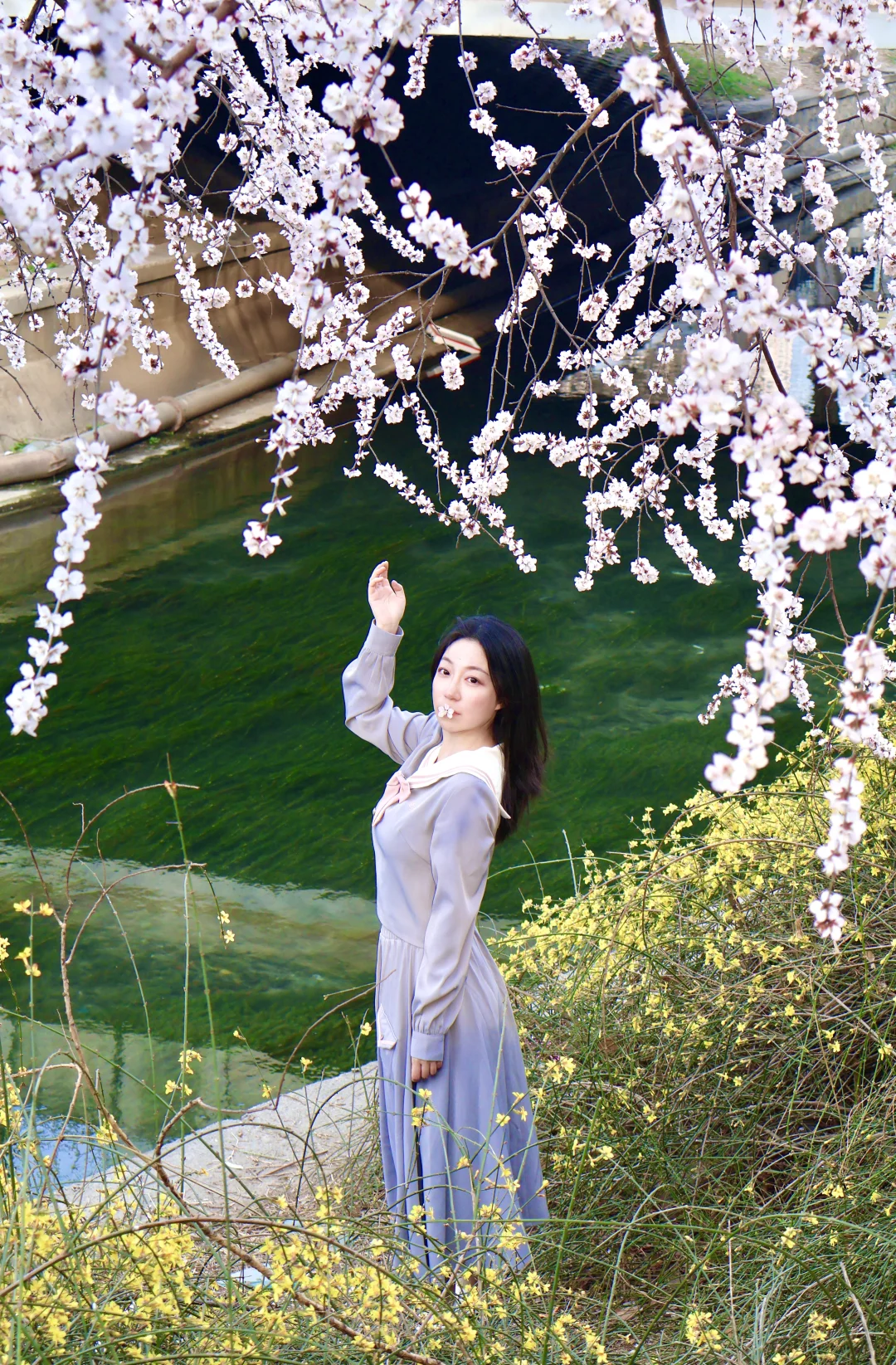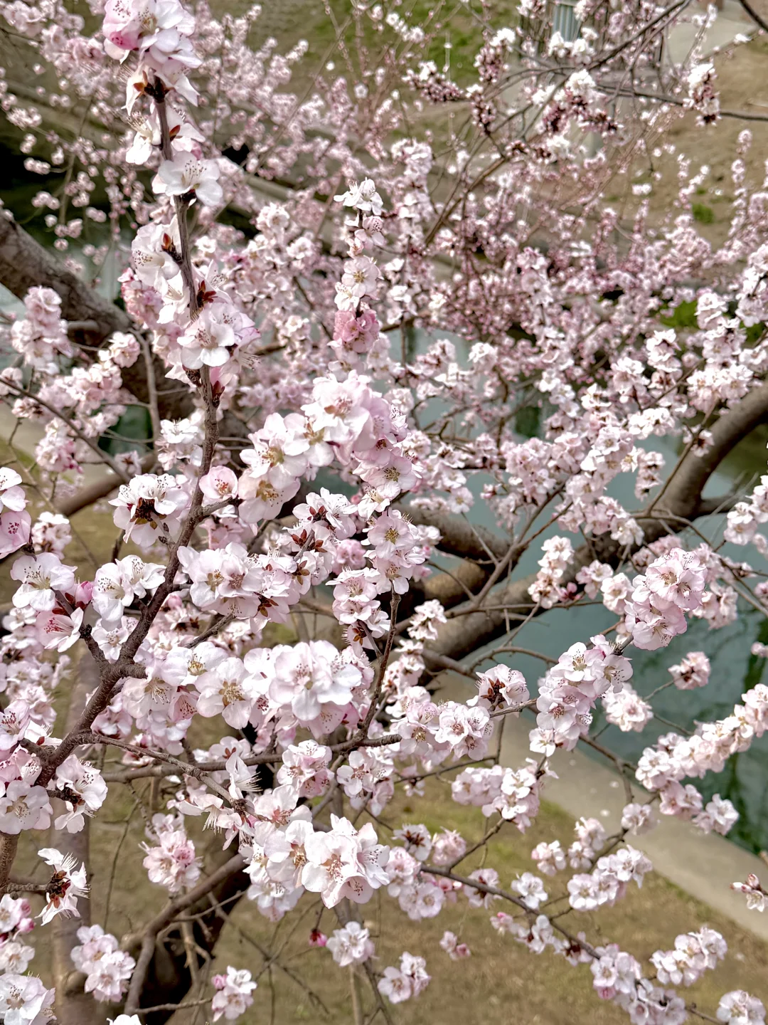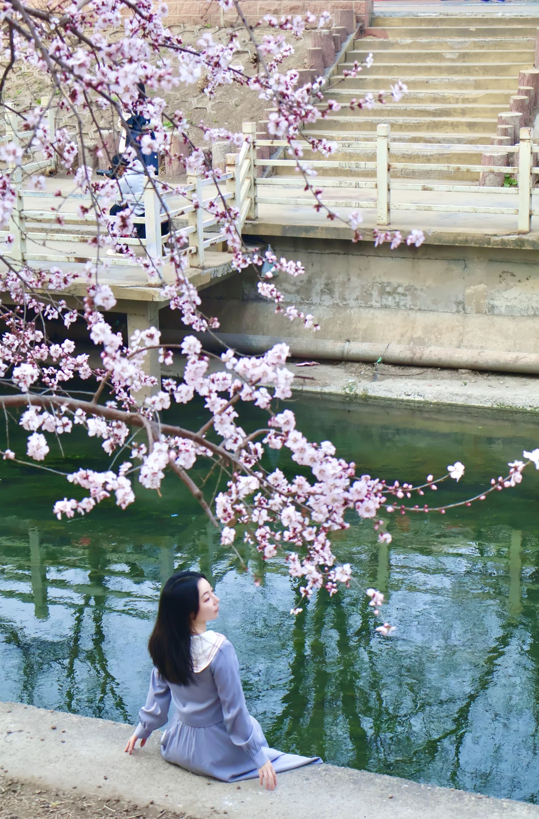 ❷溪水映花俯拍:走到亲水平台,从上往下拍,桃花倒影+流水,意境拉满